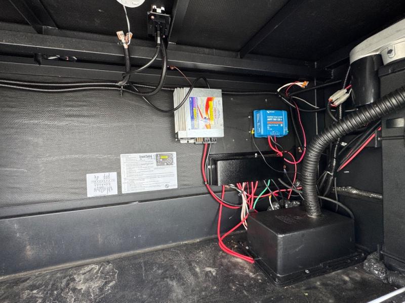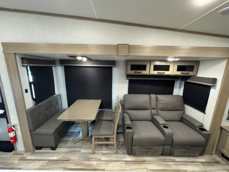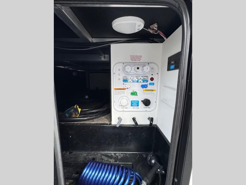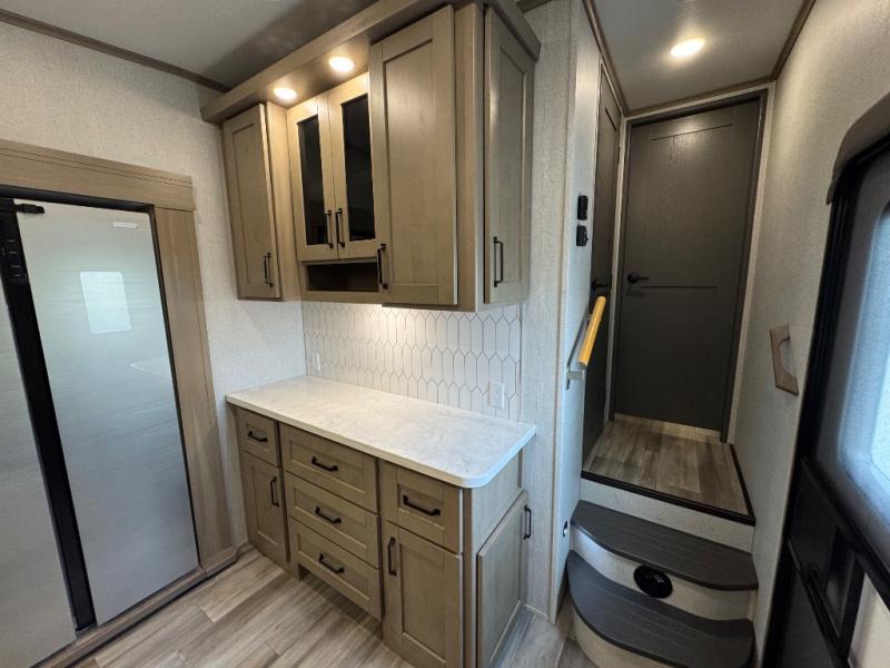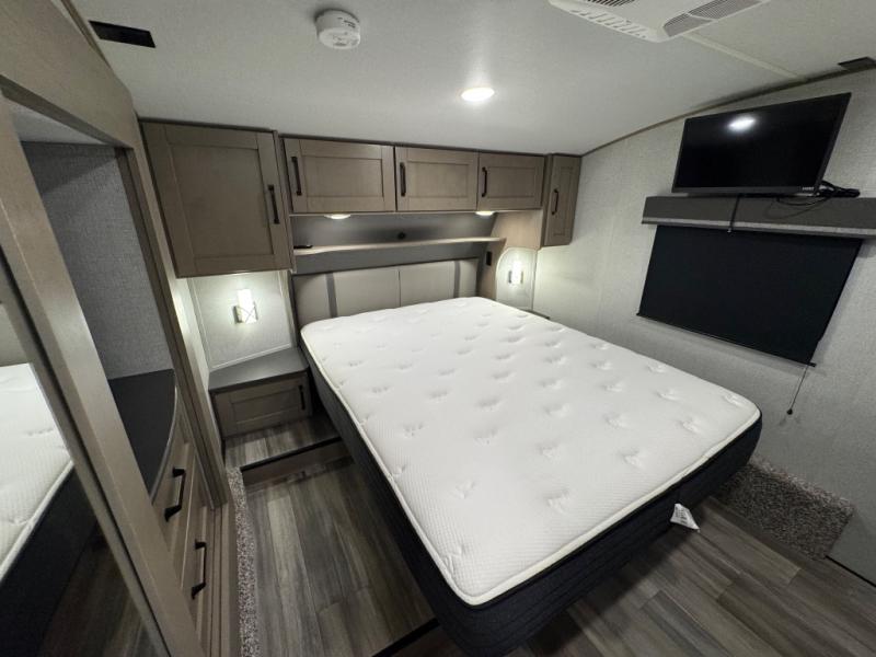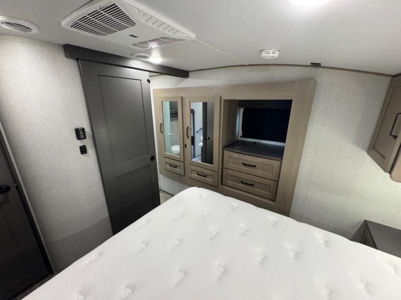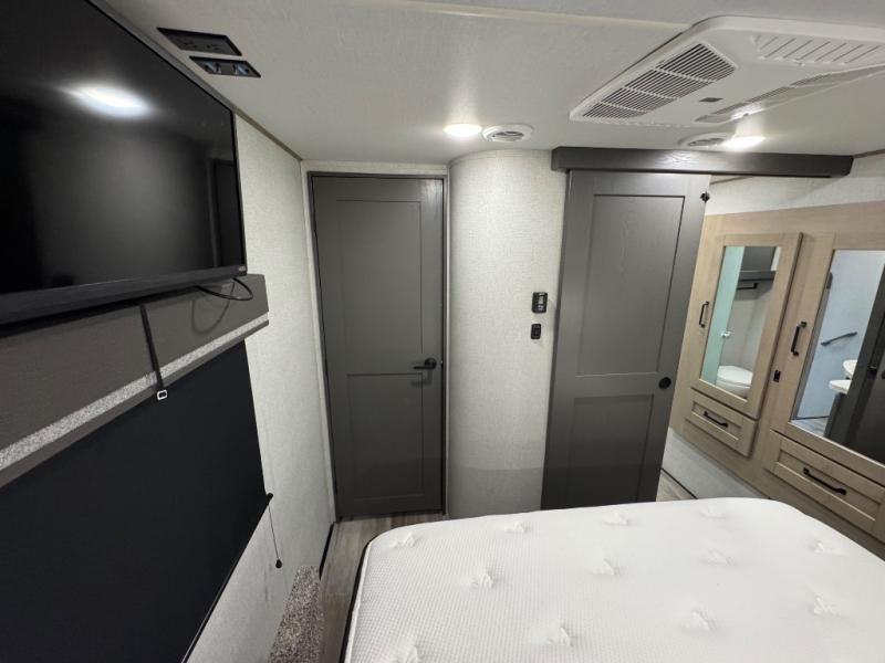 Whether you travel for pleasure or work, you will love the spacious main living and kitchen area with a rear tri-fold sofa that doubles as extra sleeping space, and the theatre seating directly across from the entertainment center with a 40" LED HDTV and a fireplace below. The kitchen island will make meal prepping and drying the dishes easier and the hutch is the perfect place to place your picture frames, nice dishes, and extra cooking items. There is even a pantry that is big enough to store all of your favorite snacks, dry ingredients and such. Outside you can enjoy two electric awnings that provide protection from the elements as you relax and visit with other RVers, and your camping chairs can easily be stored in the pass-through compartment. The double entry bathroom is convenient especially at night when you can slide the door to enter from the front master bedroom. You will find plenty of storage for your clothing and gear, plus the bedroom slide out gives you drawers and linen storage that stretches into the full bathroom.