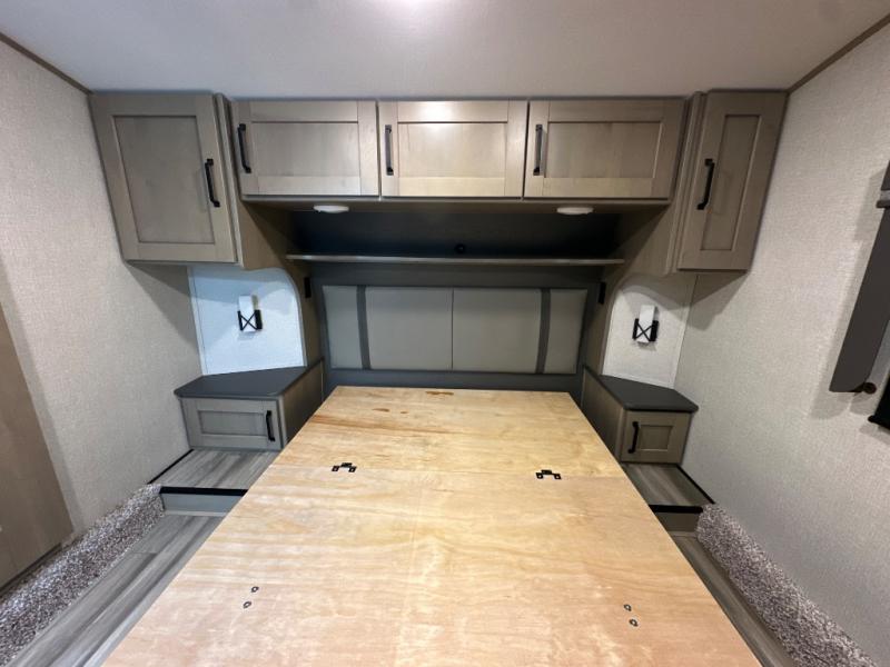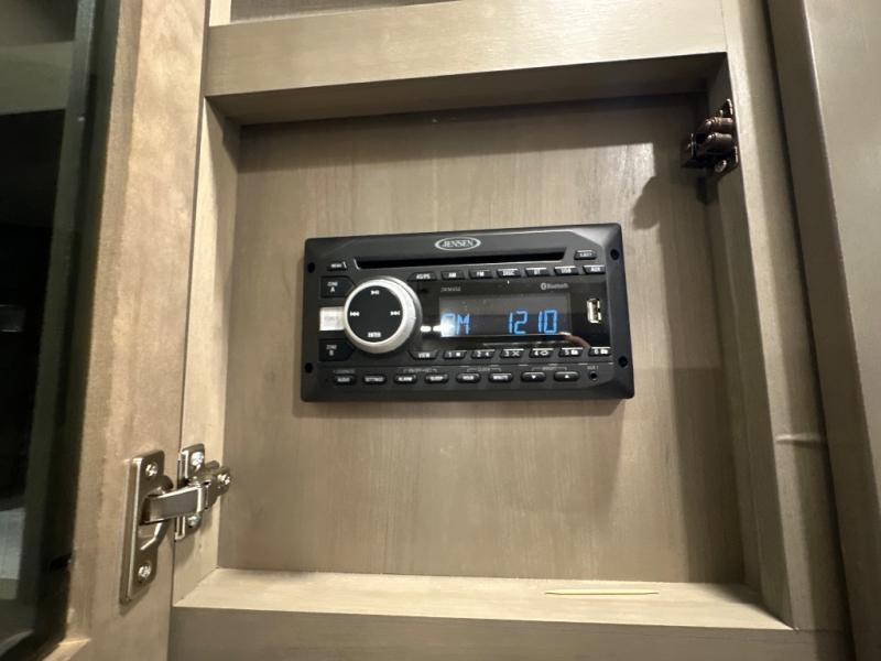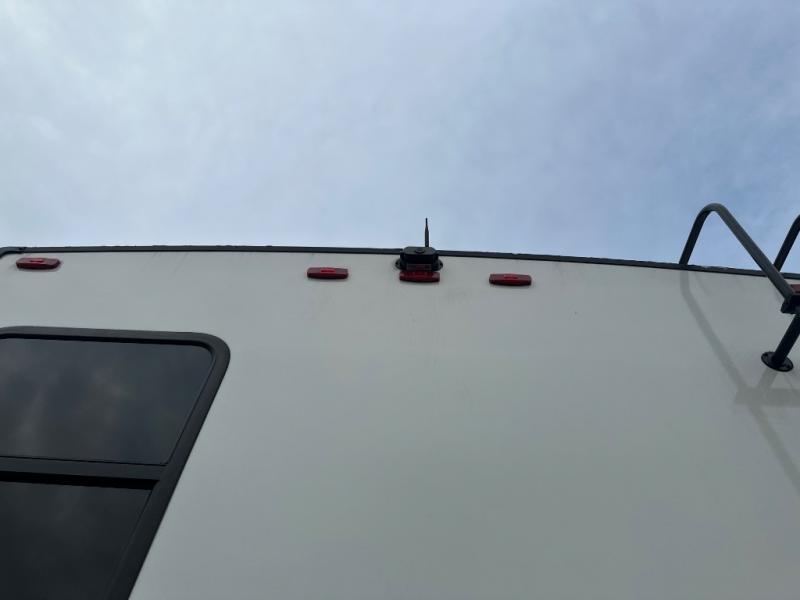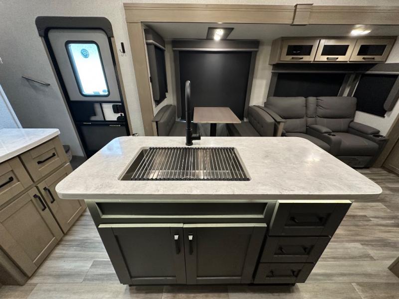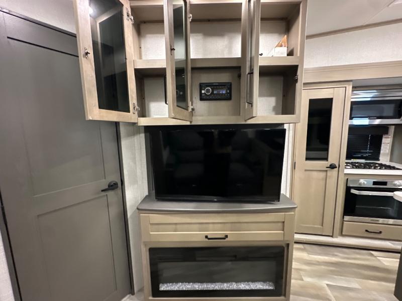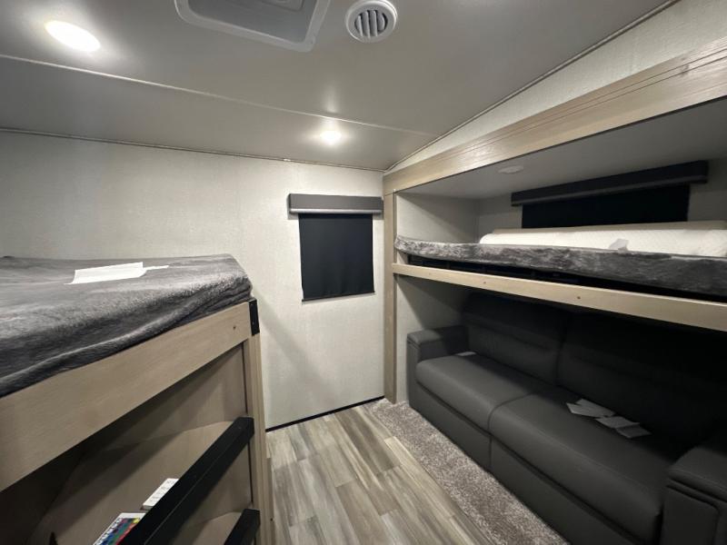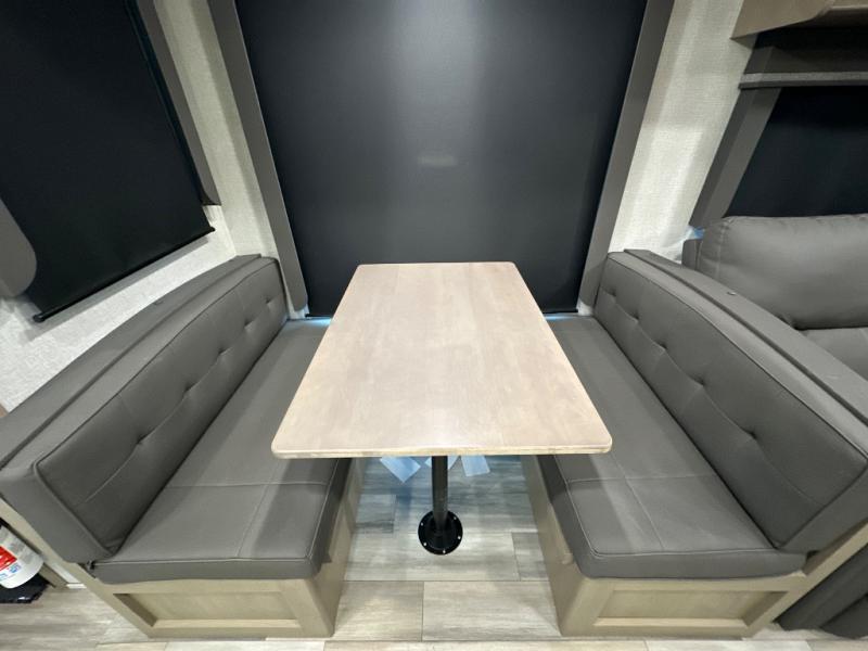 Are you looking to travel with your family and friends and want enough space for everyone to be comfortable? Step inside using the AXIStep, to find a private bunkhouse in the rear of this fifth wheel which offers a slide out flip bunk above a tri-fold sofa, a bunk bed and storage on the opposite side, its very own private half bathroom. The theater seating or tri-fold sofa option is a great place to unwind at night in front of the entertainment center with a 40" LED HDTV and fireplace below it. There is a booth dinette or you can choose a free standing dinette option to dine at, and the kitchen island will provide more counter space to prep meals. You will find full amenities including a 16 cu. ft. 12V refrigerator and a hutch. This fifth wheel also includes a double entry bathroom with a radius shower with a skylight, and you can wake up refreshed each morning after sleeping on your own queen bed.