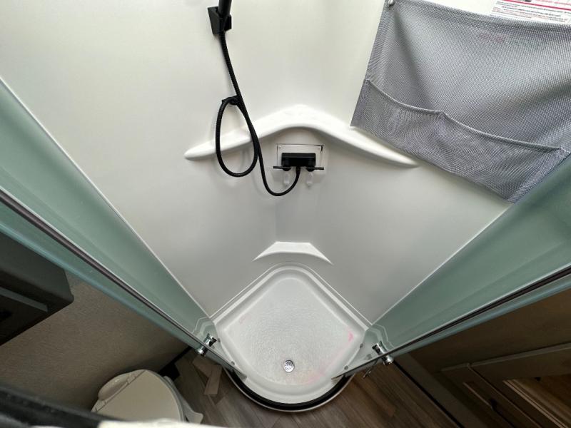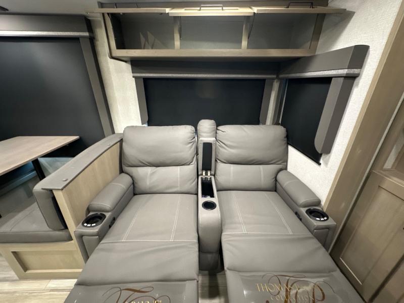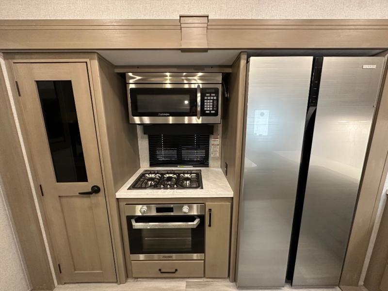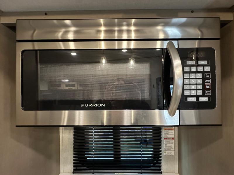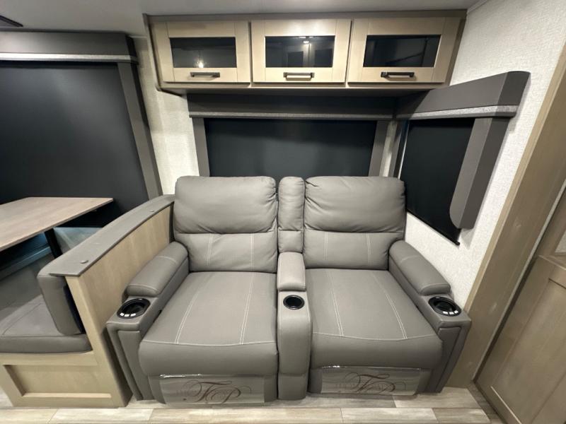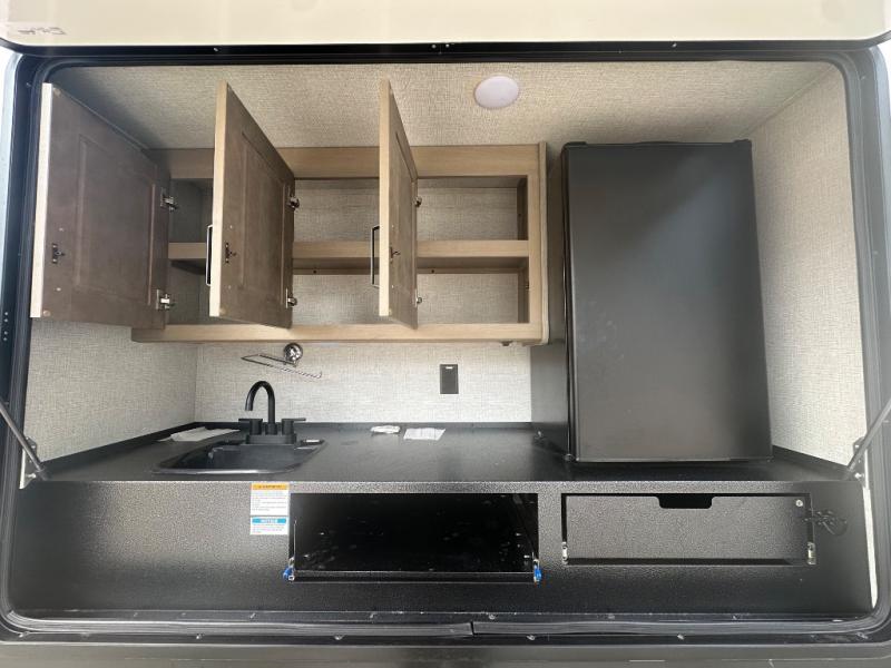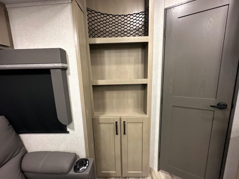 Are you looking to travel with your family and friends and want enough space for everyone to be comfortable? Step inside using the AXIStep, to find a private bunkhouse in the rear of this fifth wheel which offers a slide out flip bunk above a tri-fold sofa, a bunk bed and storage on the opposite side, its very own private half bathroom. The theater seating or tri-fold sofa option is a great place to unwind at night in front of the entertainment center with a 40" LED HDTV and fireplace below it. There is a booth dinette or you can choose a free standing dinette option to dine at, and the kitchen island will provide more counter space to prep meals. You will find full amenities including a 16 cu. ft. 12V refrigerator and a hutch. This fifth wheel also includes a double entry bathroom with a radius shower with a skylight, and you can wake up refreshed each morning after sleeping on your own queen bed.