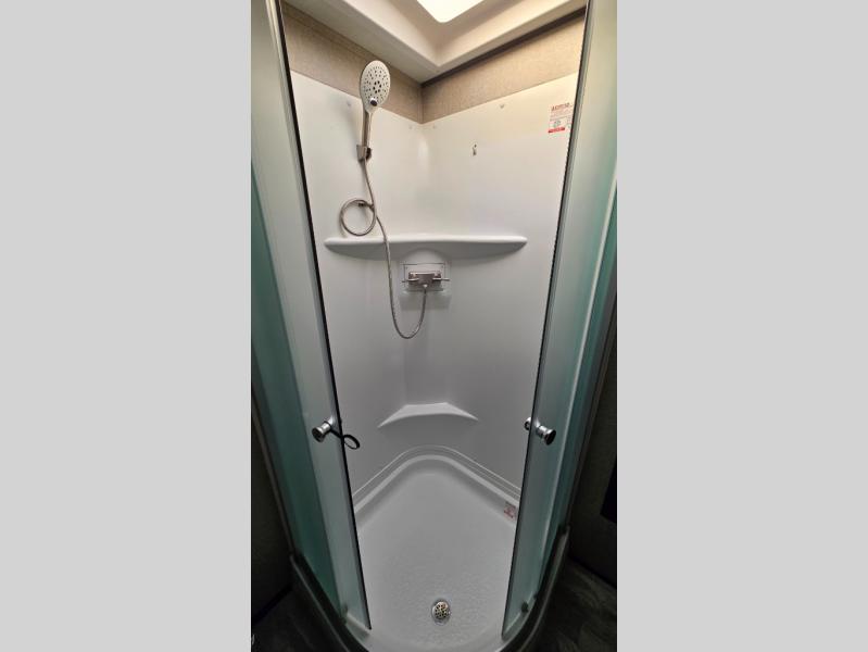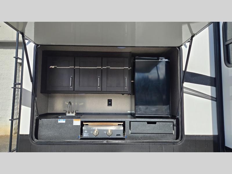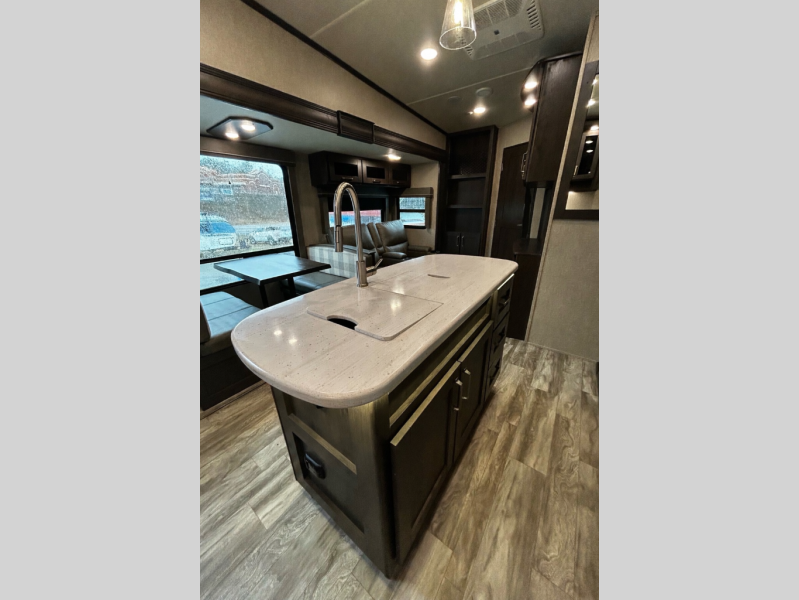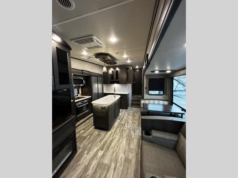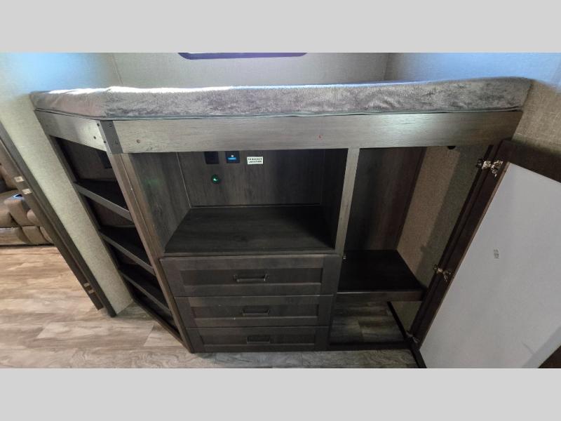 Are you looking to travel with your family and friends and want enough space for everyone to be comfortable? Step inside using the AXIStep, to find a private bunkhouse in the rear of this fifth wheel which offers a slide out flip bunk above a tri-fold sofa, a bunk bed and storage on the opposite side, its very own private half bathroom. The theater seating or tri-fold sofa option is a great place to unwind at night in front of the entertainment center with a 40" LED HDTV and fireplace below it. There is a booth dinette or you can choose a free standing dinette option to dine at, and the kitchen island will provide more counter space to prep meals. You will find full amenities including a 16 cu. ft. 12V refrigerator and a hutch. This fifth wheel also includes a double entry bathroom with a radius shower with a skylight, and you can wake up refreshed each morning after sleeping on your own queen bed.