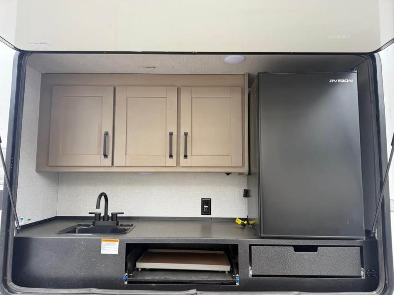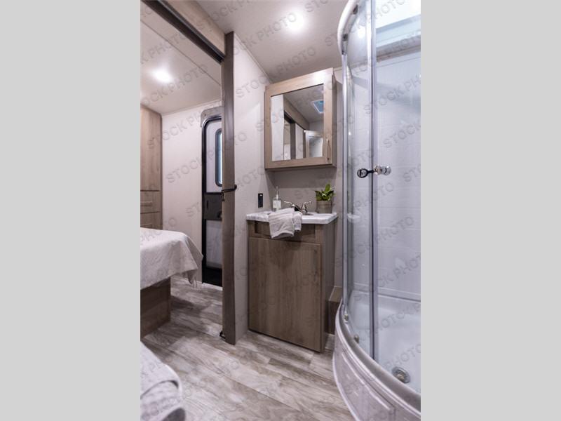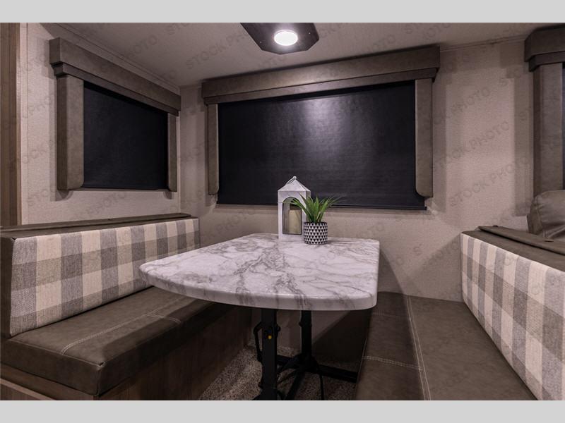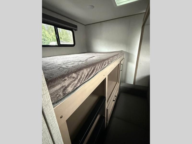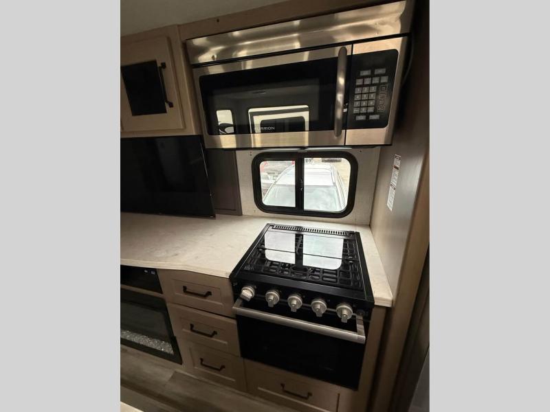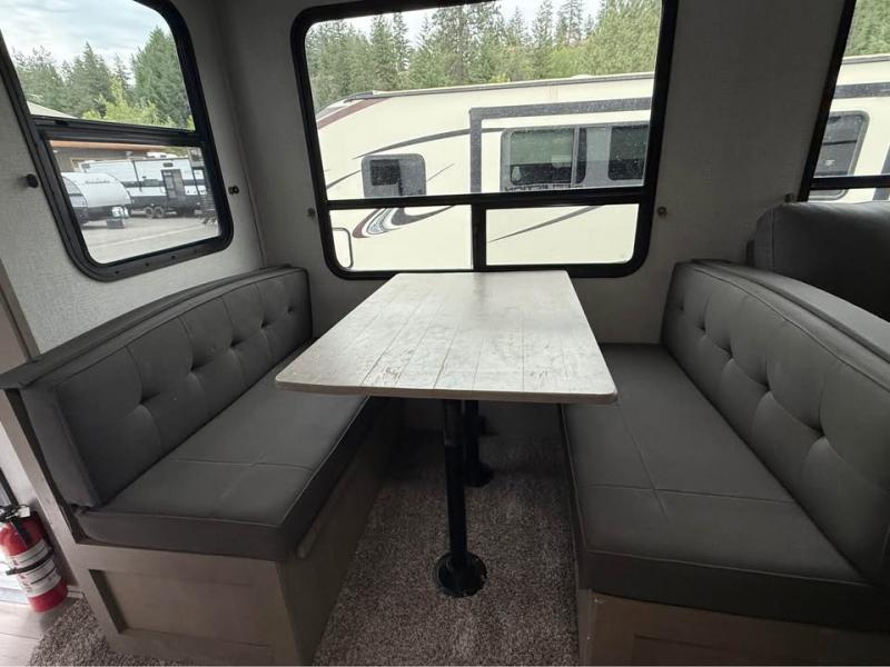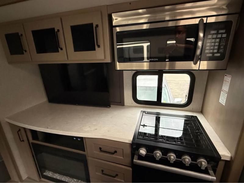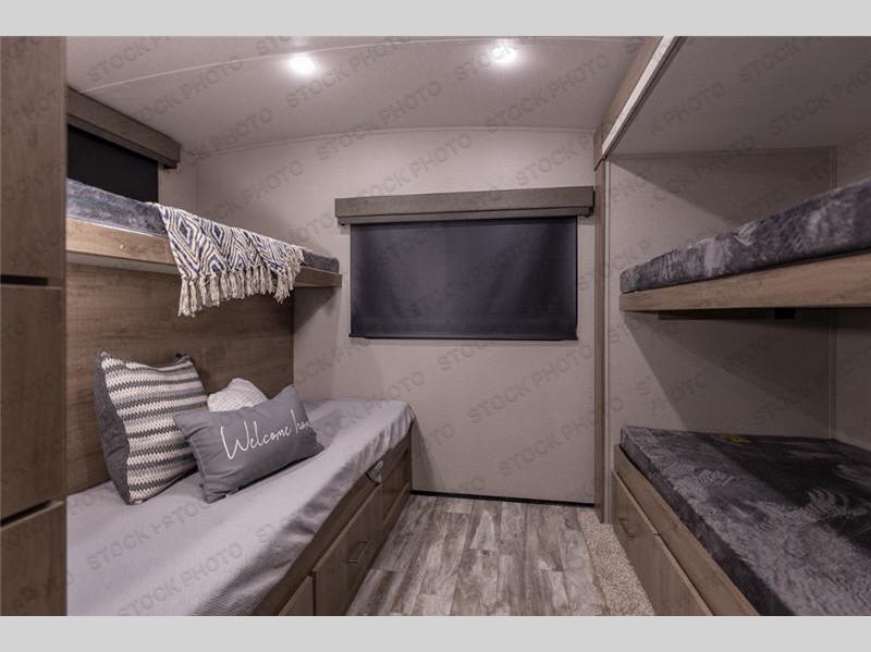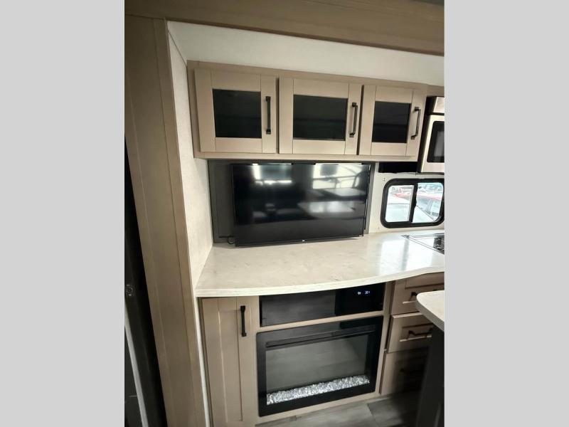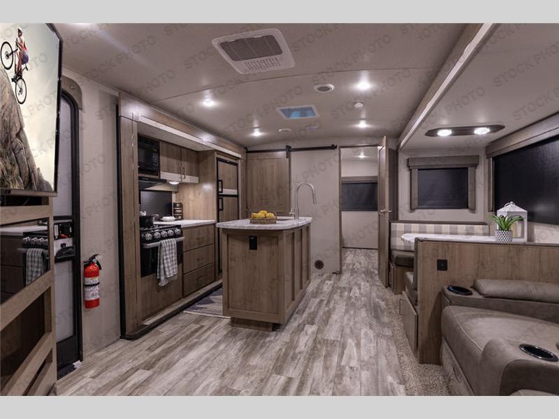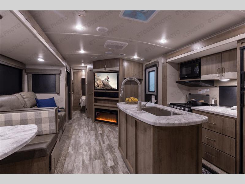 Finding the perfect trailer for a larger group is simple, take a look at this one for your next RV! The rear bunkhouse might be the first reason you fall in love because of the slide out with a flip bunk above a tri-fold sofa, the second bunk bed on the opposite side and storage below, and the large rear window for great views. The outside kitchen might be another reason allowing you to enjoy the outdoors while providing meals for everyone, and/or the inside gourmet kitchen with a 16 cu. ft. refrigerator, an island, and two hutches. Everyone can gather together and relax on the theatre seating with cupholders and the booth dinette or choose a free standing dinette option, and to visit or watch the 40" LED HDTV with fireplace below. The full bathroom includes a space savings sliding door and linen storage, and the bedroom gives you a front walk-around queen bed with storage for your clothes on each side, plus there is an additional wardrobe with drawers and the option to add a washer/dryer to the prepped space.