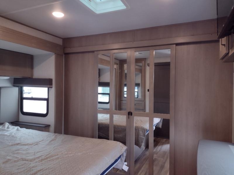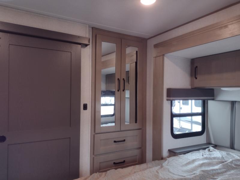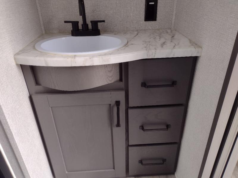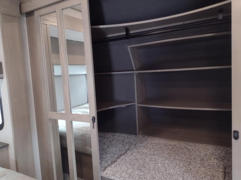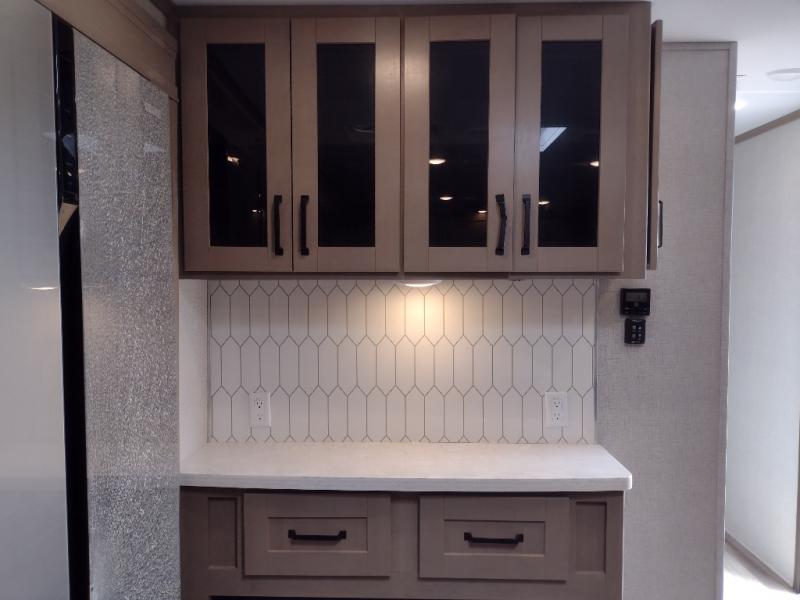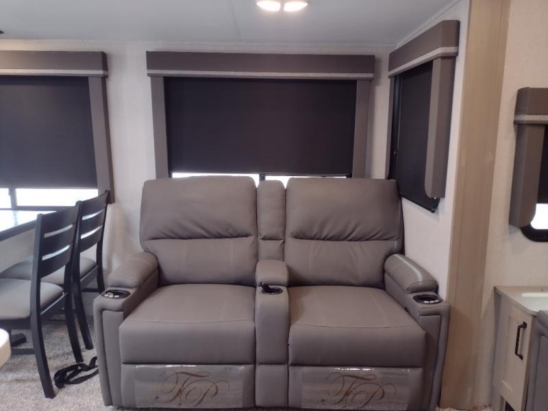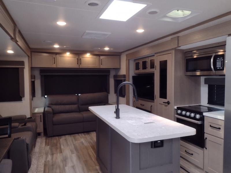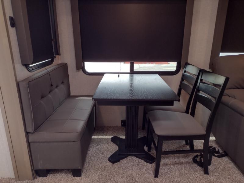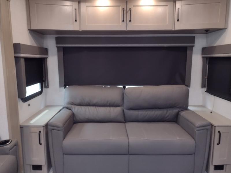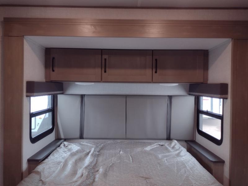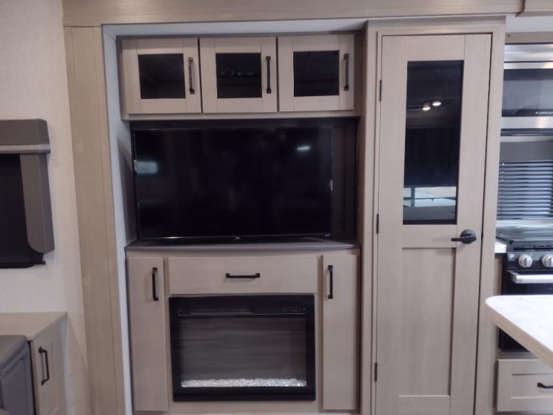 The chef of the group will love the gourmet kitchen including the 16 cu. ft. refrigerator that will hold lots of cold ingredients, beverages and leftovers, the center island when preparing and serving meals, and the hutch with overhead cabinets to display and store dishes and such. This area also includes two slide outs for more floor space and furniture to relax on including theatre seating with cupholders for your drinks, a booth dinette to dine at and work from or choose a free standing dinette option, and a rear tri-fold sofa that offers sleeping space for two at night. There is a 40" LED HDTV with fireplace below to enjoy while inside, plus there are two awnings outdoors to relax under. When you are ready to call it a night, get cleaned up in the full bathroom, and retire to your front bedroom with a slide out queen bed or choose a king option, a front full-wall wardrobe with washer/dryer prep, a dresser and an additional wardrobe with drawers.