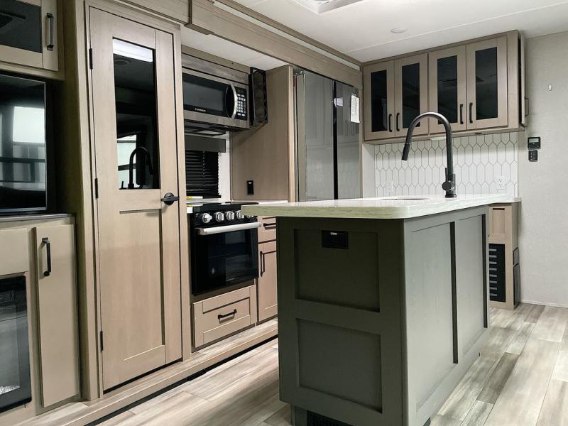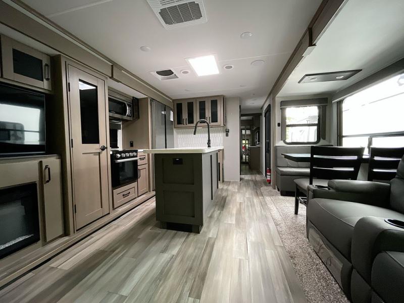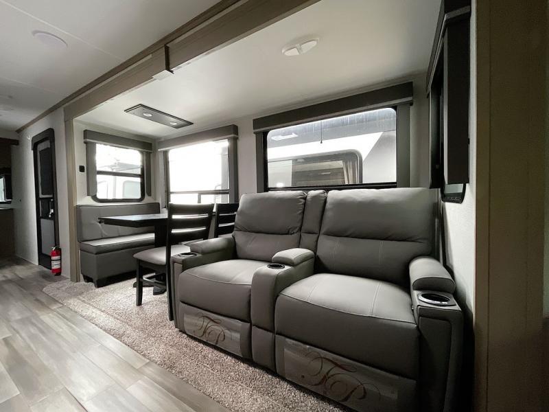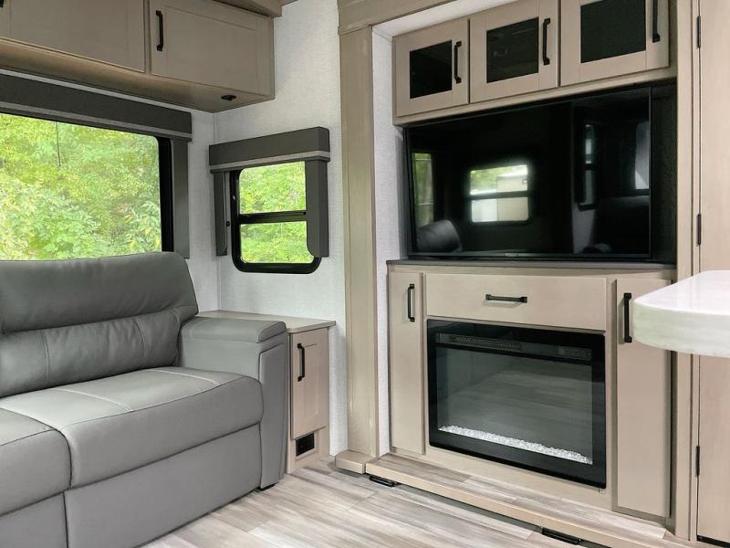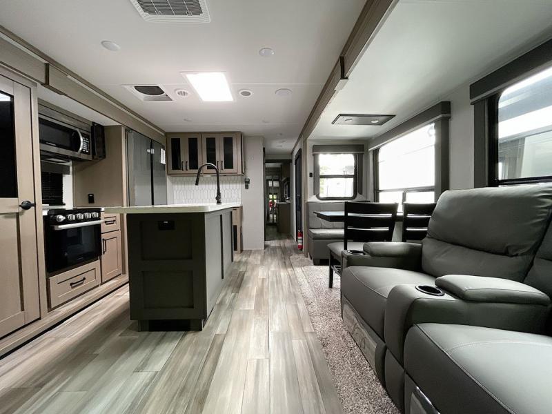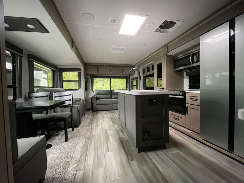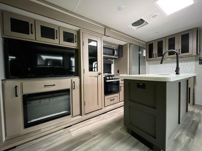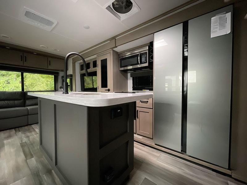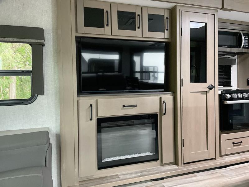 The chef of the group will love the gourmet kitchen including the 16 cu. ft. refrigerator that will hold lots of cold ingredients, beverages and leftovers, the center island when preparing and serving meals, and the hutch with overhead cabinets to display and store dishes and such. This area also includes two slide outs for more floor space and furniture to relax on including theatre seating with cupholders for your drinks, a booth dinette to dine at and work from or choose a free standing dinette option, and a rear tri-fold sofa that offers sleeping space for two at night. There is a 40" LED HDTV with fireplace below to enjoy while inside, plus there are two awnings outdoors to relax under. When you are ready to call it a night, get cleaned up in the full bathroom, and retire to your front bedroom with a slide out queen bed or choose a king option, a front full-wall wardrobe with washer/dryer prep, a dresser and an additional wardrobe with drawers.
