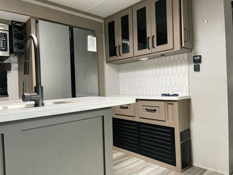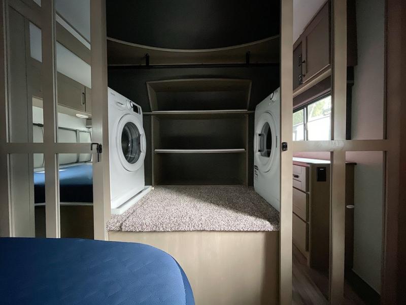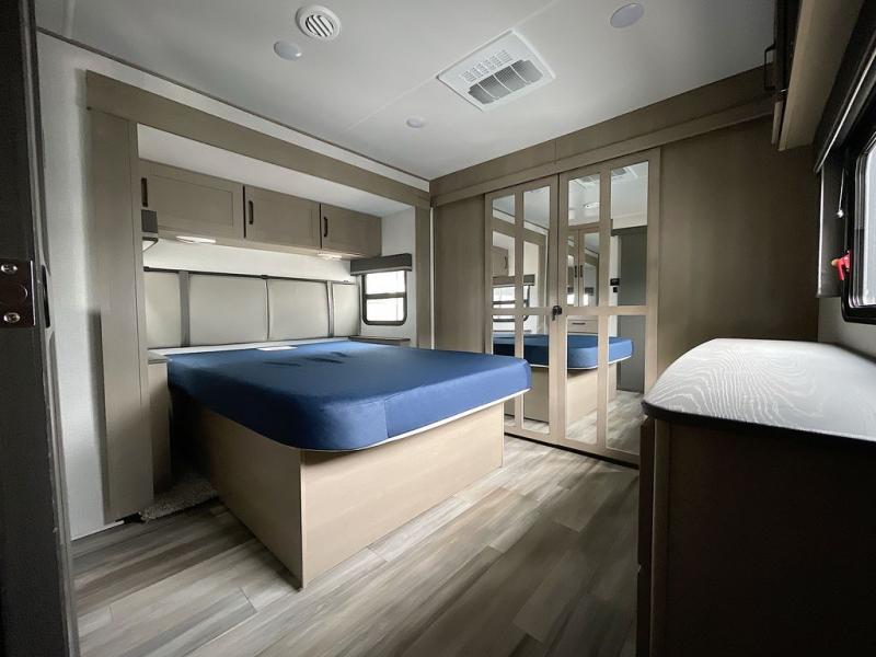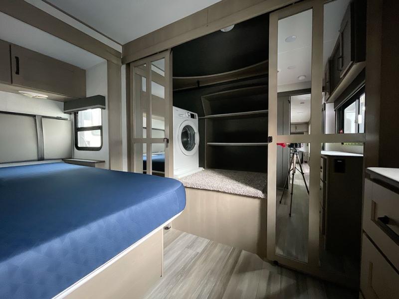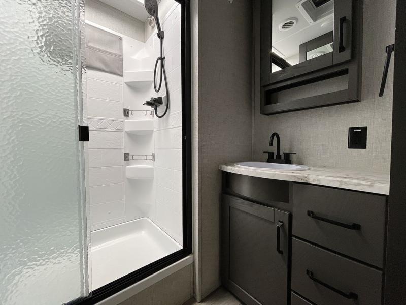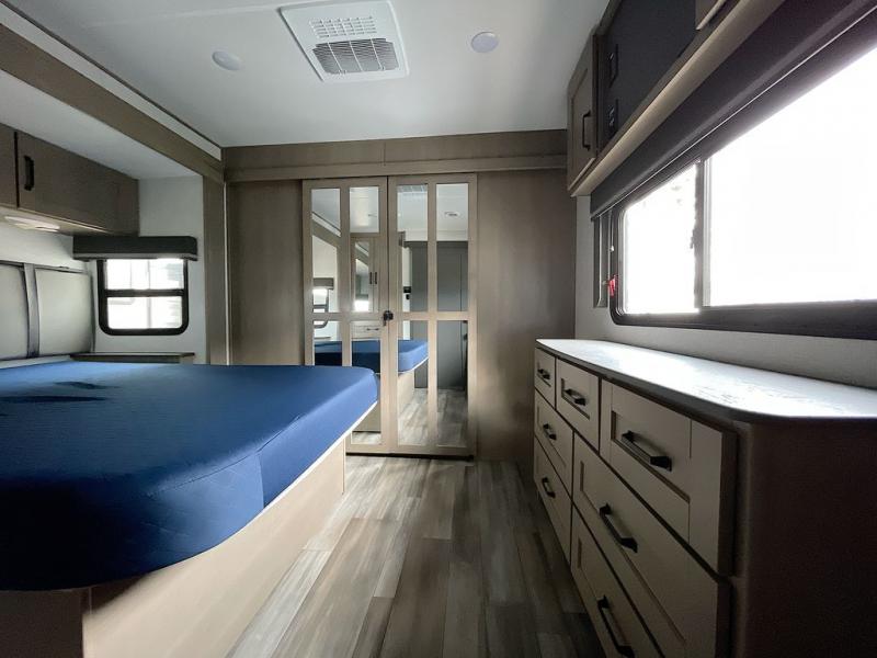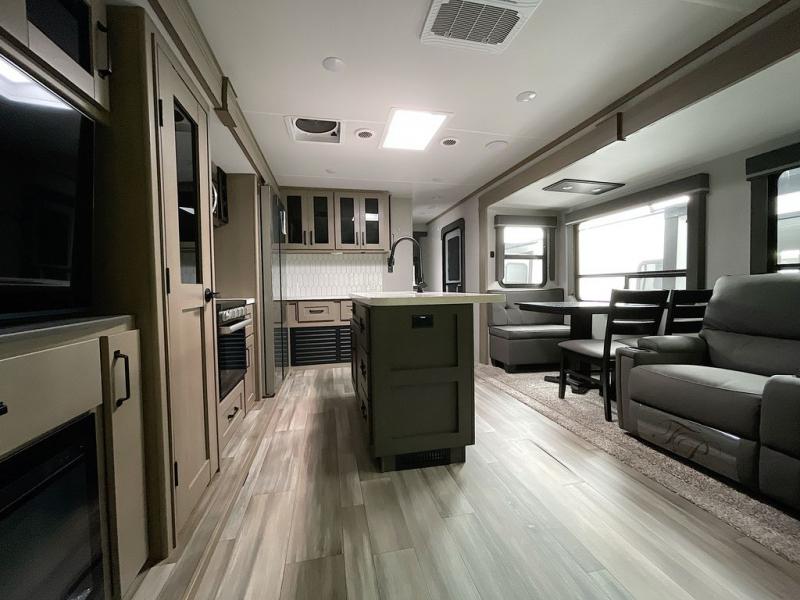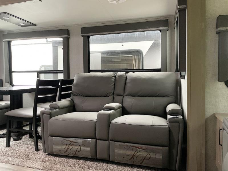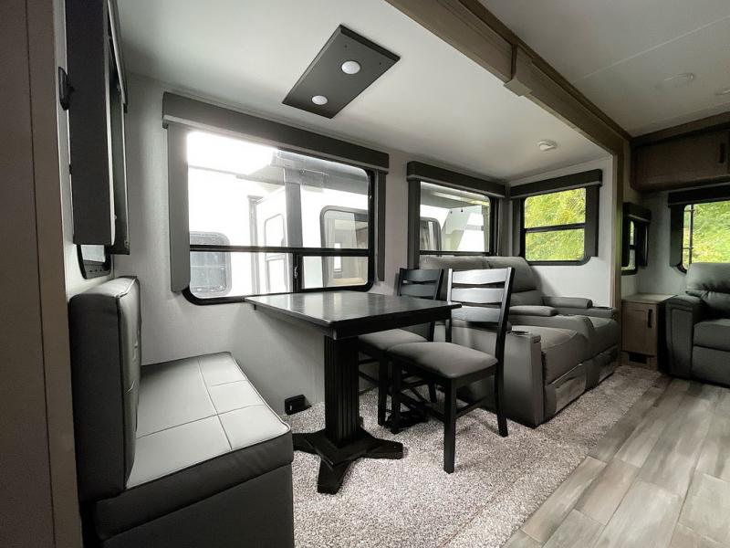 The chef of the group will love the gourmet kitchen including the 16 cu. ft. refrigerator that will hold lots of cold ingredients, beverages and leftovers, the center island when preparing and serving meals, and the hutch with overhead cabinets to display and store dishes and such. This area also includes two slide outs for more floor space and furniture to relax on including theatre seating with cupholders for your drinks, a booth dinette to dine at and work from or choose a free standing dinette option, and a rear tri-fold sofa that offers sleeping space for two at night. There is a 40" LED HDTV with fireplace below to enjoy while inside, plus there are two awnings outdoors to relax under. When you are ready to call it a night, get cleaned up in the full bathroom, and retire to your front bedroom with a slide out queen bed or choose a king option, a front full-wall wardrobe with washer/dryer prep, a dresser and an additional wardrobe with drawers.