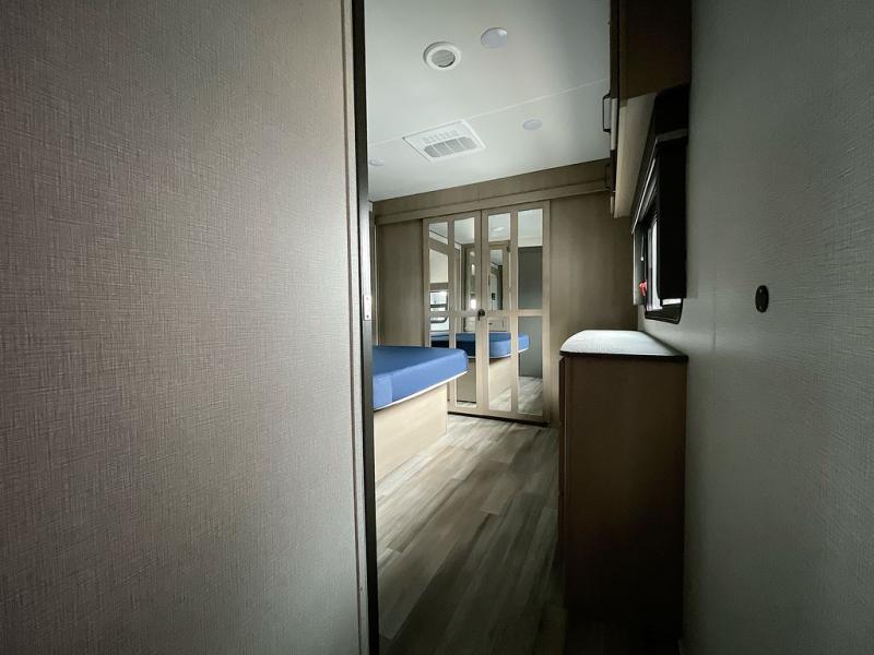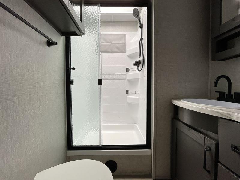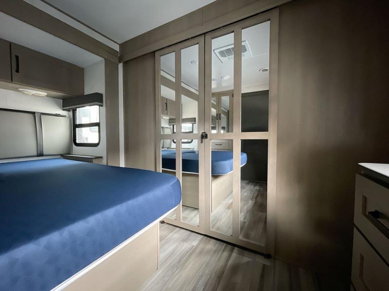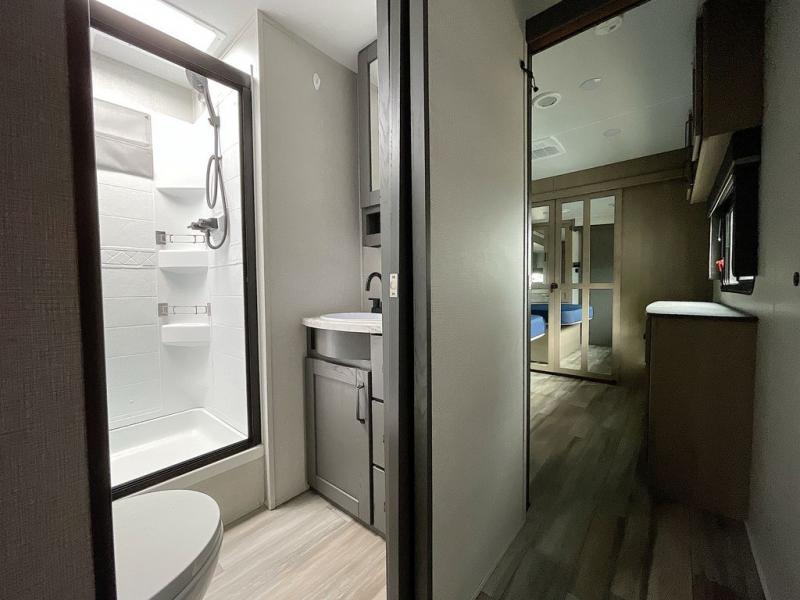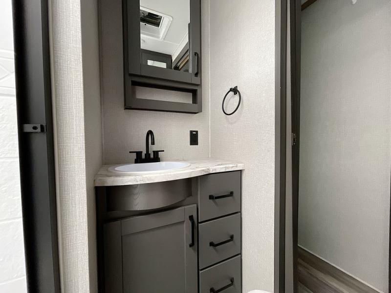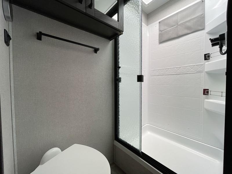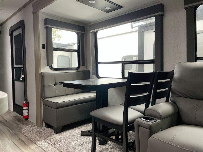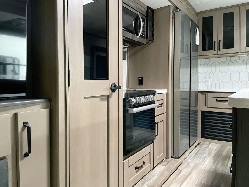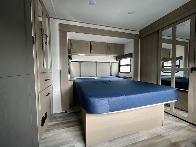 The chef of the group will love the gourmet kitchen including the 16 cu. ft. refrigerator that will hold lots of cold ingredients, beverages and leftovers, the center island when preparing and serving meals, and the hutch with overhead cabinets to display and store dishes and such. This area also includes two slide outs for more floor space and furniture to relax on including theatre seating with cupholders for your drinks, a booth dinette to dine at and work from or choose a free standing dinette option, and a rear tri-fold sofa that offers sleeping space for two at night. There is a 40" LED HDTV with fireplace below to enjoy while inside, plus there are two awnings outdoors to relax under. When you are ready to call it a night, get cleaned up in the full bathroom, and retire to your front bedroom with a slide out queen bed or choose a king option, a front full-wall wardrobe with washer/dryer prep, a dresser and an additional wardrobe with drawers.