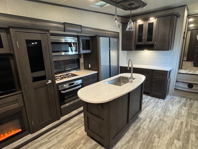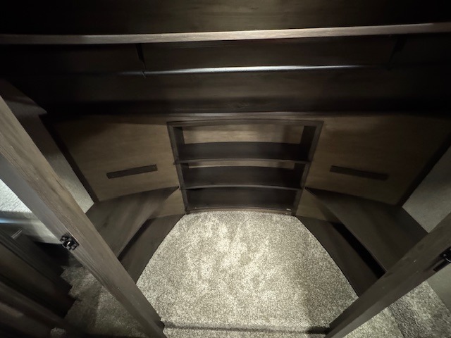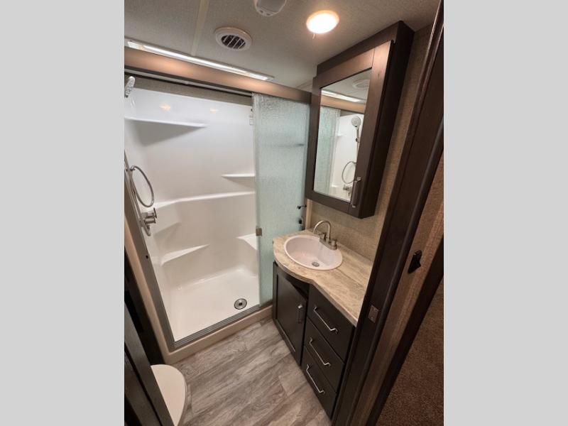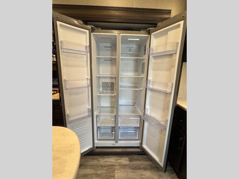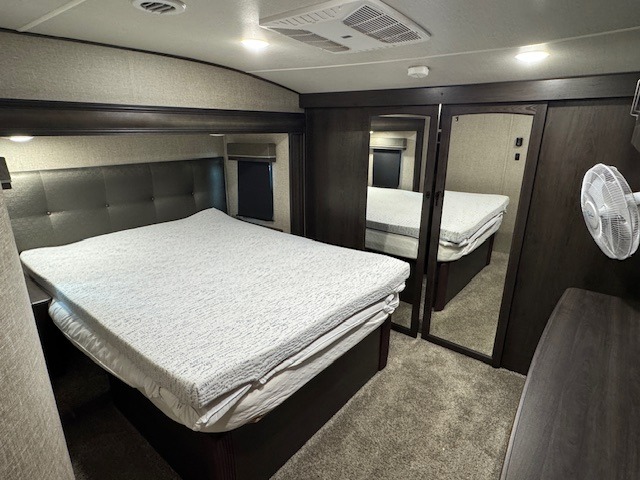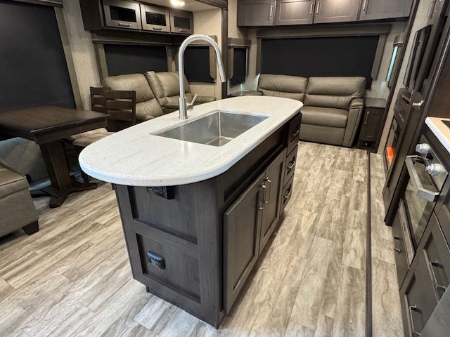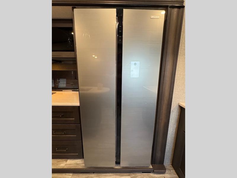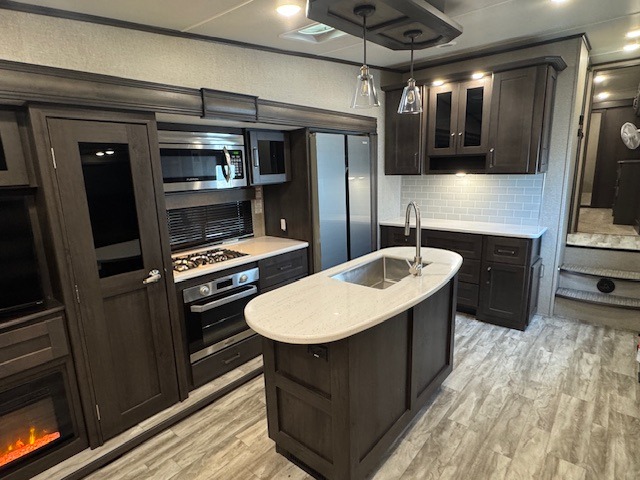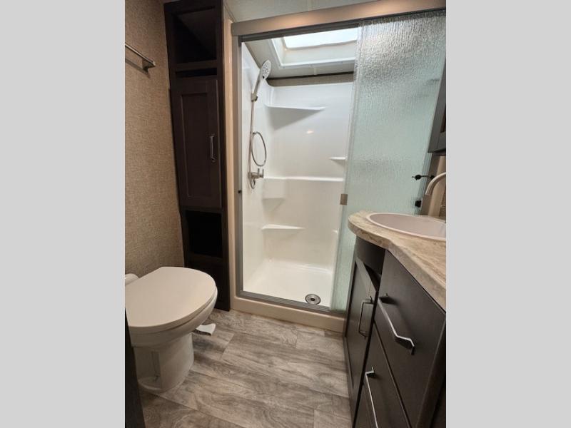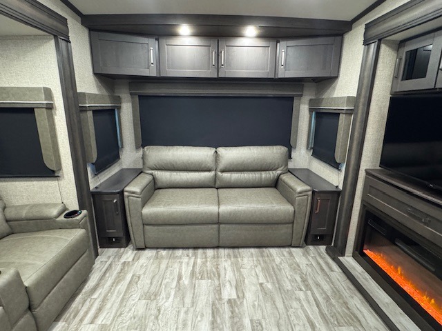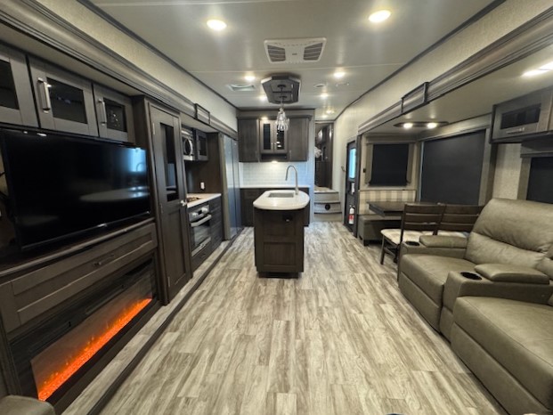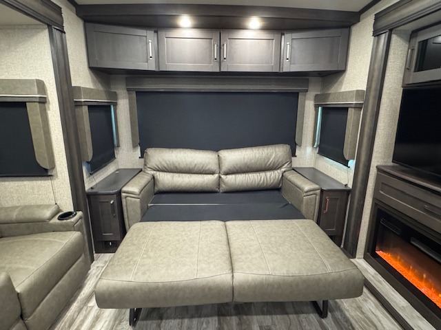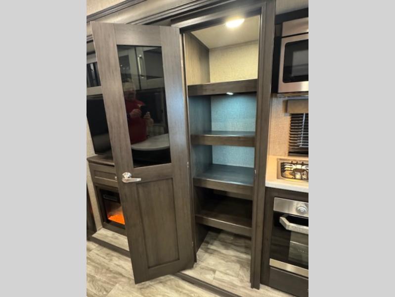 You can enjoy a spacious rear living area in this RV with dual opposing slides offering you entertainment, kitchen amenities, seating and windows for great views! The rear tri-fold sofa also converts into extra sleeping space for an extra guest or two, just like the booth dinette does. Yet you might like to add the free standing dinette option. There are theatre seats to enjoy while you place your drinks in the cupholders and watch the entertainment center with a 40" LED HDTV and fireplace. The pantry is big enough to store your favorite snacks, and the kitchen island will make meal prepping easier, plus there is a 16 cu. ft. refrigerator to store any leftovers. The full bathroom has a 30" x 48" fiberglass shower with a skylight above for natural lighting as you get ready and a linen closet to store your towels. The front private bedroom has a comfortable queen bed slide that can be switched out for the optional king bed, a dresser with overhead cabinets, and a full wall wardrobe that is prepped to add the optional washer and dryer so that you can extend your camping trip with clean clothes!