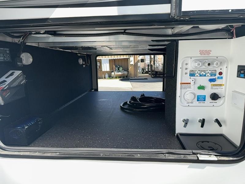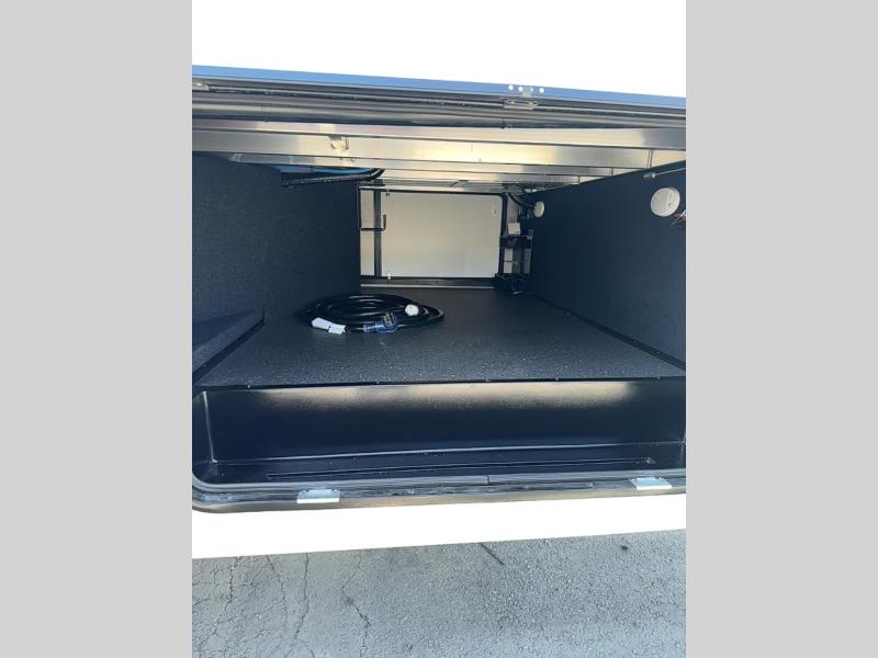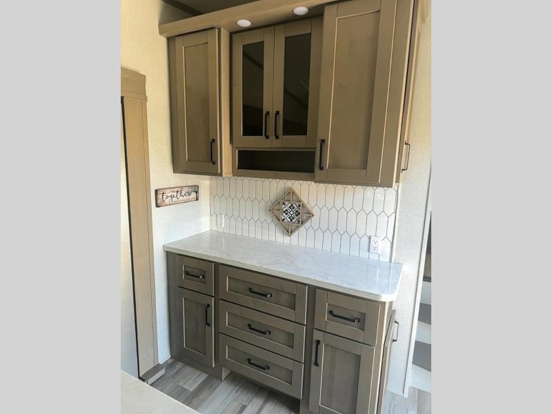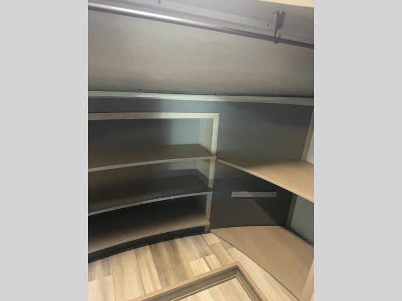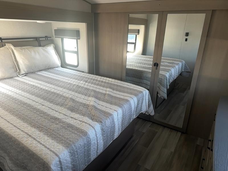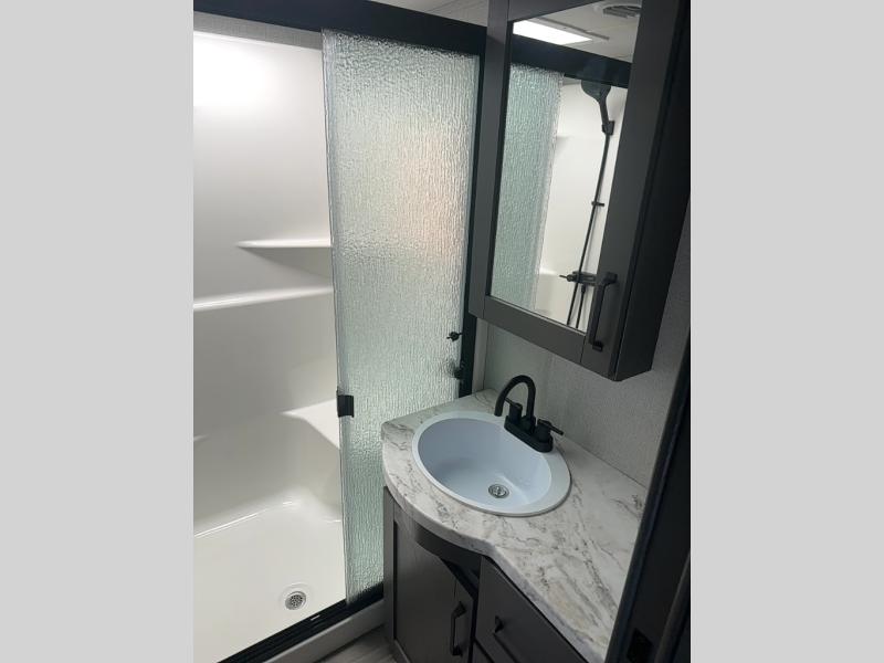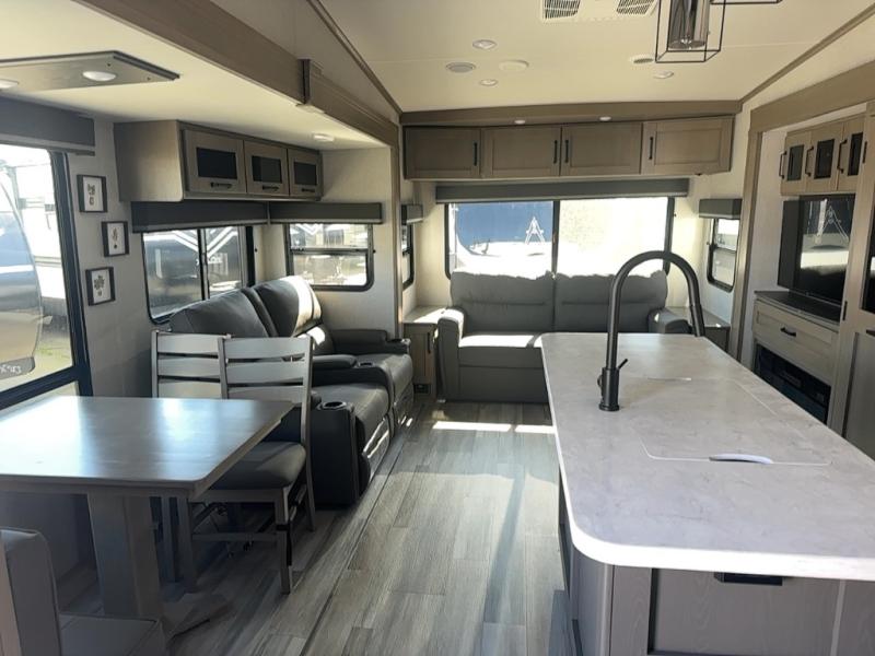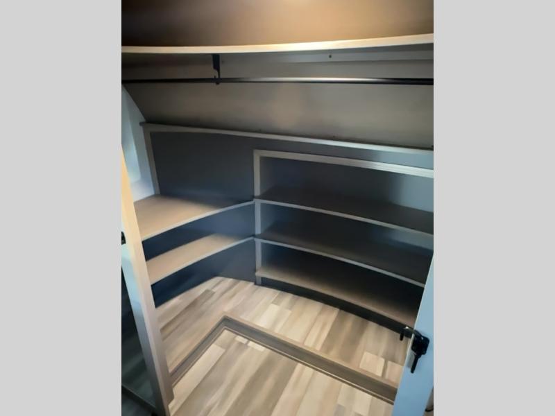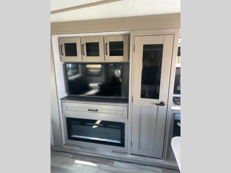 You can enjoy a spacious rear living area in this RV with dual opposing slides offering you entertainment, kitchen amenities, seating and windows for great views! The rear tri-fold sofa also converts into extra sleeping space for an extra guest or two, just like the booth dinette does. Yet you might like to add the free standing dinette option. There are theatre seats to enjoy while you place your drinks in the cupholders and watch the entertainment center with a 40" LED HDTV and fireplace. The pantry is big enough to store your favorite snacks, and the kitchen island will make meal prepping easier, plus there is a 16 cu. ft. refrigerator to store any leftovers. The full bathroom has a 30" x 48" fiberglass shower with a skylight above for natural lighting as you get ready and a linen closet to store your towels. The front private bedroom has a comfortable queen bed slide that can be switched out for the optional king bed, a dresser with overhead cabinets, and a full wall wardrobe that is prepped to add the optional washer and dryer so that you can extend your camping trip with clean clothes!