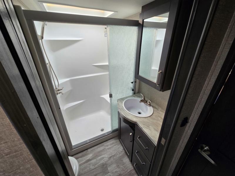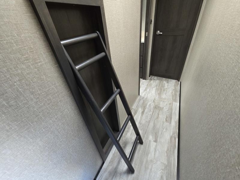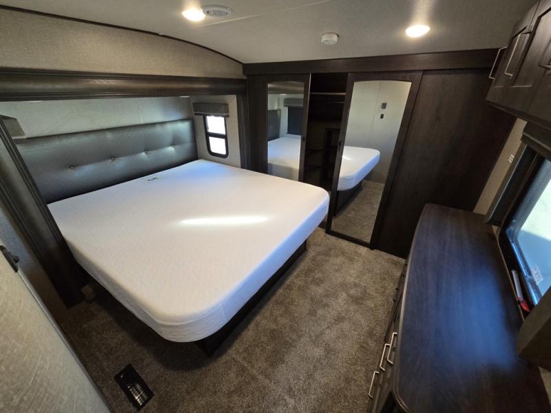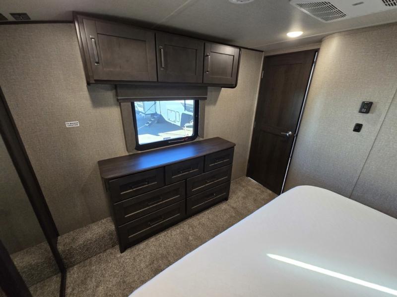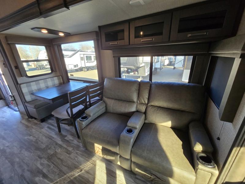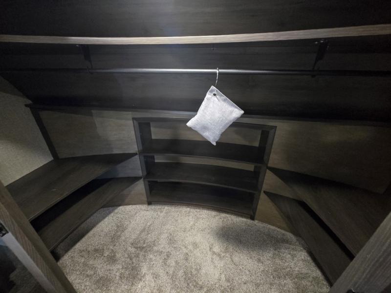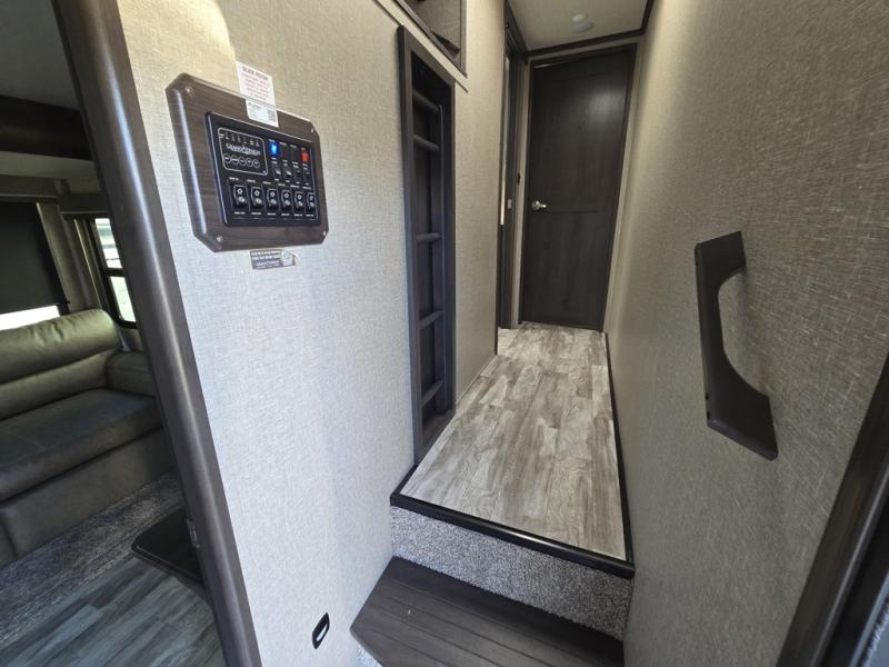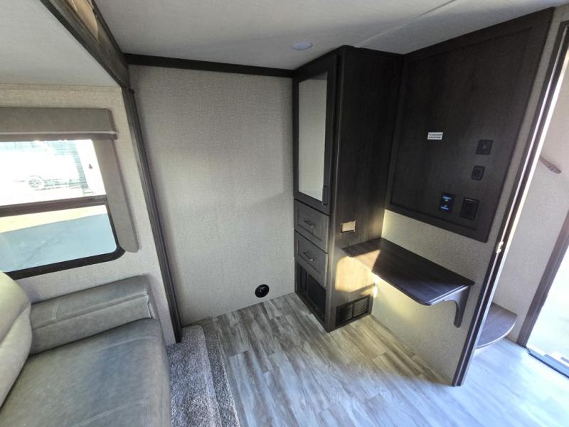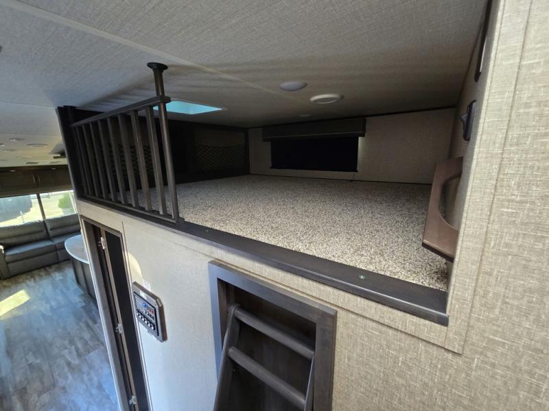 Travel to see new state parks, RV resorts or your family in other states as you tow this fifth wheel to each destination! You will enjoy comfort and convenience, plus a place to work, and be able to offer extra sleeping space for friends and family when they visit. The middle extra room provides a tri-fold sofa slide, a desk, a wardrobe, plus a 64" x 88" upper bed loft area with access from the hallway, which provides two different places to accommodate overnight guests. The full bathroom will keep everyone refreshed, and the front bedroom allows you to sleep on a queen bed slide or choose the king option. And you will love the front wardrobe, the dresser, and the option to add a washer/dryer. The main living and kitchen area provides plenty of seating from the rear tri-fold sofa, the booth dinette or choose the free standing dinette option, and the theatre seats with cupholders. And the kitchen island, the appliances, and the large pantry allow you to take everything you need with you.
