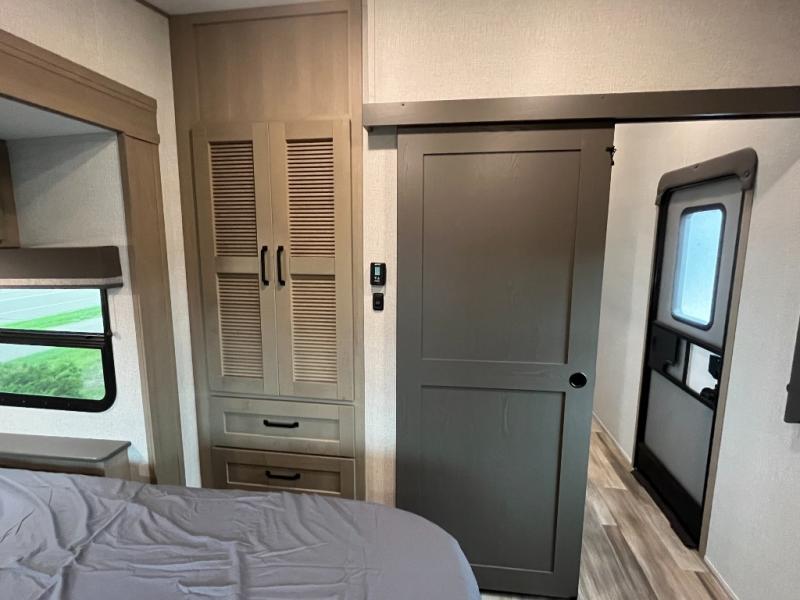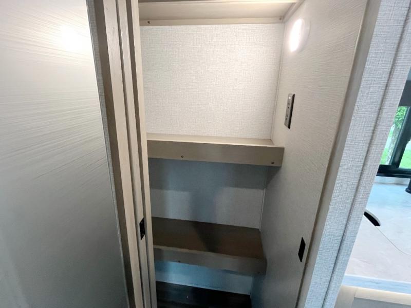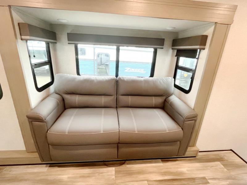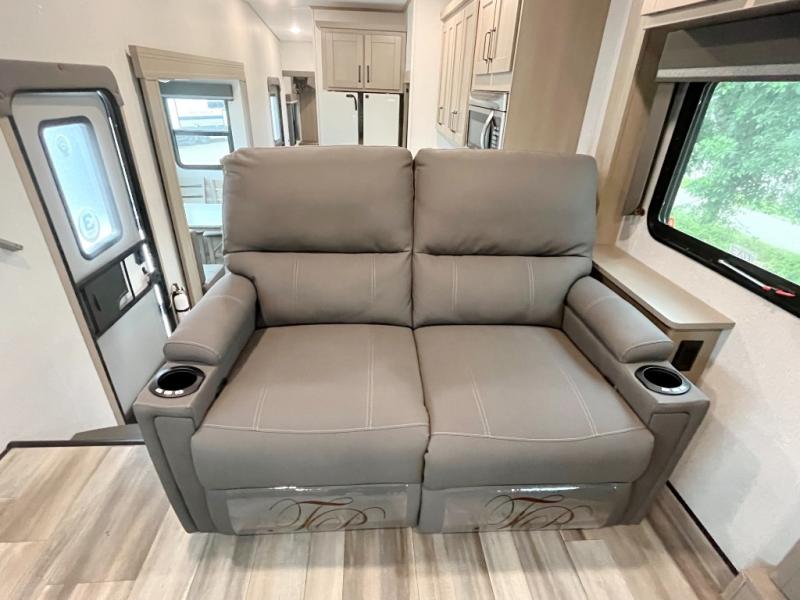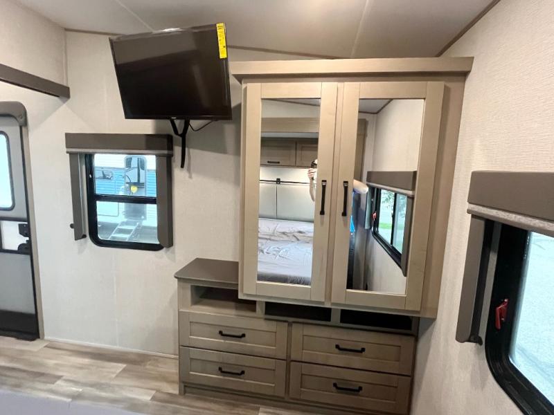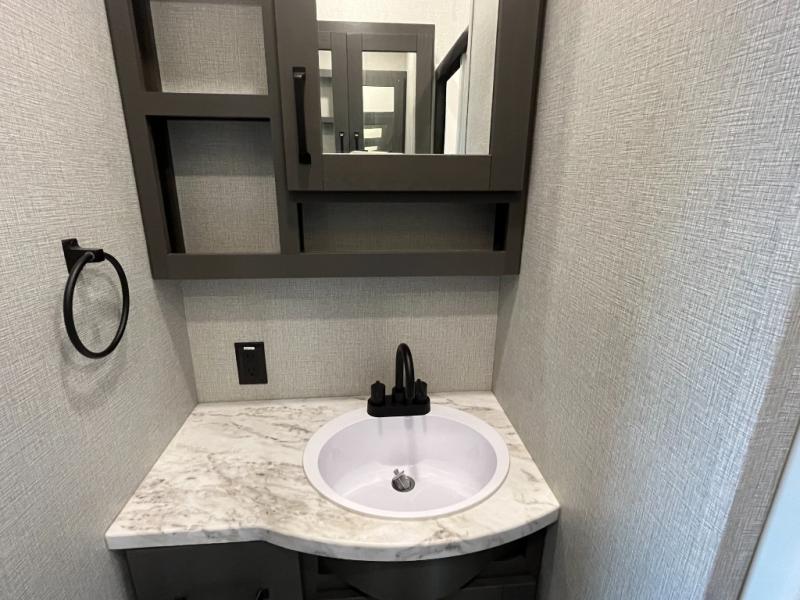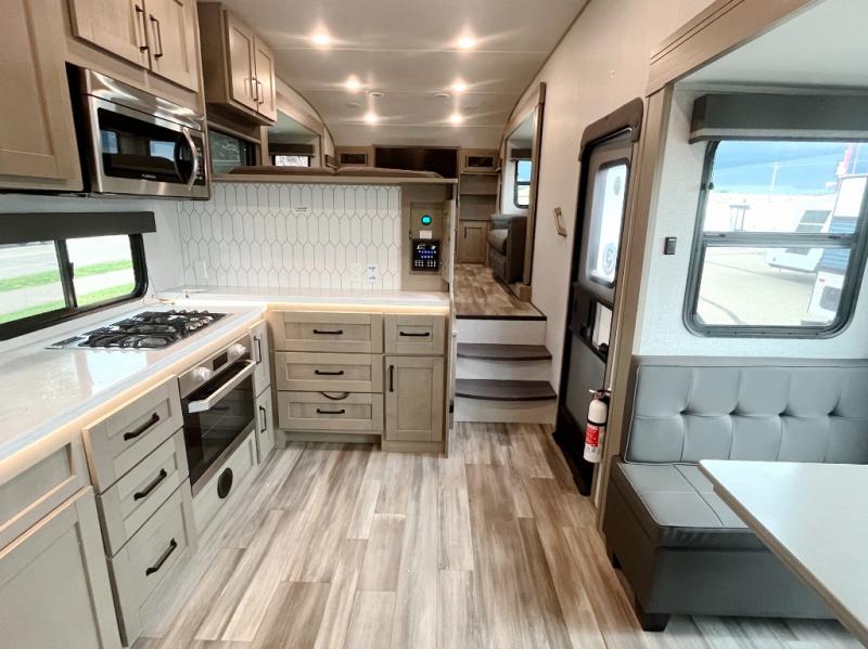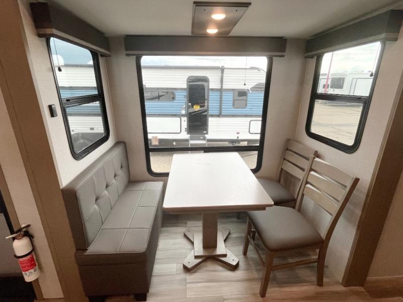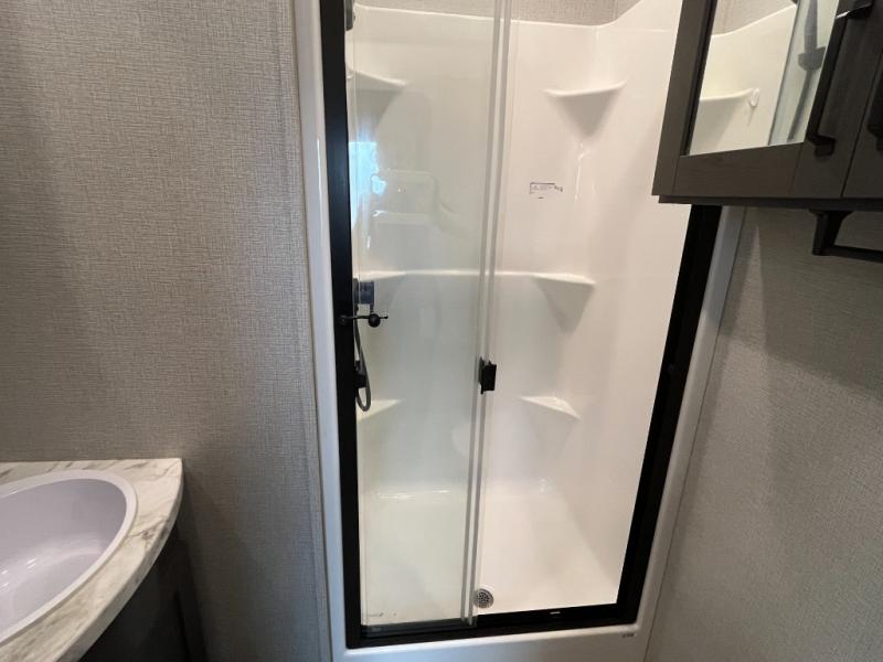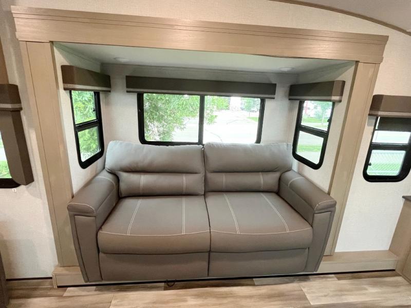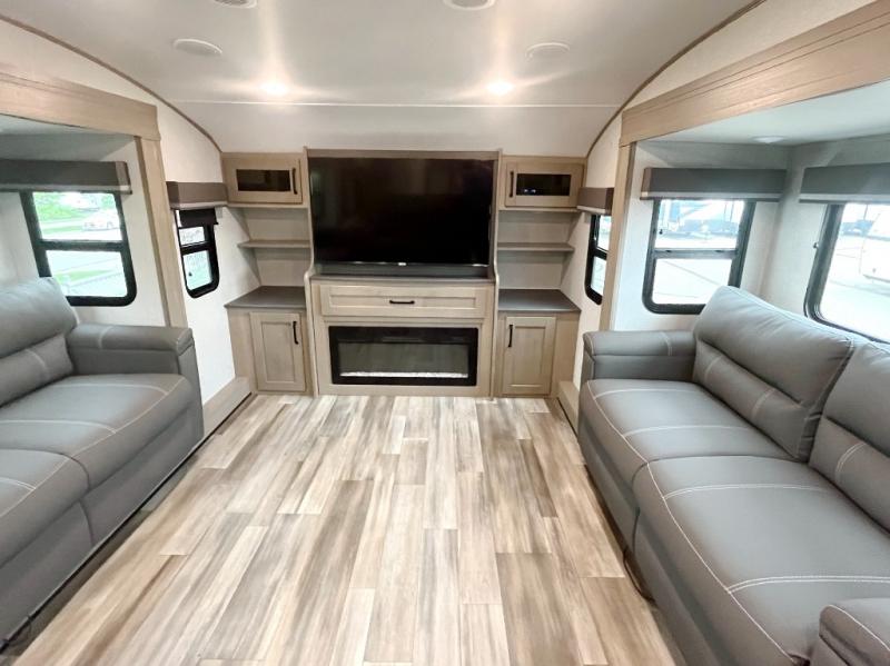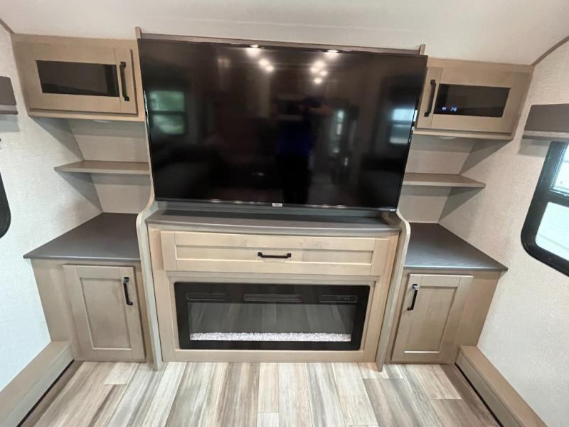 You and your spouse will love having this fifth wheel on your next camping adventure! Get a good night's rest each night on the queen bed slide in the rear private bedroom with TV prep across from the bed, and freshen up each morning in the full bathroom with the 30" x 48" fiberglass shower. You can enjoy home cooked meals made using the three burner cooktop and 16 cu. ft. refrigerator in the full kitchen, and eat them at the slide out free standing dinette table featuring two chairs and an ottoman with storage. You even have a hutch to store your dishes in, and a TV prep area so you can add a TV to watch a show while you cook. The front living area offers a comfortable place to wind down your nights by relaxing in front of the fireplace on either one of the opposing tri-fold sofa slides or the theater seating!