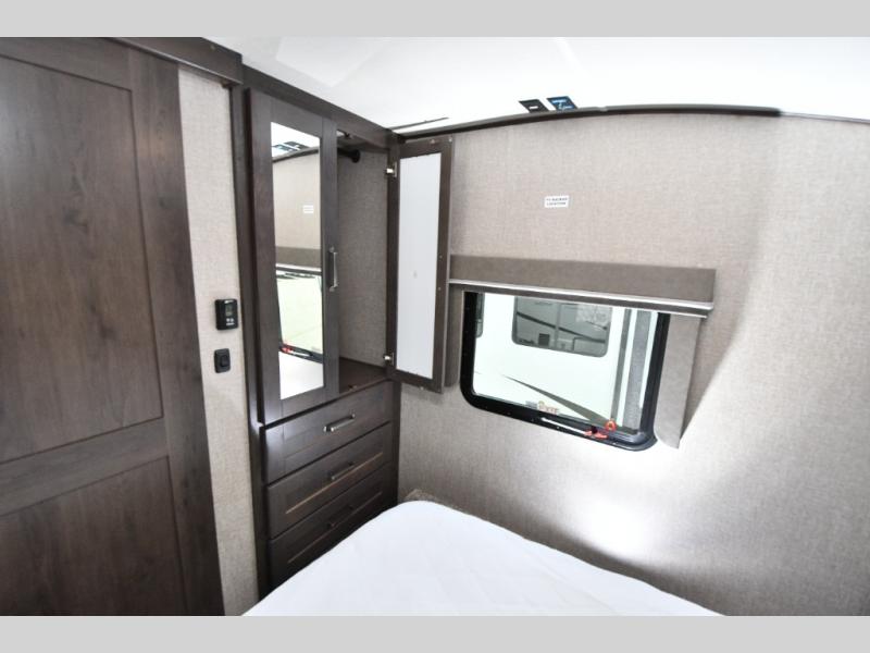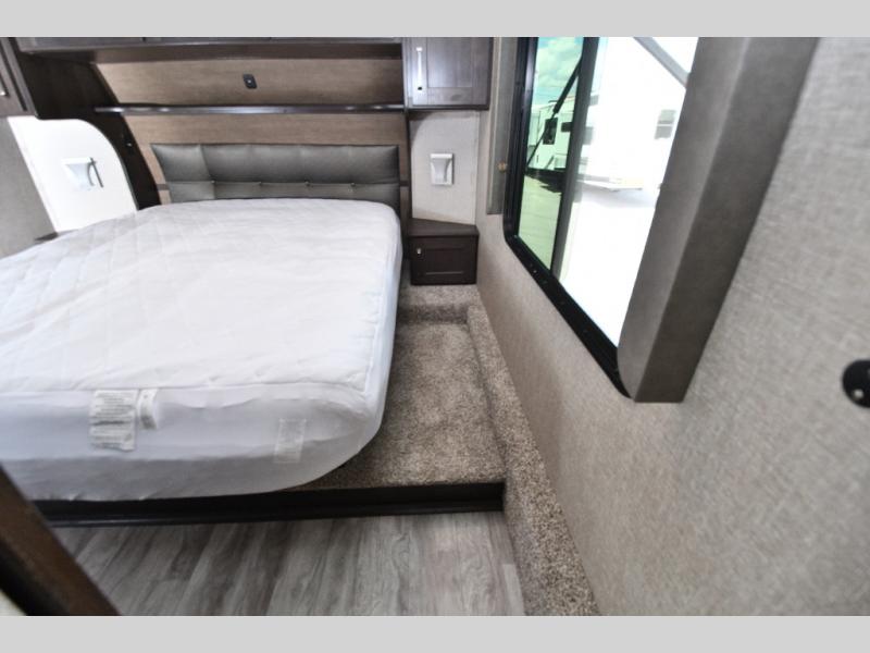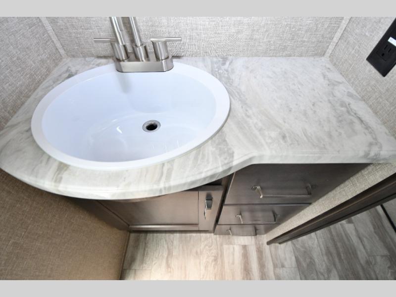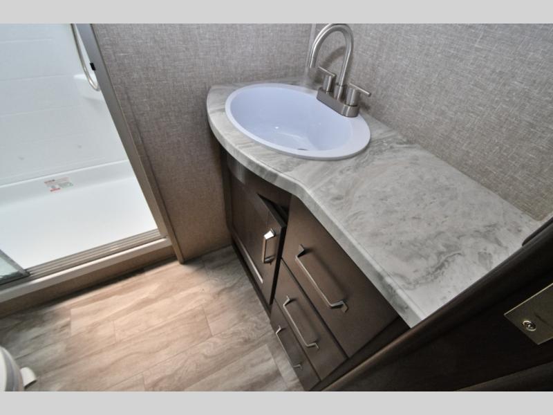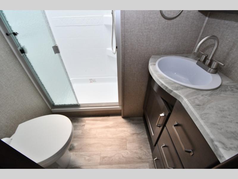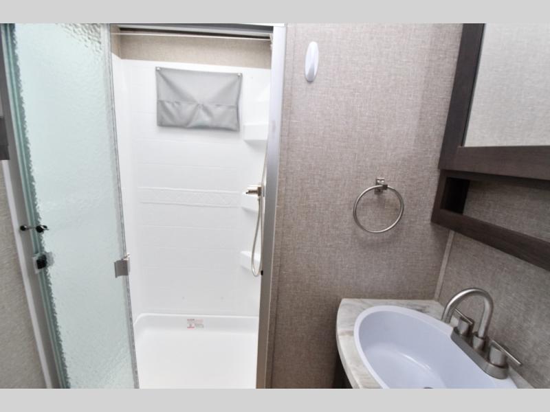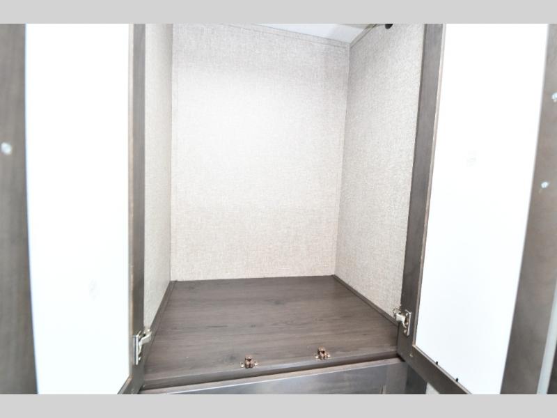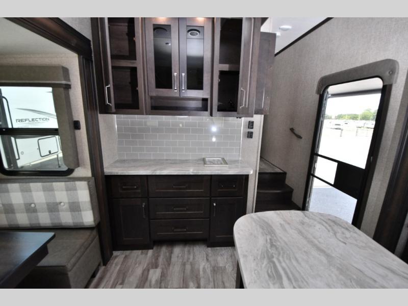 Outside, this Reflection 280RS is ready for outdoor enjoyment with an exterior TV and refrigerator, plus pass-through storage that’s heated for convenience. A roof-mounted solar panel adds off-grid capability, while the Ultimate Power Package ensures effortless setup with One-Touch automatic leveling, motion sensor lighting, and tire monitoring for safe travels. With residential-style cabinetry, premium congoleum flooring, and thoughtful design touches, this fifth wheel balances luxury with durability for memorable camping experiences.