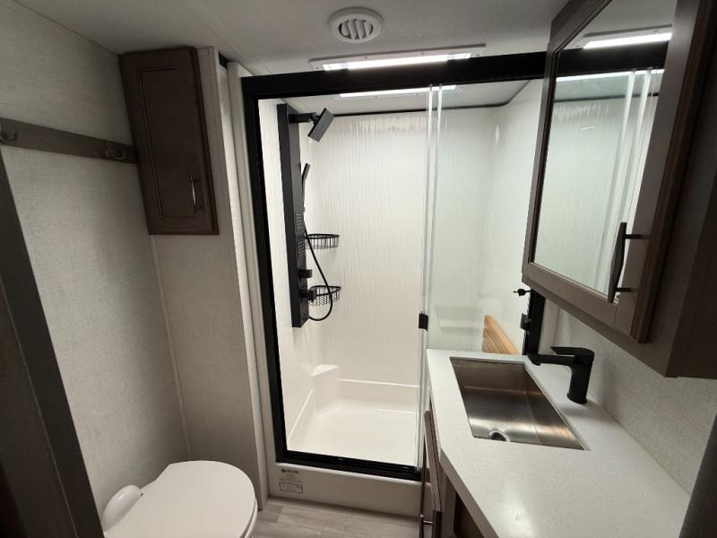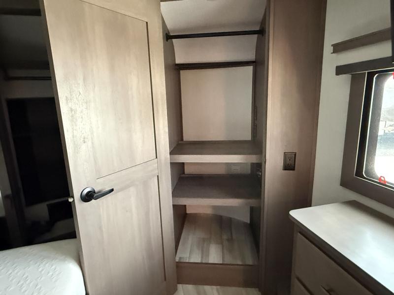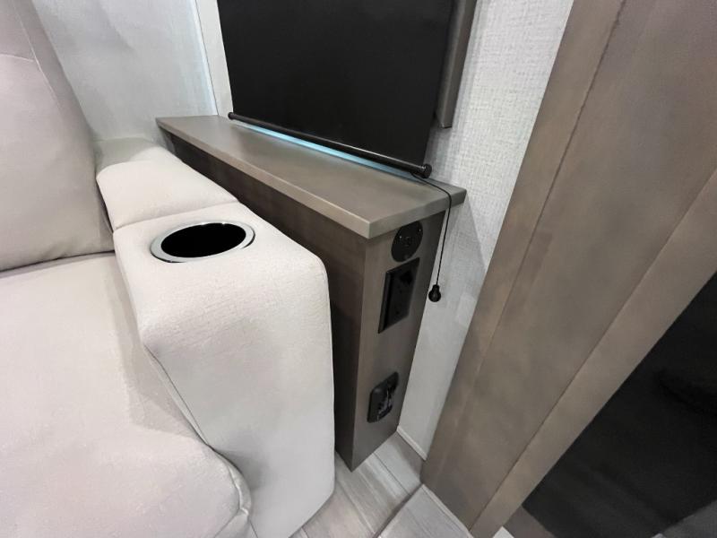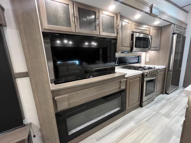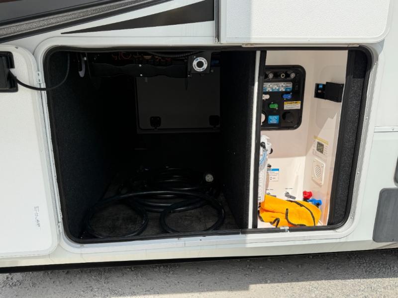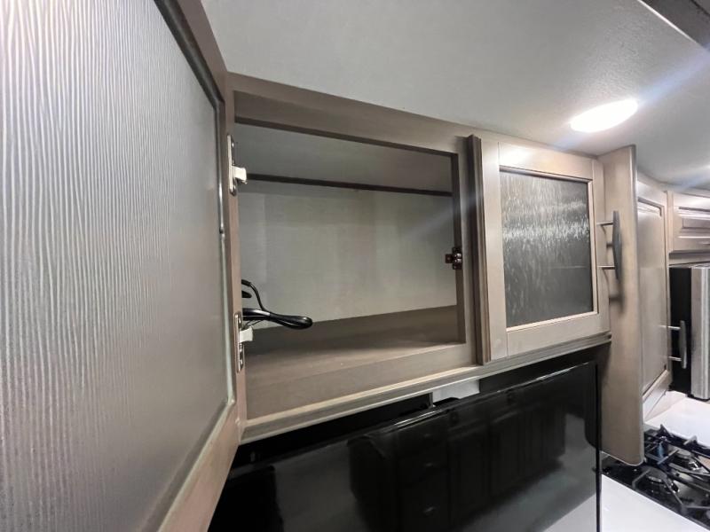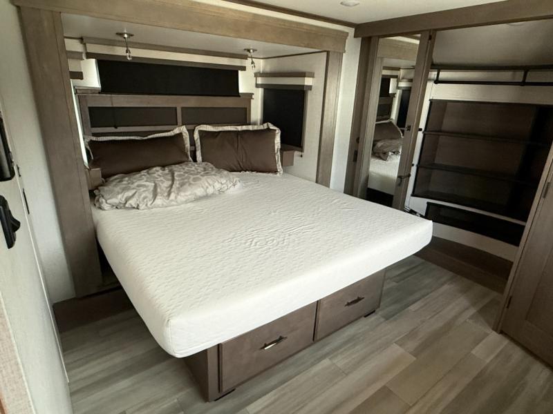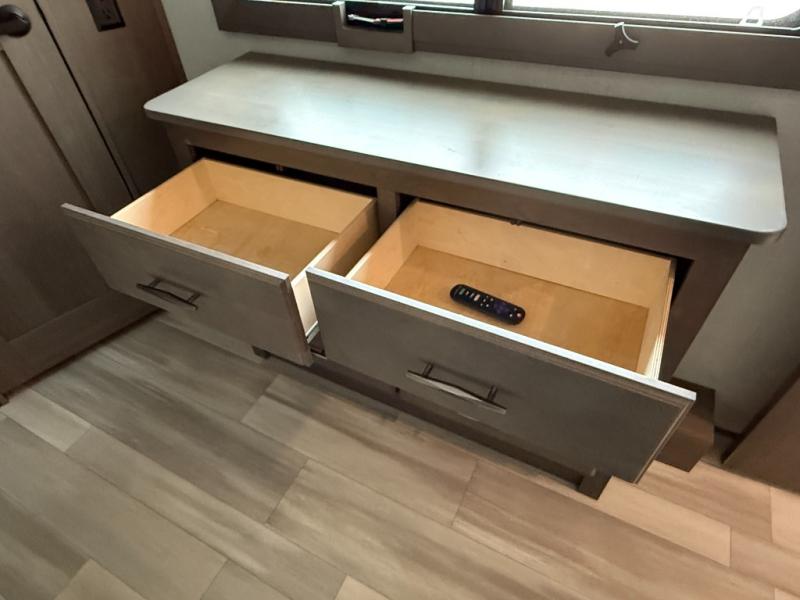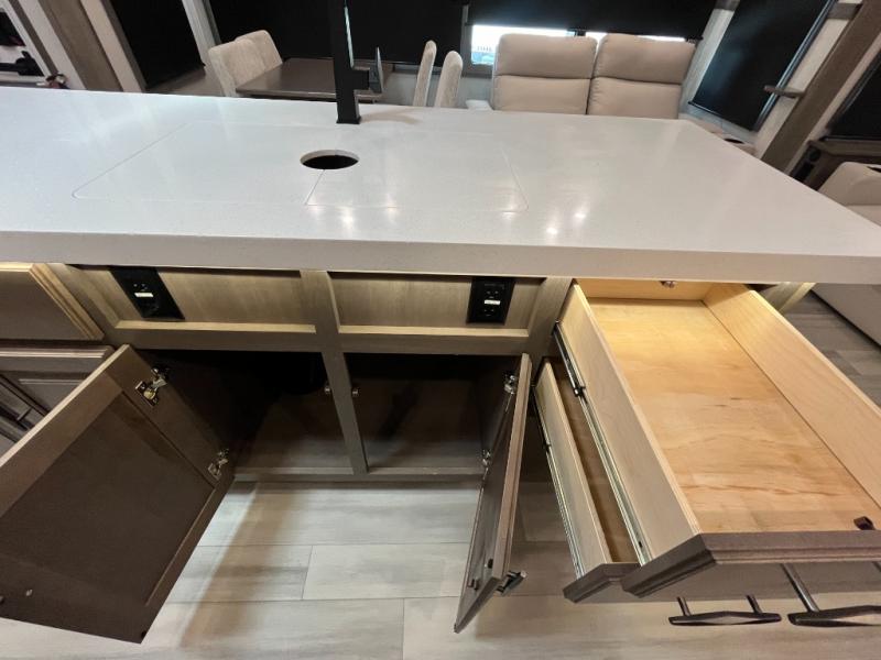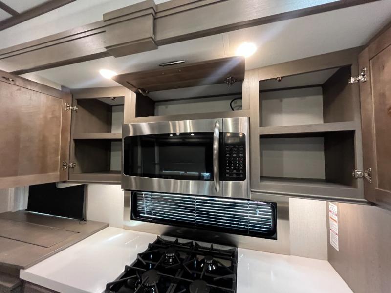 Traveling for long periods at a time is made easy with this gourmet kitchen that can feed your entire group a holiday meal! The professional-grade stainless steel cooktop with a built-in 24" residential oven, microwave, 12V 20 cu. ft. refrigerator, and a kitchen island offers everything you will need to enjoy cooking for your family and guests. There is abundant storage throughout multiple overhead cabinets, a kitchen pantry and hutch, show storage under the interior steps, a bath linen cabinet for your towels, and in the front master bedroom which features a large closet. In the bedroom there is also a queen bed on a slide for added space to sleep comfortable at night, or you may choose an optional king bed if you enjoy more space. You will also find a closet prepped for an optional washer/dryer, large wardrobe, plus a flip-top dresser with an LED TV above. In the bathroom, enjoy a hot shower with a flip-up teak seat and overhead skylight, plus a vanity with sink. Two nice awnings will provide outdoor living space keeping you protected from the sun and rain, and you can add an optional pull-out kitchen to enjoy convenient cooking outdoors as well.