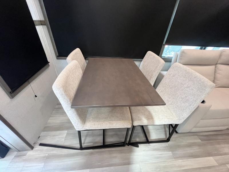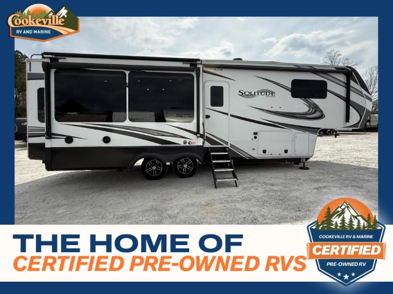 Each Solitude fifth wheel by Grand Design features a 101" wide-body construction, heavy duty 7,000 lb. axles, frameless tinted windows, and high-gloss gel coat sidewalls. You can camp year around thanks to the Weather-Tek Package that includes a 35K BTU high-capacity furnace, an all-in-one enclosed and heated utility center, and a fully enclosed underbelly with heated tanks and storage. Inside, you'll love the premium roller shades, hardwood cabinet doors, solid surface countertops and sinks, plus residential finishes throughout to make you truly feel at home. Each model also includes a MORryde CRE3000 suspension system, self adjusting brakes, and a MORryde pin box that will provide smooth towing from home to campground. Affordable luxury is possible with the Solitude fifth wheels; choose yours today!