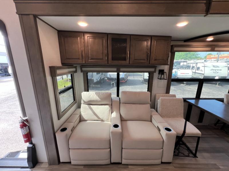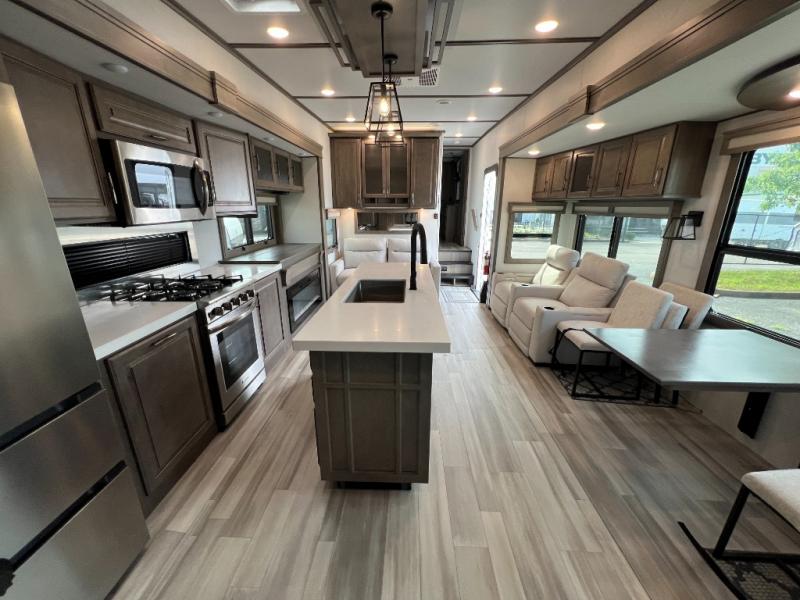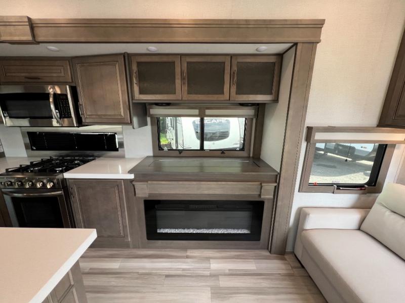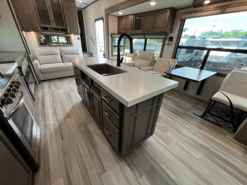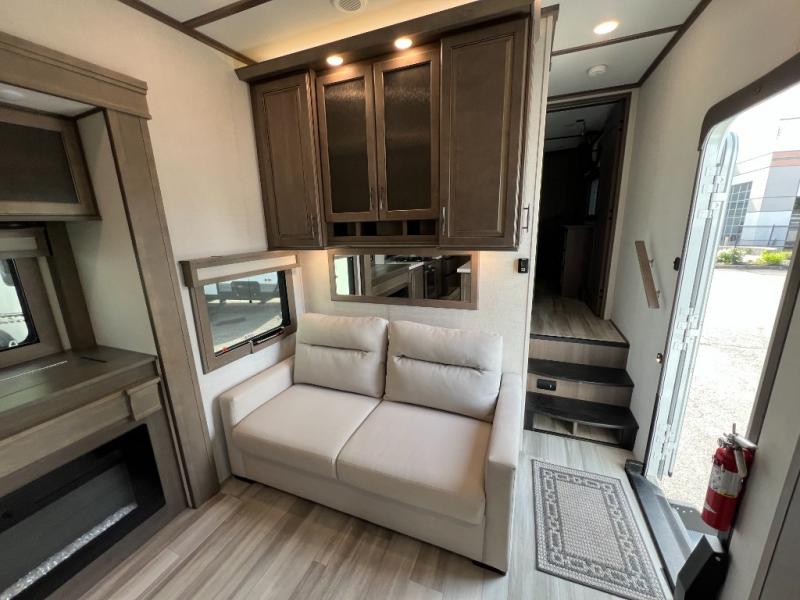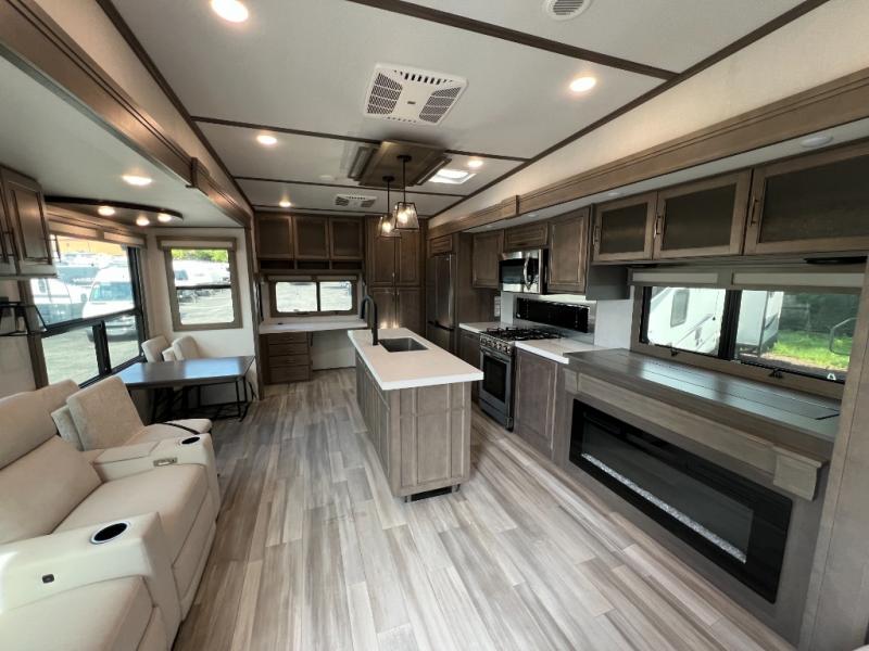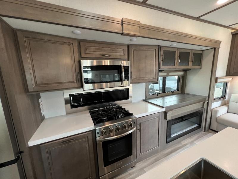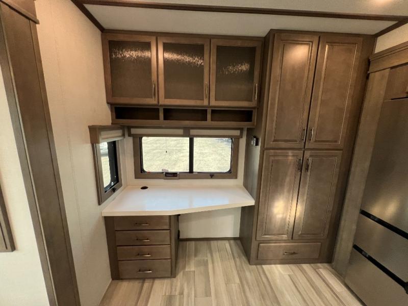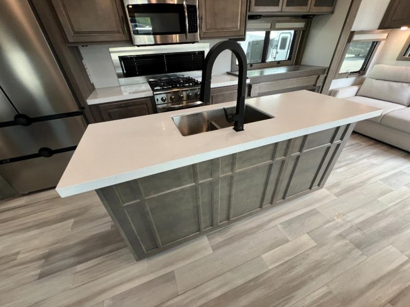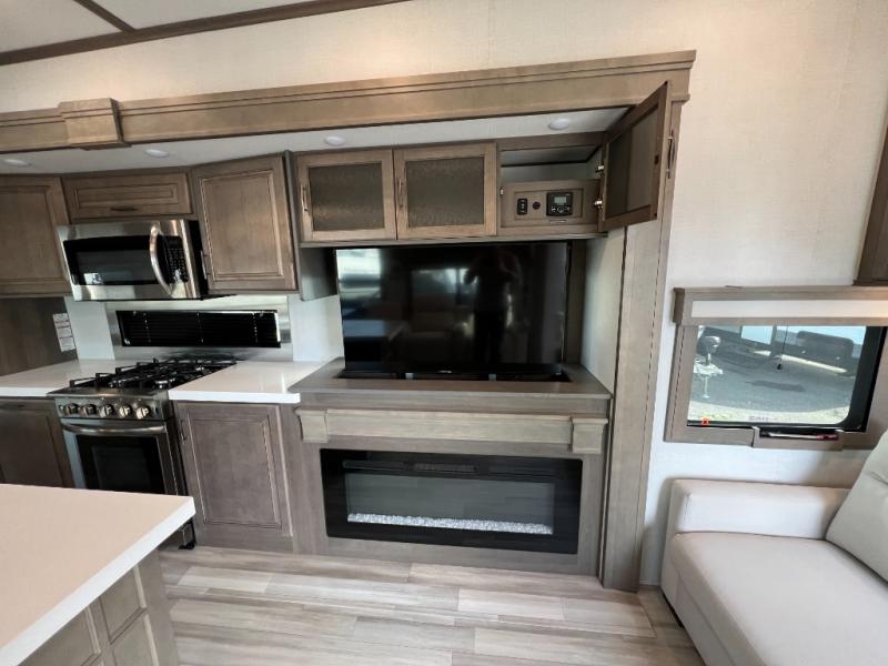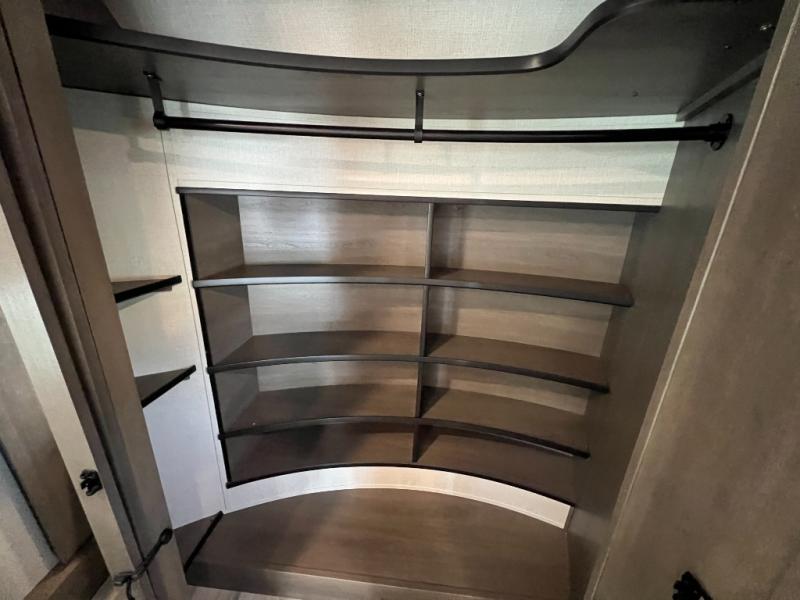 Love for traveling is enhanced when you are towing this fifth wheel. From the smooth tow to the comfortable and functional interior, you will feel right at home. You can even work at the rear desk with USB charging outlet and overhead cabinets or at the free-standing dinette with chairs while away, and relax on the theatre seats or the tri-fold sofa. The TV and fireplace add conveniences and comfort, and the kitchen is impressive with a 24" residential oven, island with a space for a dishwasher option, and oversized pantry. And you might like to add the exterior pull-out kitchen option for more choices when making meals. Be sure to place your shoes under the interior steps before heading to the full bathroom to get cleaned up or the front bedroom. The bedroom features a queen bed slide, or optional king, more USB charging outlets for your electronics, and a walk-in closet with mirrors plus a space prepped for an optional washer/dryer. You will also find a flip-top dresser with an LED TV.