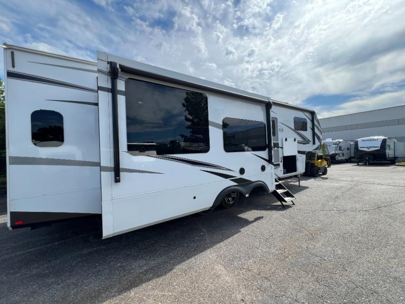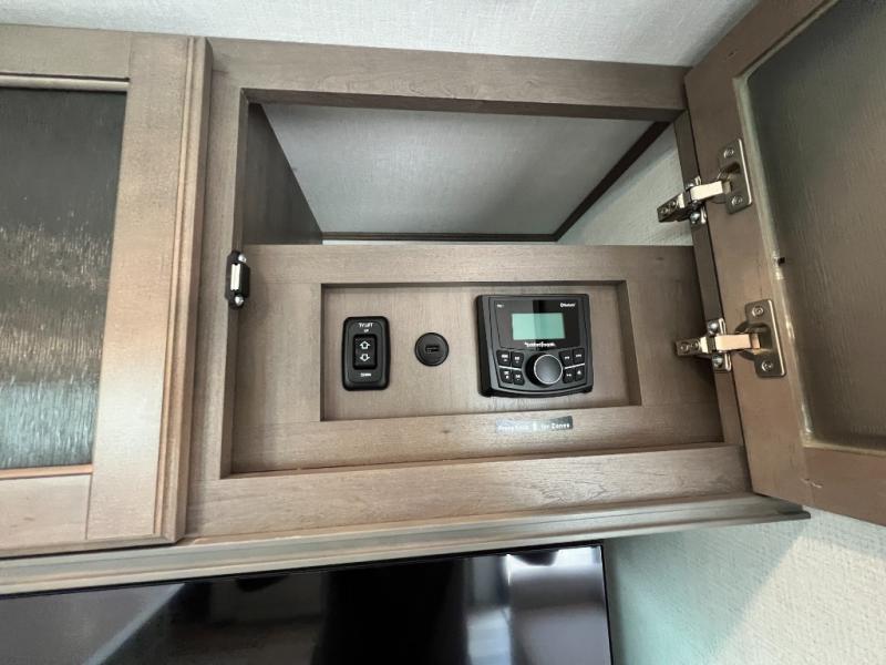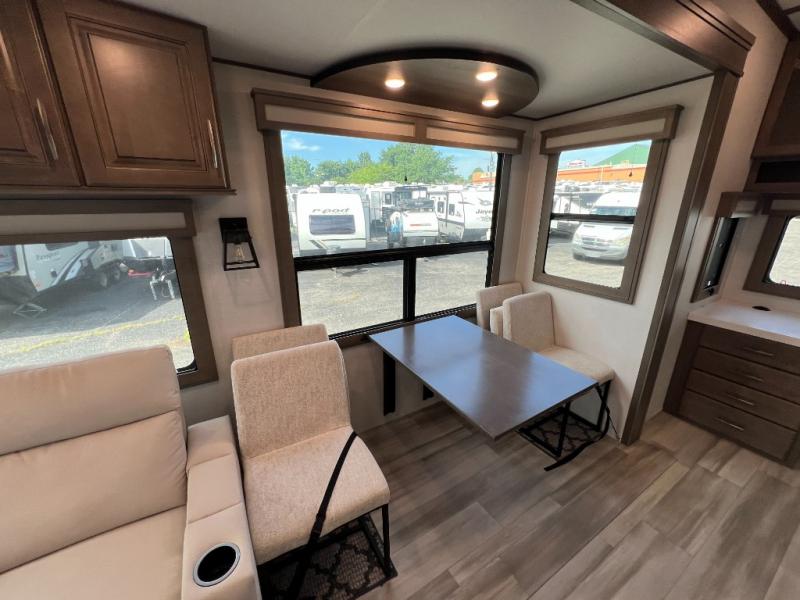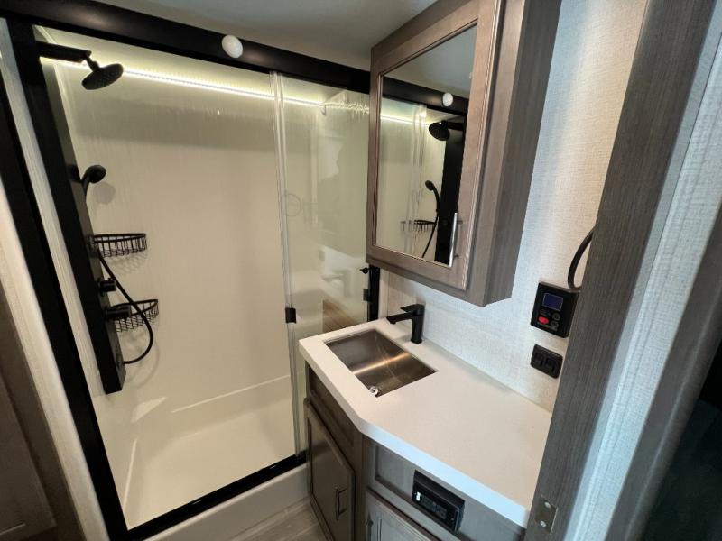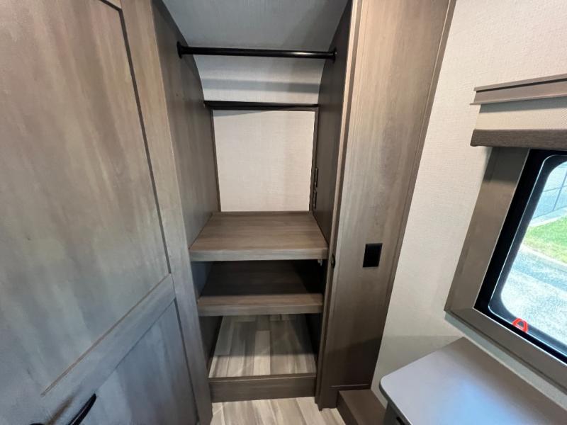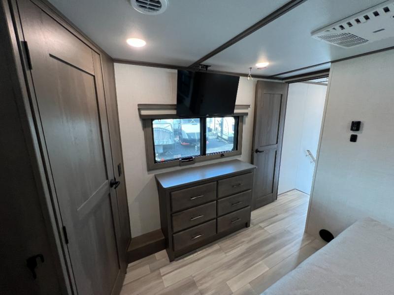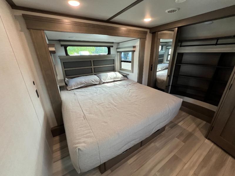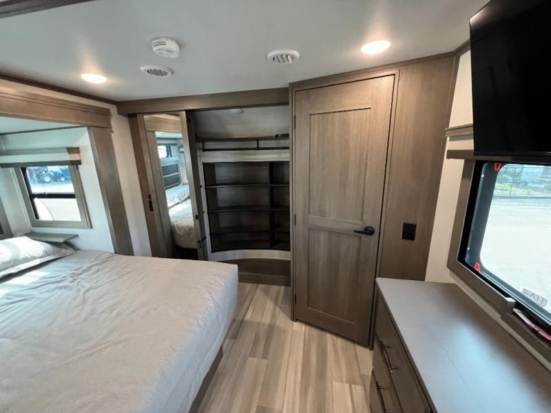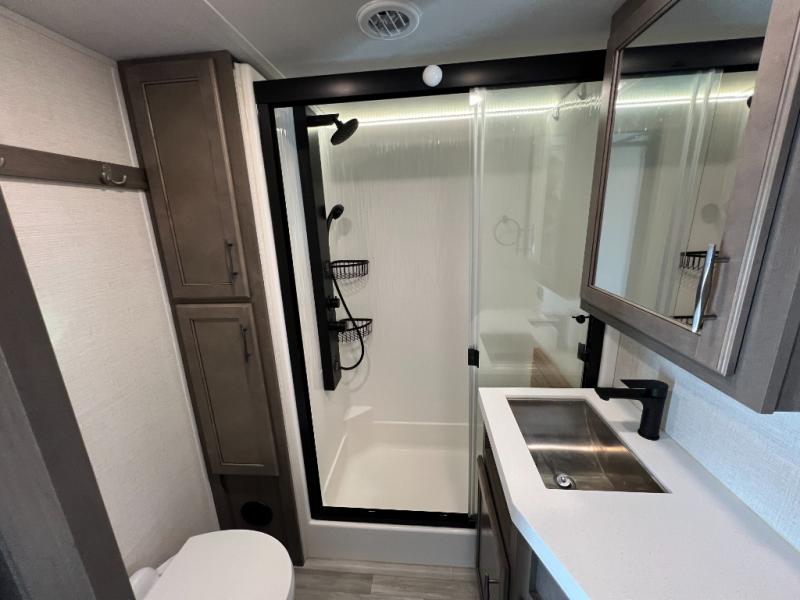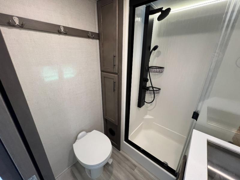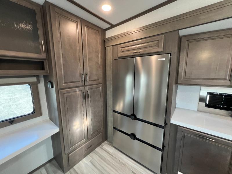 Love for traveling is enhanced when you are towing this fifth wheel. From the smooth tow to the comfortable and functional interior, you will feel right at home. You can even work at the rear desk with USB charging outlet and overhead cabinets or at the free-standing dinette with chairs while away, and relax on the theatre seats or the tri-fold sofa. The TV and fireplace add conveniences and comfort, and the kitchen is impressive with a 24" residential oven, island with a space for a dishwasher option, and oversized pantry. And you might like to add the exterior pull-out kitchen option for more choices when making meals. Be sure to place your shoes under the interior steps before heading to the full bathroom to get cleaned up or the front bedroom. The bedroom features a queen bed slide, or optional king, more USB charging outlets for your electronics, and a walk-in closet with mirrors plus a space prepped for an optional washer/dryer. You will also find a flip-top dresser with an LED TV.