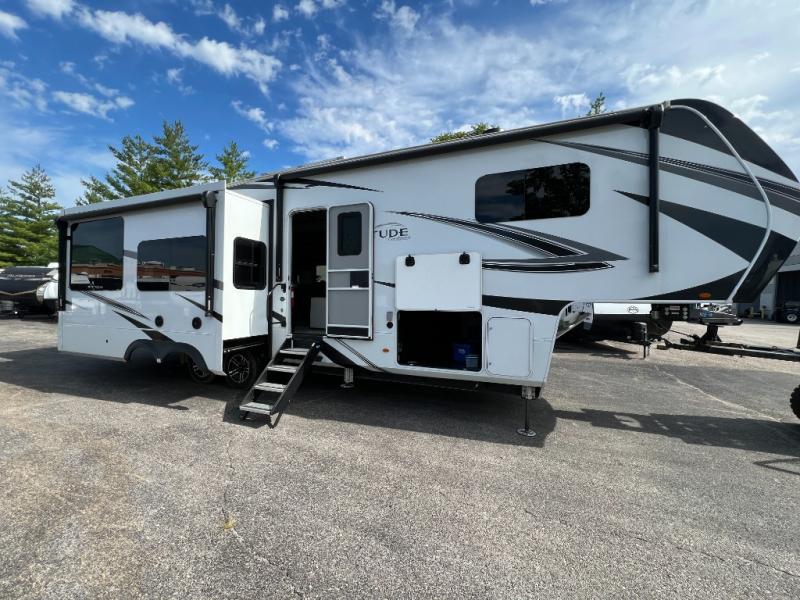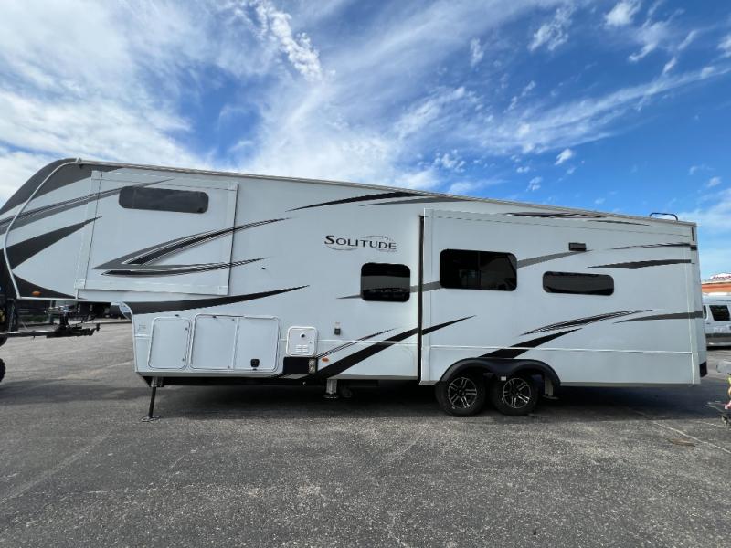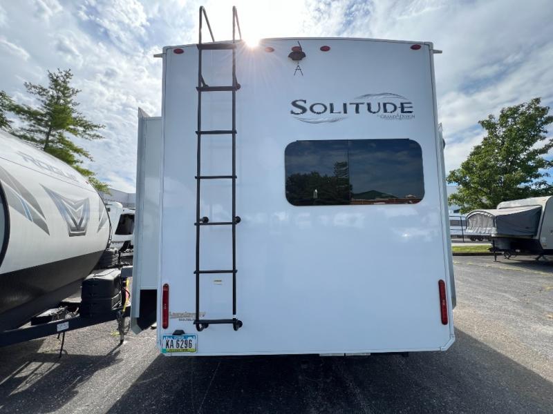 Each Solitude fifth wheel by Grand Design features a 101" wide-body construction, heavy duty 7,000 lb. axles, frameless tinted windows, and high-gloss gel coat sidewalls. You can camp year around thanks to the Weather-Tek Package that includes a 35K BTU high-capacity furnace, an all-in-one enclosed and heated utility center, and a fully enclosed underbelly with heated tanks and storage. Inside, you'll love the premium roller shades, hardwood cabinet doors, solid surface countertops and sinks, plus residential finishes throughout to make you truly feel at home. Each model also includes a MORryde CRE3000 suspension system, self adjusting brakes, and a MORryde pin box that will provide smooth towing from home to campground. Affordable luxury is possible with the Solitude fifth wheels; choose yours today!