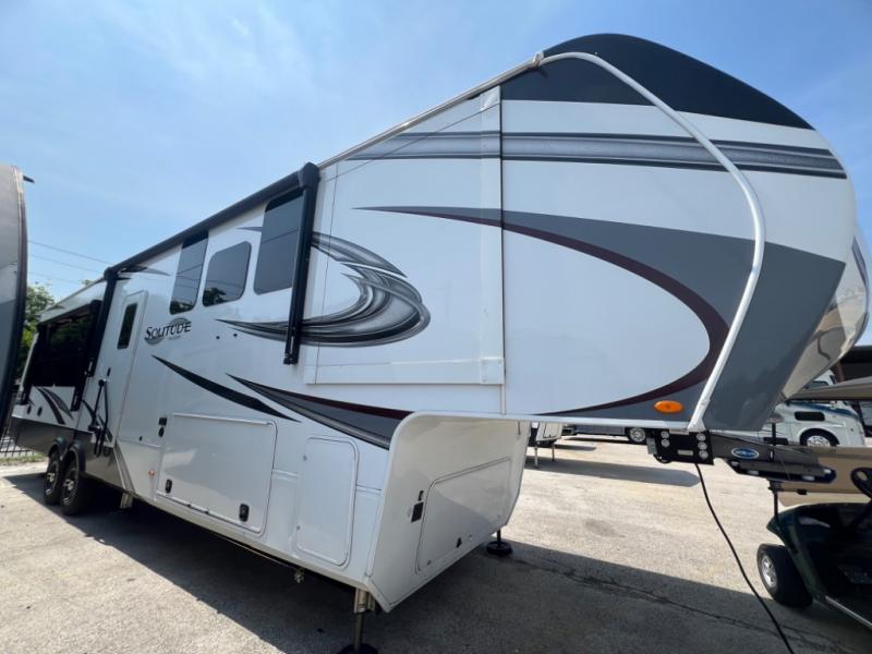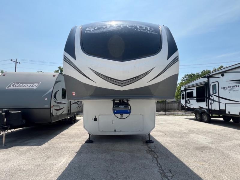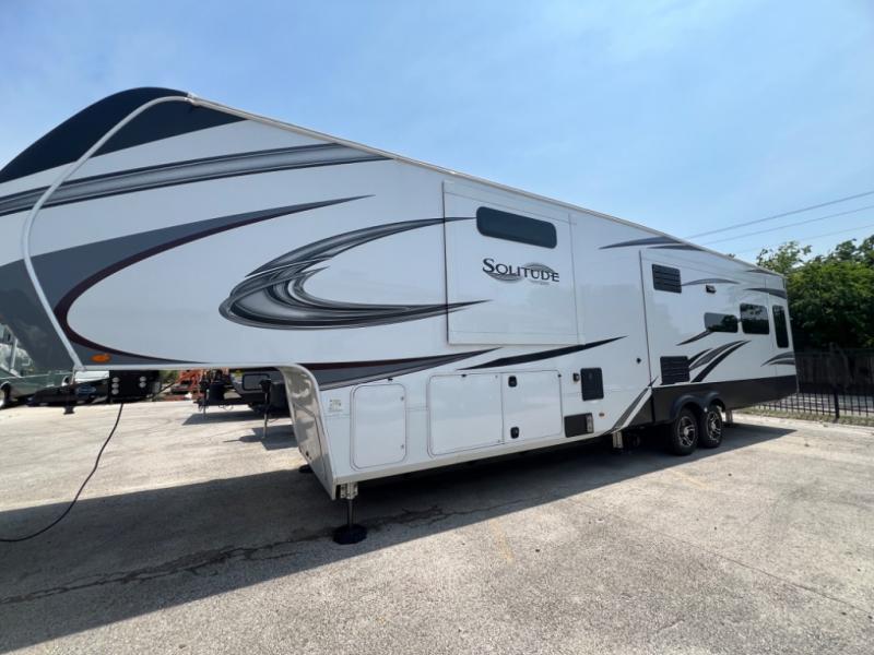 Each Solitude fifth wheel by Grand Design features a 101" wide-body construction, heavy duty 7,000 lb. axles, frameless tinted windows, and high-gloss gel coat sidewalls. You can camp year around thanks to the Weather-Tek Package that includes a 35K BTU high-capacity furnace, an all-in-one enclosed and heated utility center, and a fully enclosed underbelly with heated tanks and storage. Inside, you'll love the premium roller shades, hardwood cabinet doors, solid surface countertops and sinks, plus residential finishes throughout to make you truly feel at home. Each model also includes a MORryde CRE3000 suspension system, self adjusting brakes, and a MORryde pin box that will provide smooth towing from home to campground. Affordable luxury is possible with the Solitude fifth wheels; choose yours today!