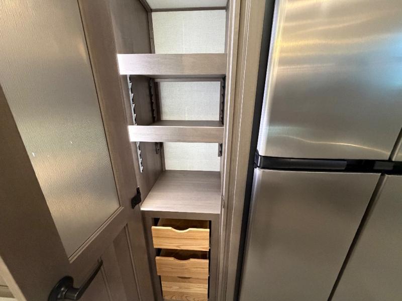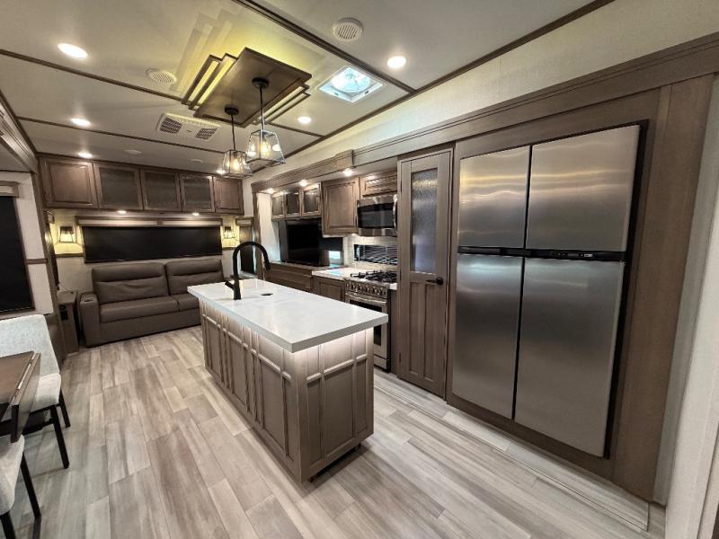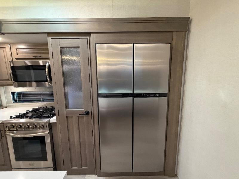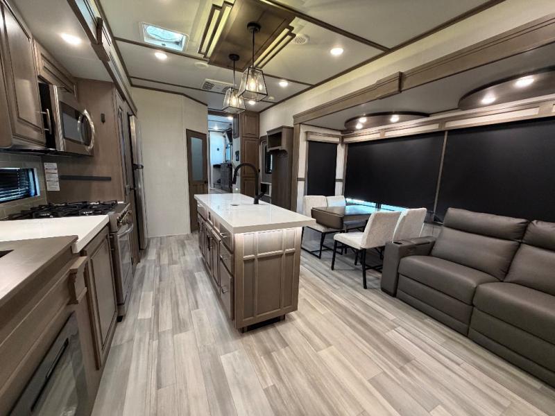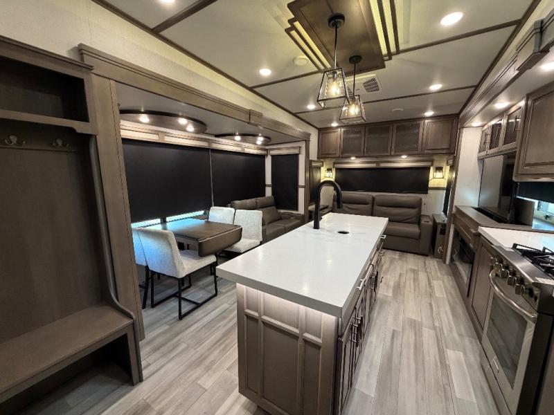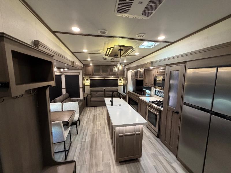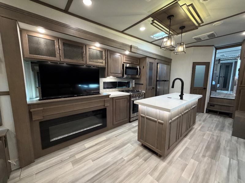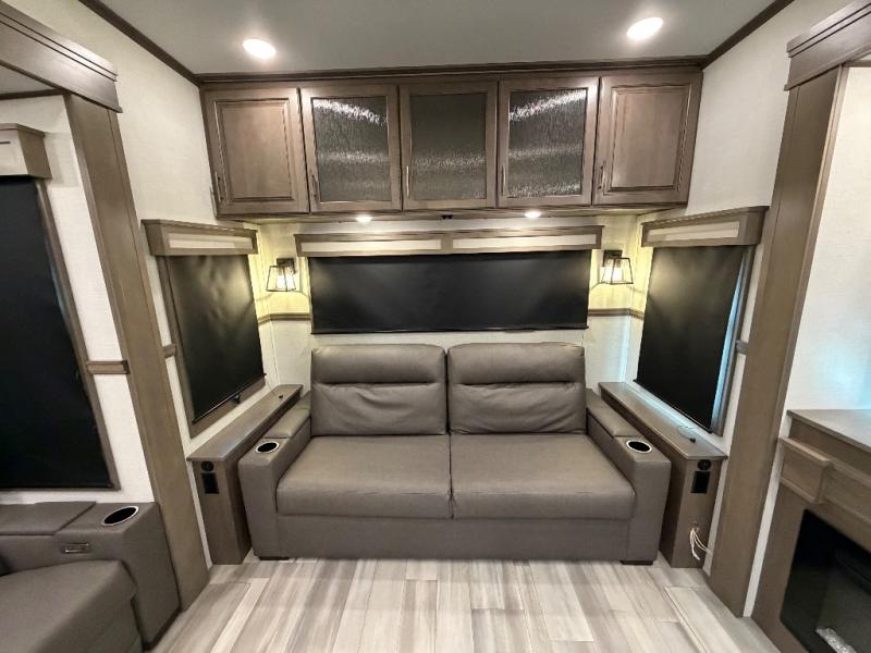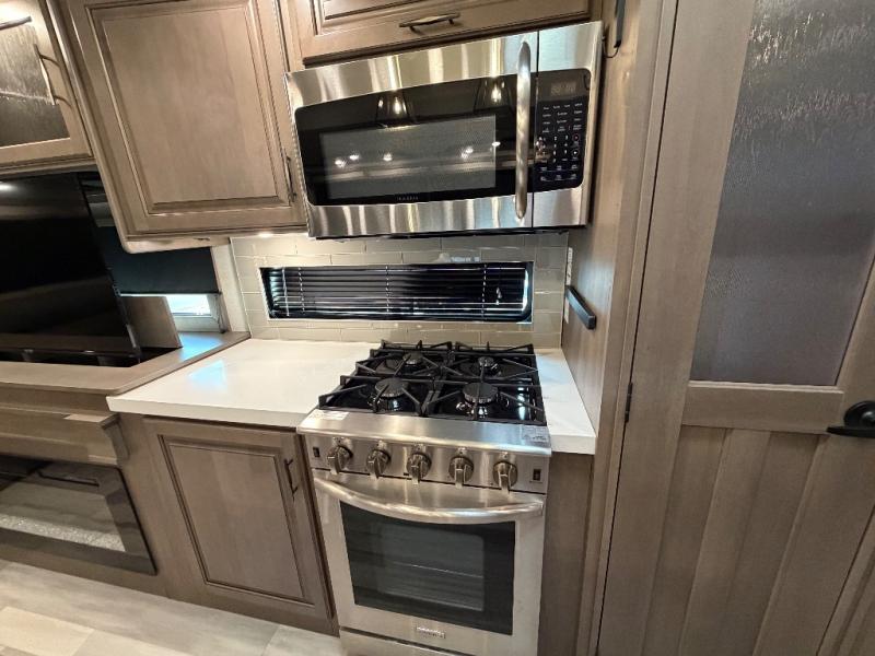 Convenient, spacious, and livable are a few of the words you will be thinking when you take this fifth wheel on your next excursion be it for a week-long trip or an extended stay! The kitchen and living area offer lots of floor space with dual opposing slides allowing you to visit with the cook while watching TV or enjoying the fireplace below. The tri-fold sofa doubles as extra sleeping space for guests, and you might never want to get up from the comfortable theatre seats. The kitchen offers a professional grade cooktop with built in 24" residential oven, an oversized pantry, and an island with a spot to add an optional dishwasher. And the half bathroom is conveniently located just a few steps from the entry. The walk-through bedroom provides a queen bed slide or choose the king option, two bench seats that are convenient when putting on your shoes, and a flip-top dresser and an LED TV for watching in bed. You will find storage throughout including under the interior steps, in multiple overhead cabinets, as well as along the exterior for your outdoor gear. And, the two power awnings offer an outdoor living area protected from the elements.