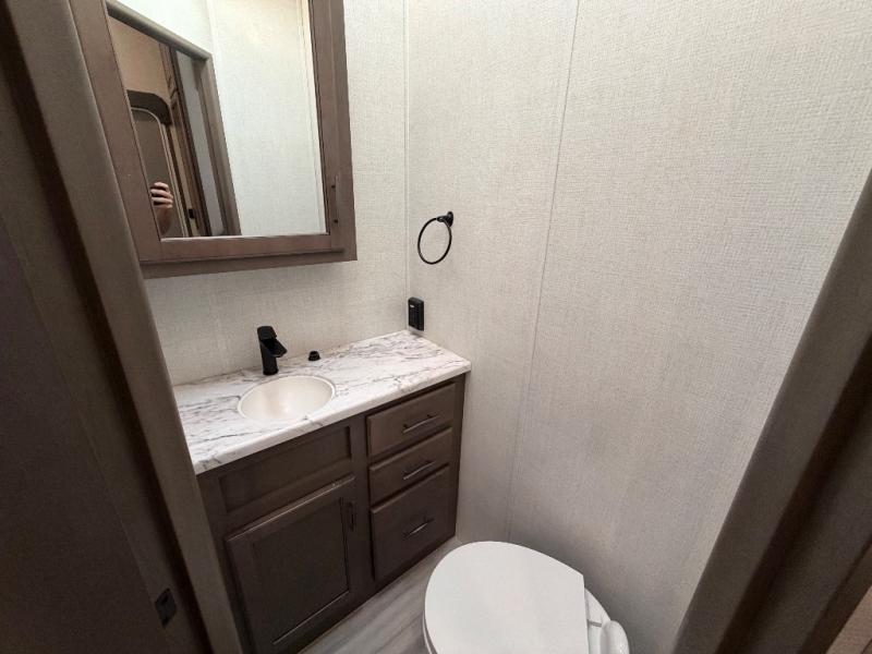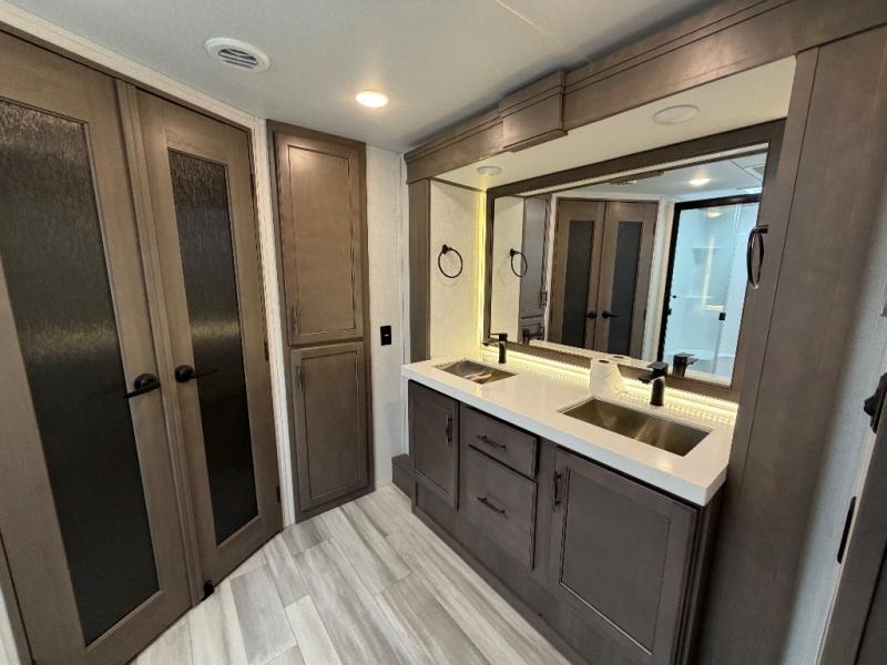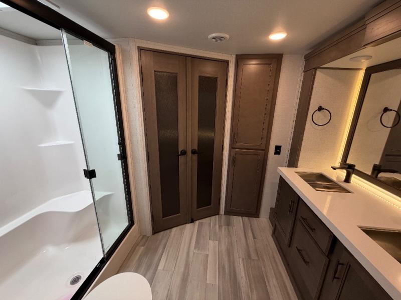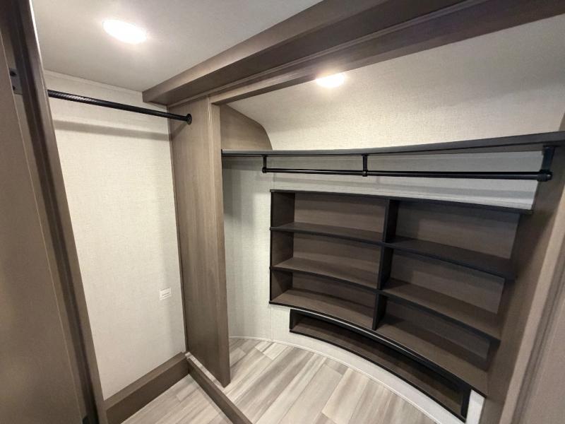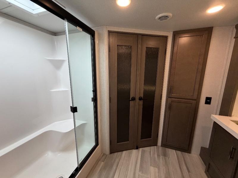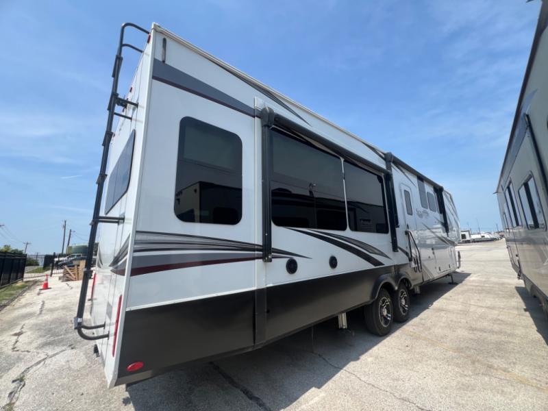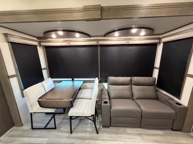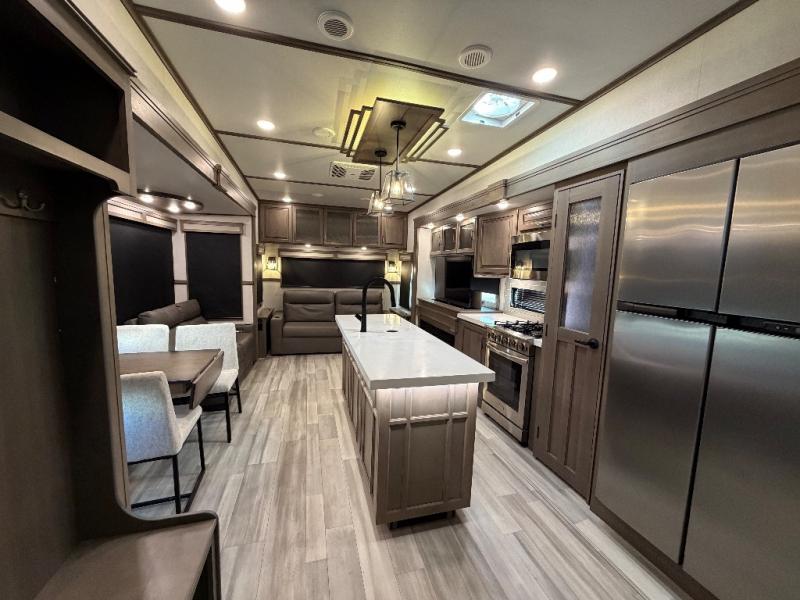 Convenient, spacious, and livable are a few of the words you will be thinking when you take this fifth wheel on your next excursion be it for a week-long trip or an extended stay! The kitchen and living area offer lots of floor space with dual opposing slides allowing you to visit with the cook while watching TV or enjoying the fireplace below. The tri-fold sofa doubles as extra sleeping space for guests, and you might never want to get up from the comfortable theatre seats. The kitchen offers a professional grade cooktop with built in 24" residential oven, an oversized pantry, and an island with a spot to add an optional dishwasher. And the half bathroom is conveniently located just a few steps from the entry. The walk-through bedroom provides a queen bed slide or choose the king option, two bench seats that are convenient when putting on your shoes, and a flip-top dresser and an LED TV for watching in bed. You will find storage throughout including under the interior steps, in multiple overhead cabinets, as well as along the exterior for your outdoor gear. And, the two power awnings offer an outdoor living area protected from the elements.