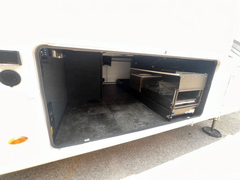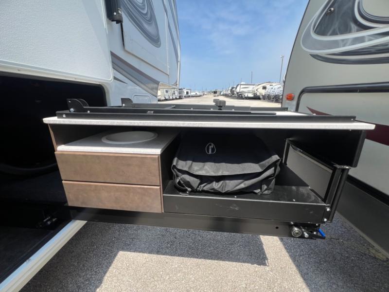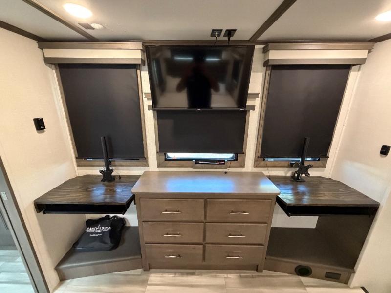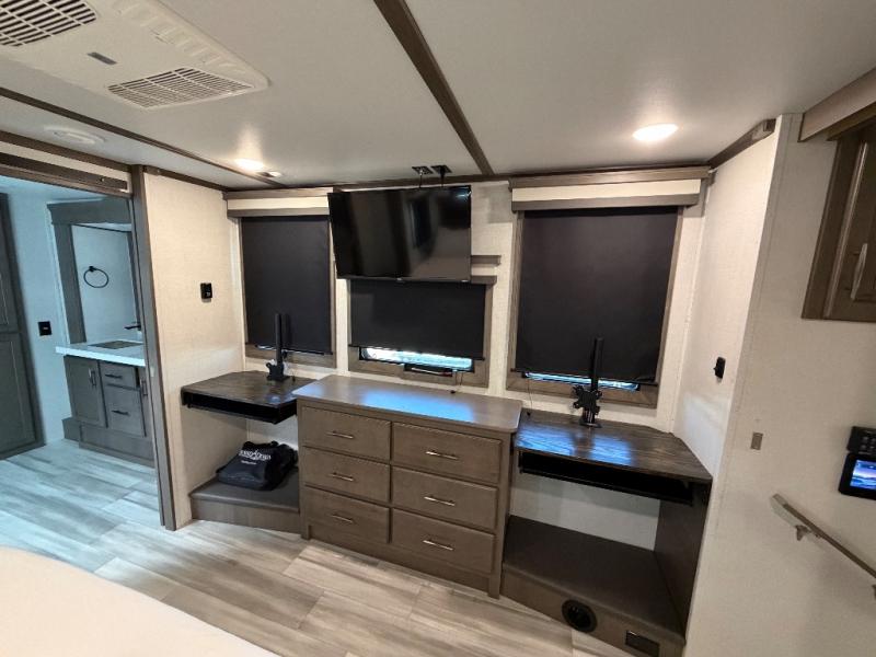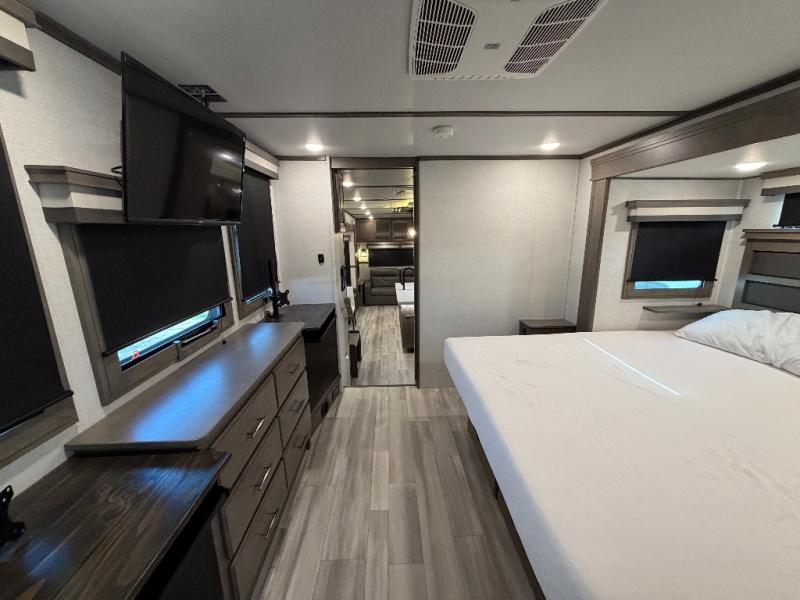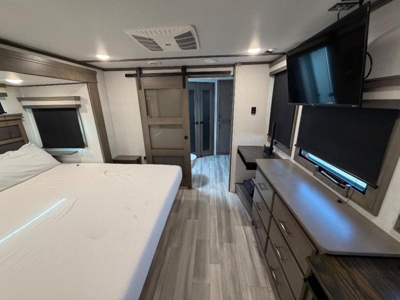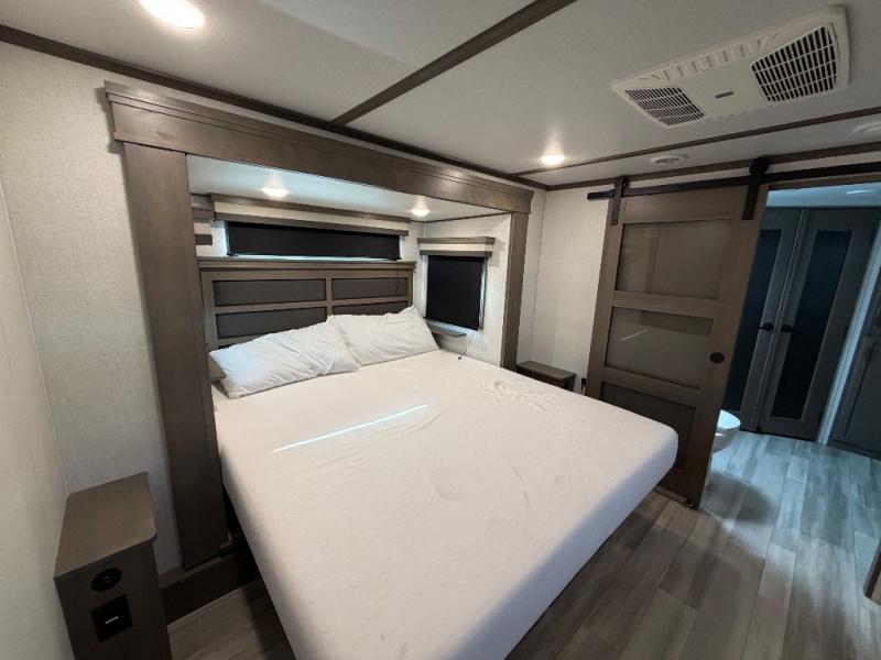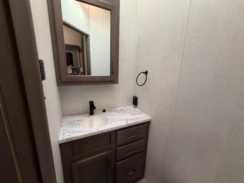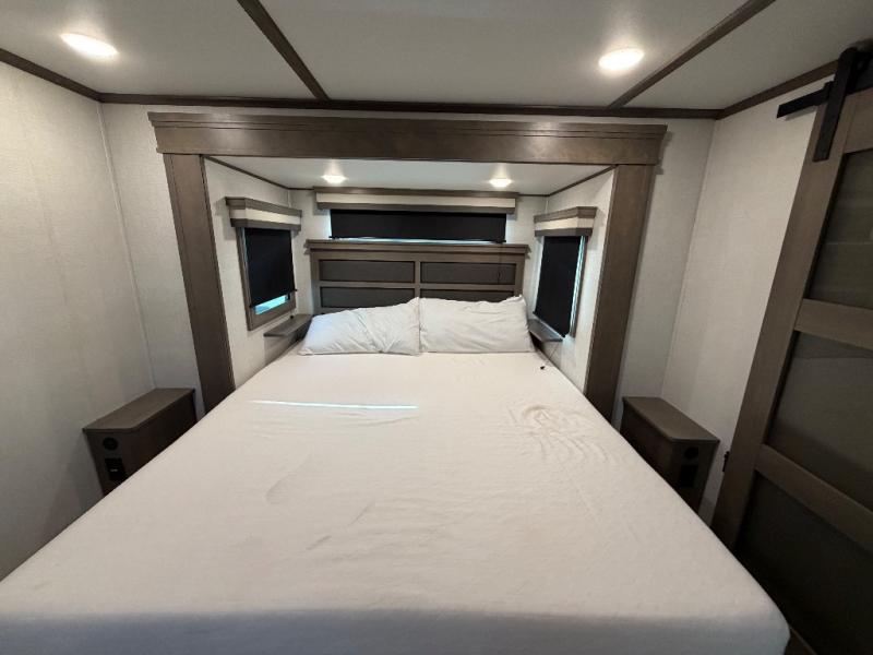 Convenient, spacious, and livable are a few of the words you will be thinking when you take this fifth wheel on your next excursion be it for a week-long trip or an extended stay! The kitchen and living area offer lots of floor space with dual opposing slides allowing you to visit with the cook while watching TV or enjoying the fireplace below. The tri-fold sofa doubles as extra sleeping space for guests, and you might never want to get up from the comfortable theatre seats. The kitchen offers a professional grade cooktop with built in 24" residential oven, an oversized pantry, and an island with a spot to add an optional dishwasher. And the half bathroom is conveniently located just a few steps from the entry. The walk-through bedroom provides a queen bed slide or choose the king option, two bench seats that are convenient when putting on your shoes, and a flip-top dresser and an LED TV for watching in bed. You will find storage throughout including under the interior steps, in multiple overhead cabinets, as well as along the exterior for your outdoor gear. And, the two power awnings offer an outdoor living area protected from the elements.