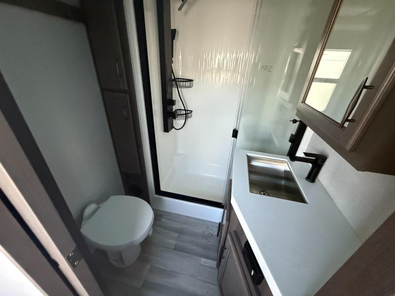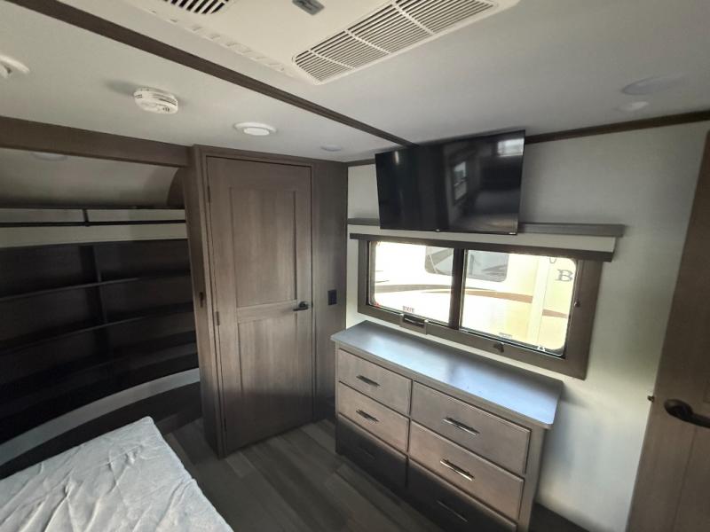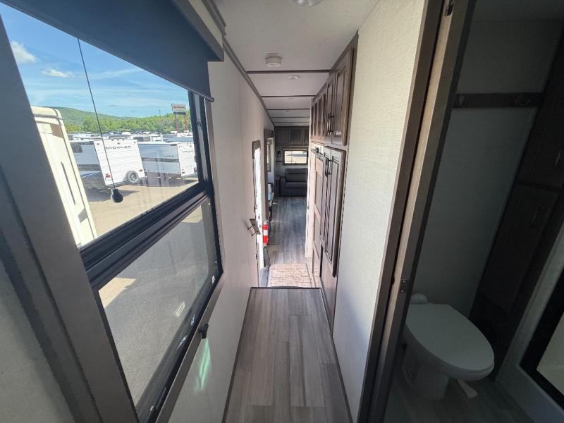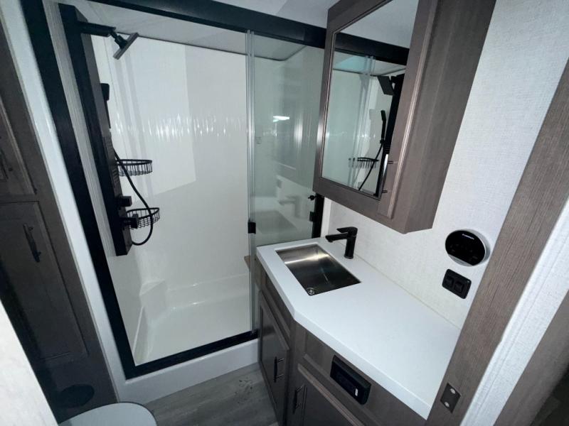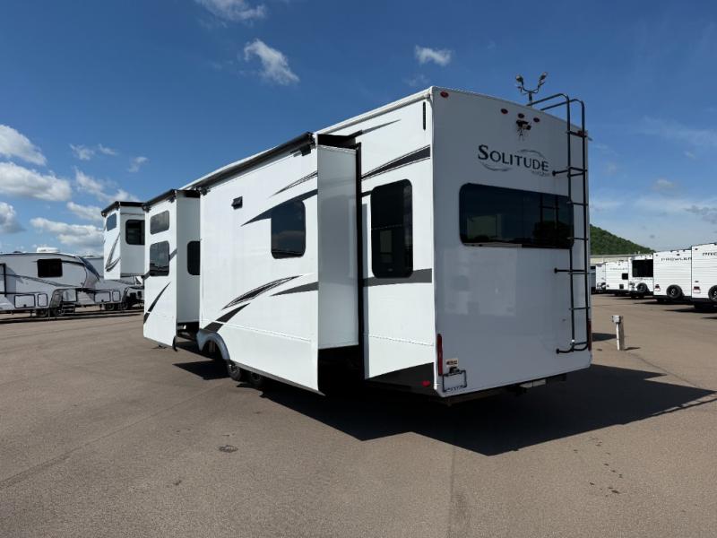 Each Solitude fifth wheel by Grand Design features a 101" wide-body construction, heavy duty 7,000 lb. axles, frameless tinted windows, and high-gloss gel coat sidewalls. You can camp year around thanks to the Weather-Tek Package that includes a 35K BTU high-capacity furnace, an all-in-one enclosed and heated utility center, and a fully enclosed underbelly with heated tanks and storage. Inside, you'll love the premium roller shades, hardwood cabinet doors, solid surface countertops and sinks, plus residential finishes throughout to make you truly feel at home. Each model also includes a MORryde CRE3000 suspension system, self adjusting brakes, and a MORryde pin box that will provide smooth towing from home to campground. Affordable luxury is possible with the Solitude fifth wheels; choose yours today!