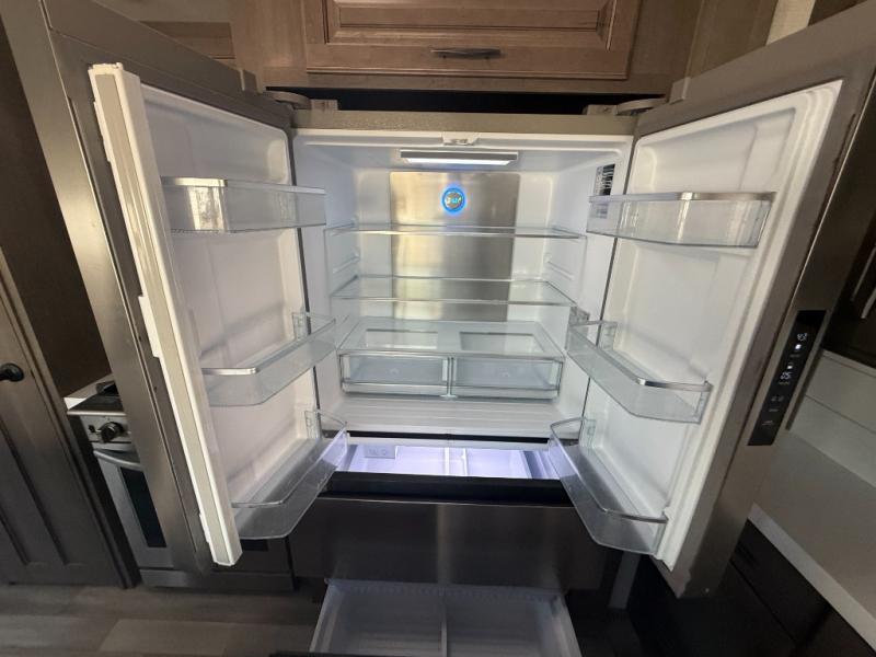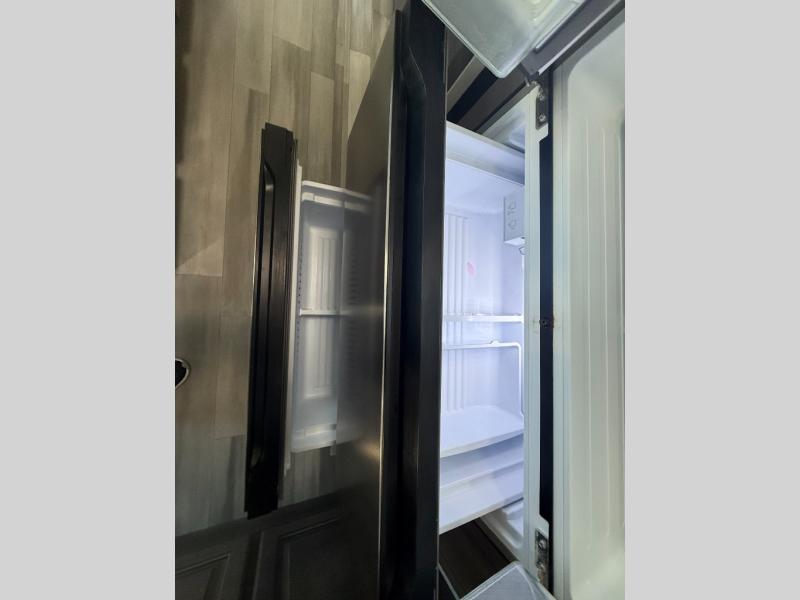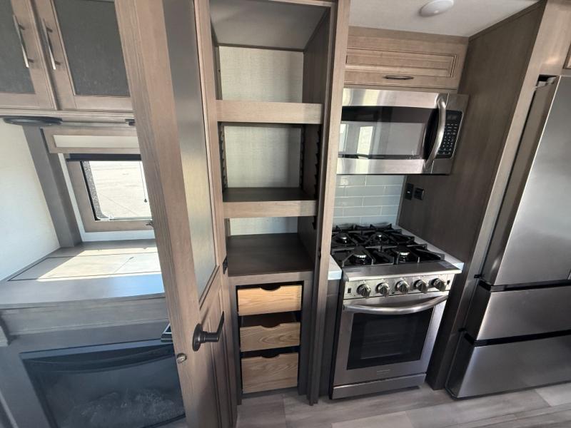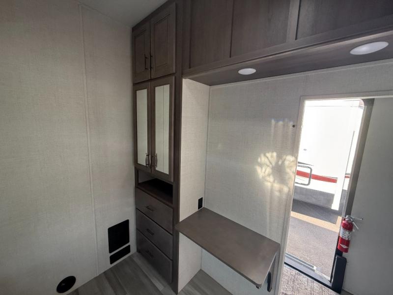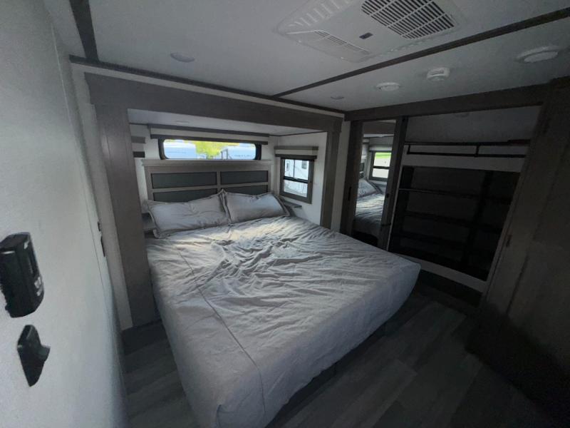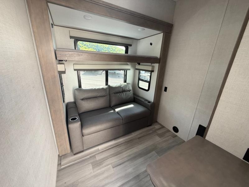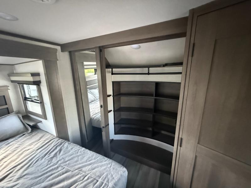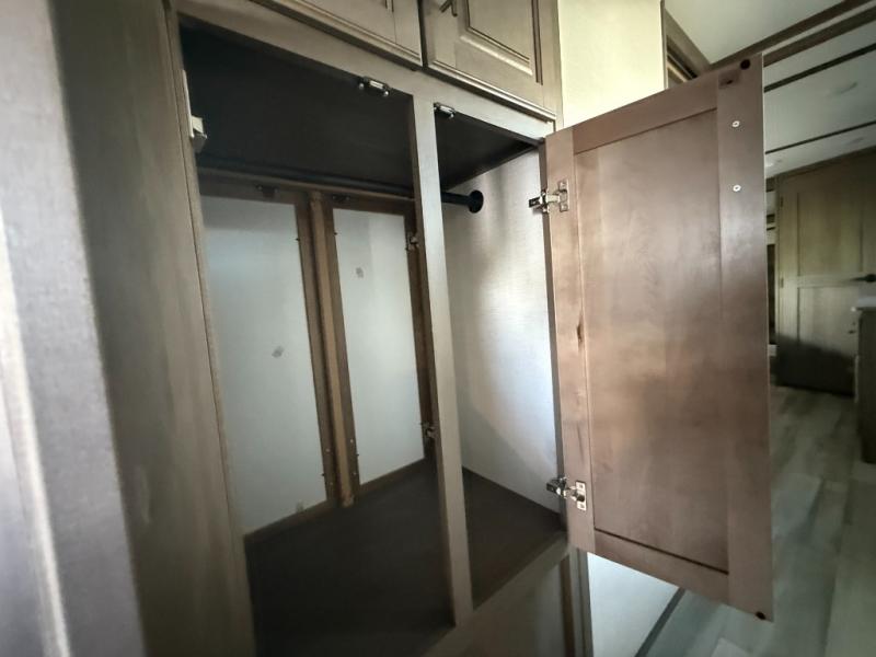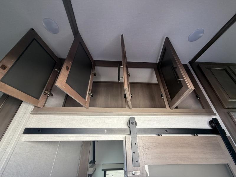 The middle bunkhouse in this fifth wheel includes a fold down bunk above a tri-fold sofa which offers seating for extra living space as well as sleeping space for a bedroom, plus there is a desk to work from and a closet for clothing and supplies making this room multi-functional. The front master bedroom features a queen bed slide or choose the king option, an LED TV, and a large closet as well as a space prepped for a washer/dryer option. The main combined living and kitchen area is spacious with dual opposing slides and offers theatre seating and a tri-fold sofa to relax on while watching the LED Smart TV allowing you to visit with the cook in the kitchen while preparing meals. This chef kitchen offers an island with prep space and a sink, a 24" residential oven, a 20 cu. ft. refrigerator, and an oversized pantry to store lots of dry goods and snacks. You will surely enjoy the two power awnings and the outside grill plus beverage cooler while relaxing outdoors.