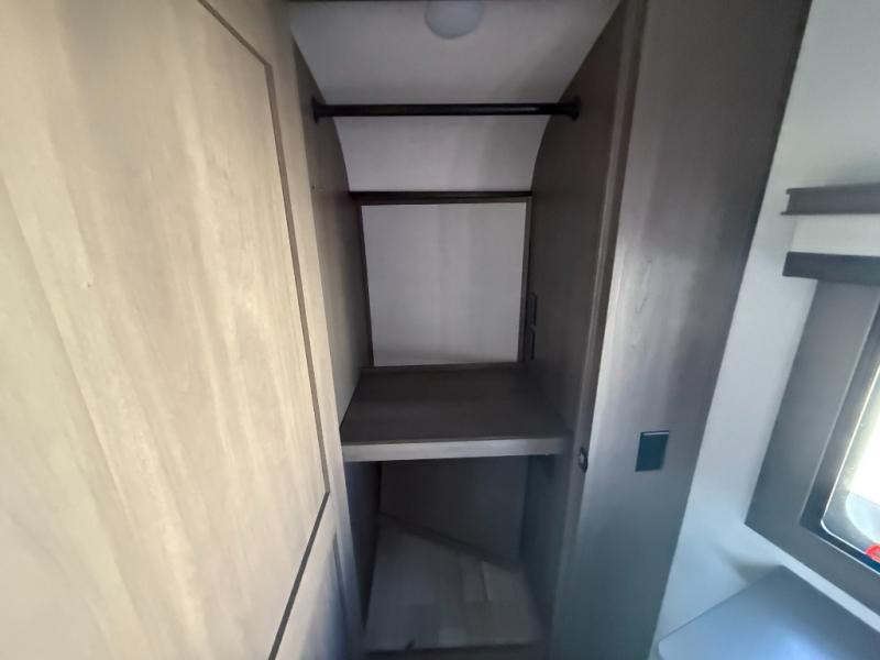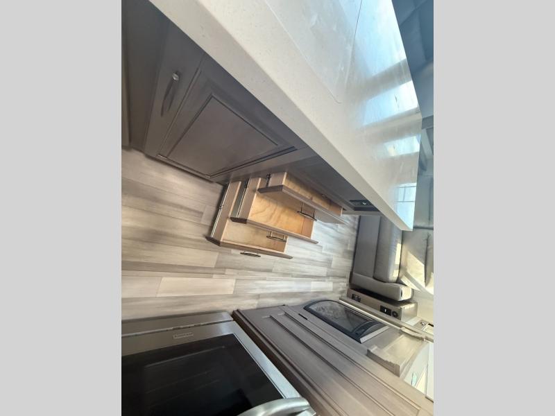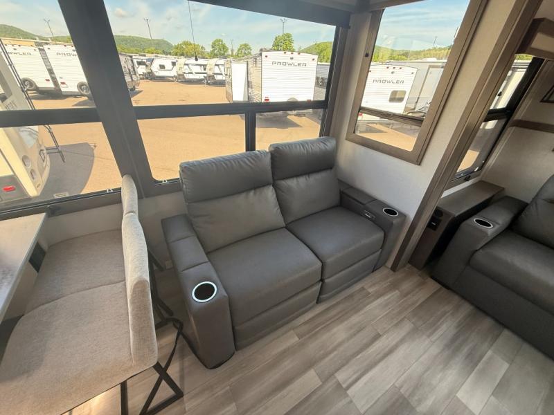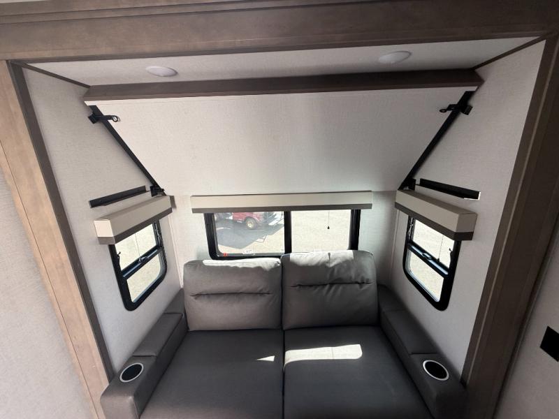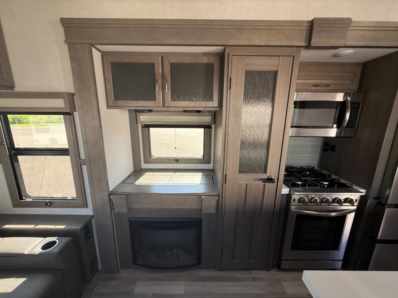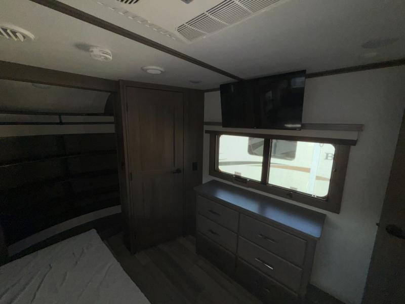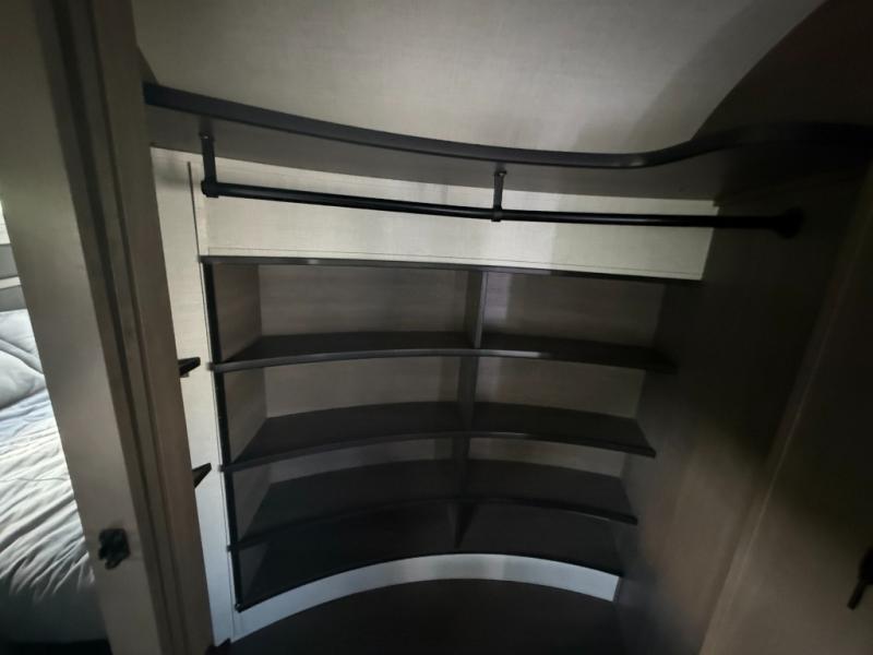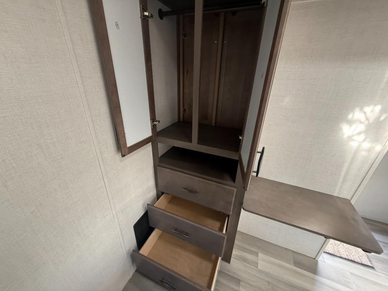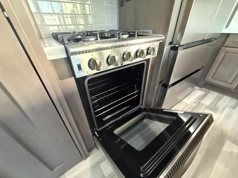 The middle bunkhouse in this fifth wheel includes a fold down bunk above a tri-fold sofa which offers seating for extra living space as well as sleeping space for a bedroom, plus there is a desk to work from and a closet for clothing and supplies making this room multi-functional. The front master bedroom features a queen bed slide or choose the king option, an LED TV, and a large closet as well as a space prepped for a washer/dryer option. The main combined living and kitchen area is spacious with dual opposing slides and offers theatre seating and a tri-fold sofa to relax on while watching the LED Smart TV allowing you to visit with the cook in the kitchen while preparing meals. This chef kitchen offers an island with prep space and a sink, a 24" residential oven, a 20 cu. ft. refrigerator, and an oversized pantry to store lots of dry goods and snacks. You will surely enjoy the two power awnings and the outside grill plus beverage cooler while relaxing outdoors.