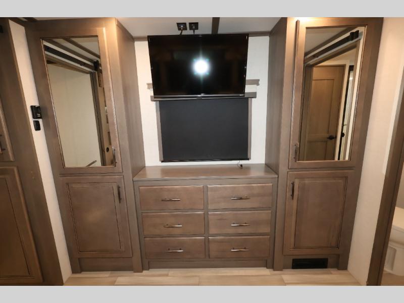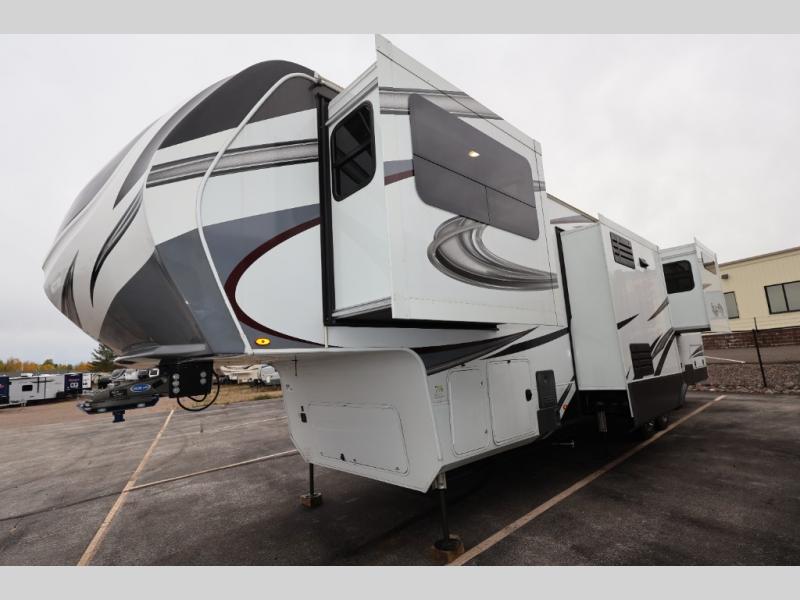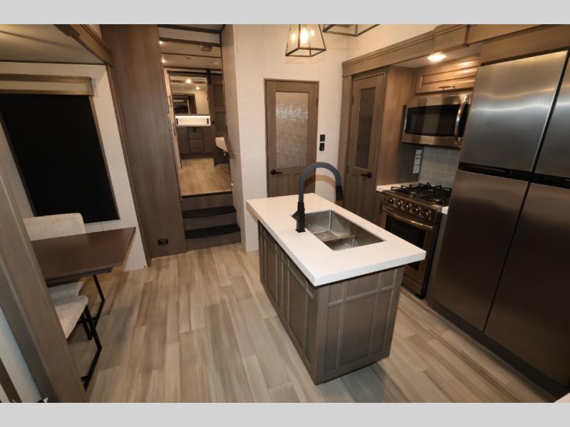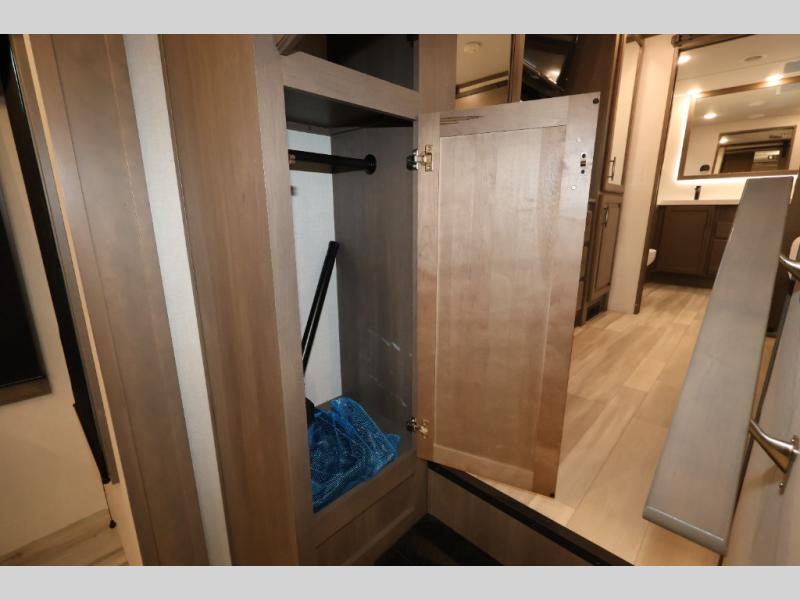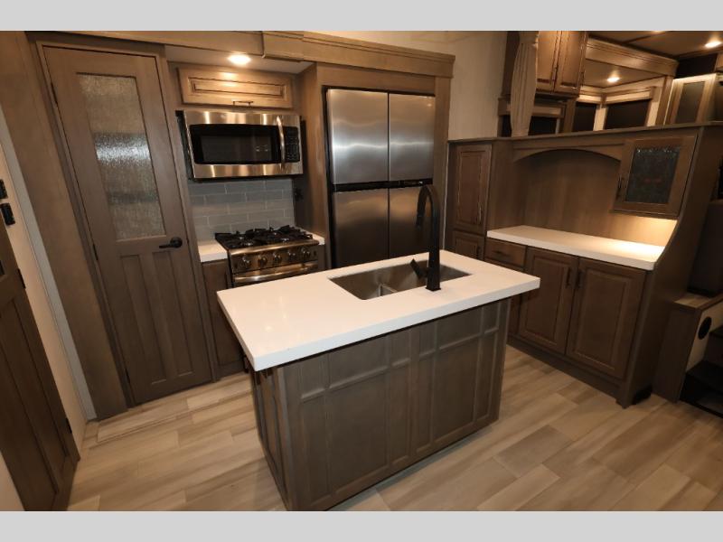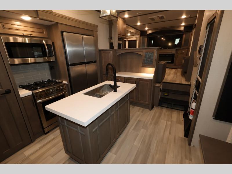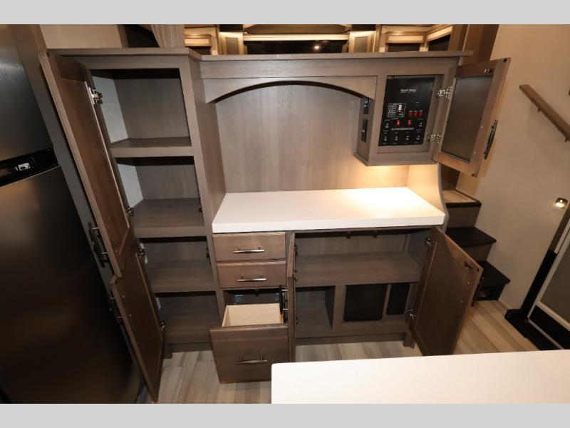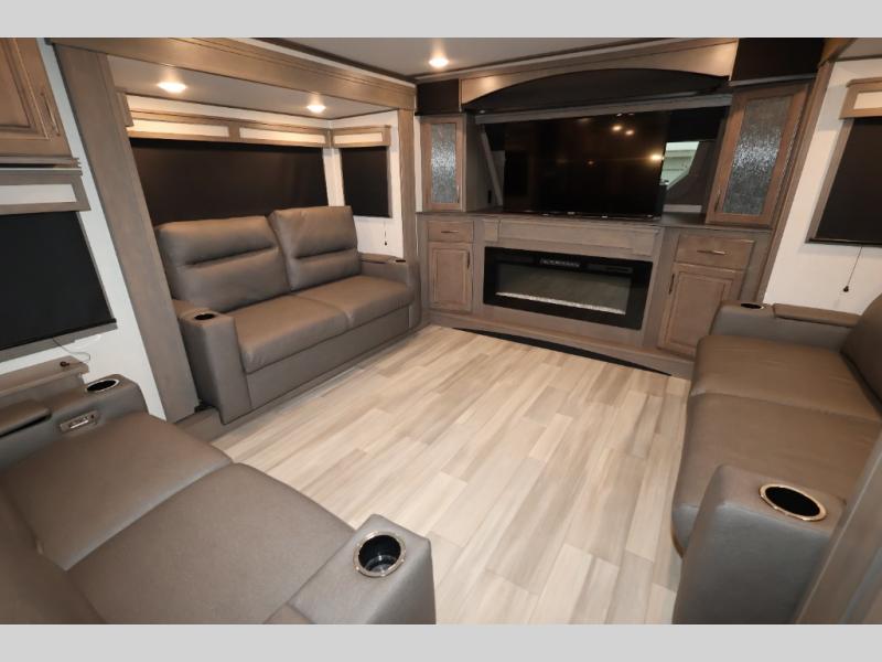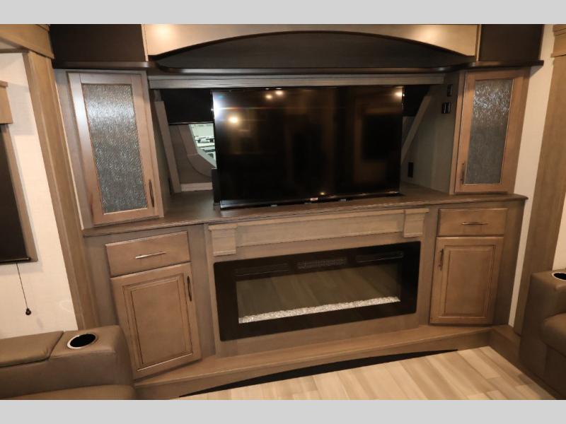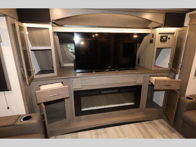 Five slide outs, a full bathroom with dual sinks, a half bath off of the kitchen, and a separate front living room and entertainment area are a few reasons you will enjoy your time spent in this fifth wheel! The separate kitchen is a dream with stainless steel appliances including a 24" residential oven, a pantry and hutch with counter space, a kitchen island plus a free-standing dinette slide with windows for great views. The entertainment center offers an LED Smart TV with a fireplace below and storage, and the dual opposing tri-fold sofas provide added sleeping space at night. The master bedroom includes a queen bed, LED TV and storage, plus space savings sliding doors that lead you to the rear full bathroom with dual sinks, linen storage, and space prepped for a washer/dryer option. You will find more storage throughout the fifth wheel in the overhead cabinets, the entry closet, and even your shoes have a spot under the interior steps leading to the front living/entertainment room. The exterior has several storage choices as well including a pass-through compartment for fishing poles and such, plus the unique sliding tray in the rear allows you to bring along larger items such as camping tables, portable grills, golf clubs, totes and more.