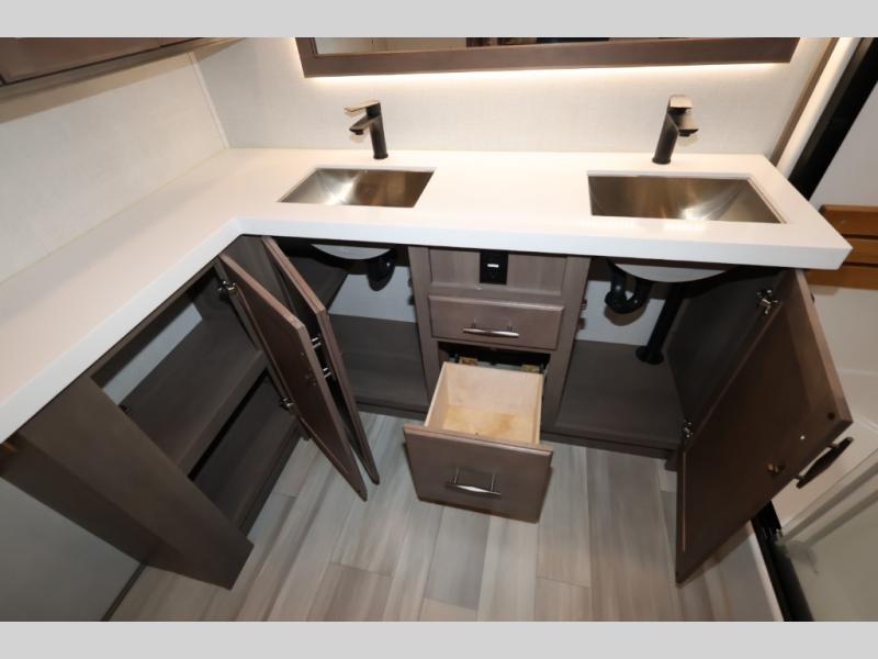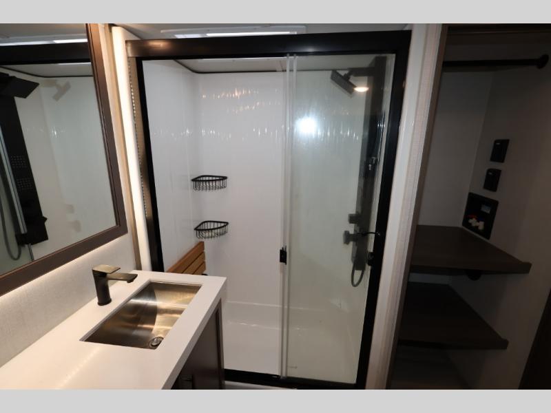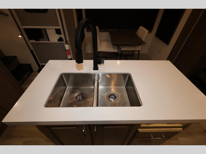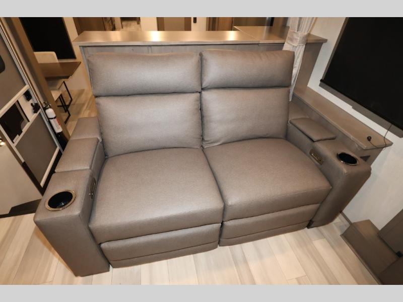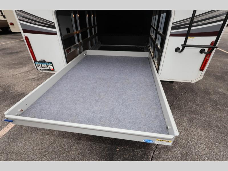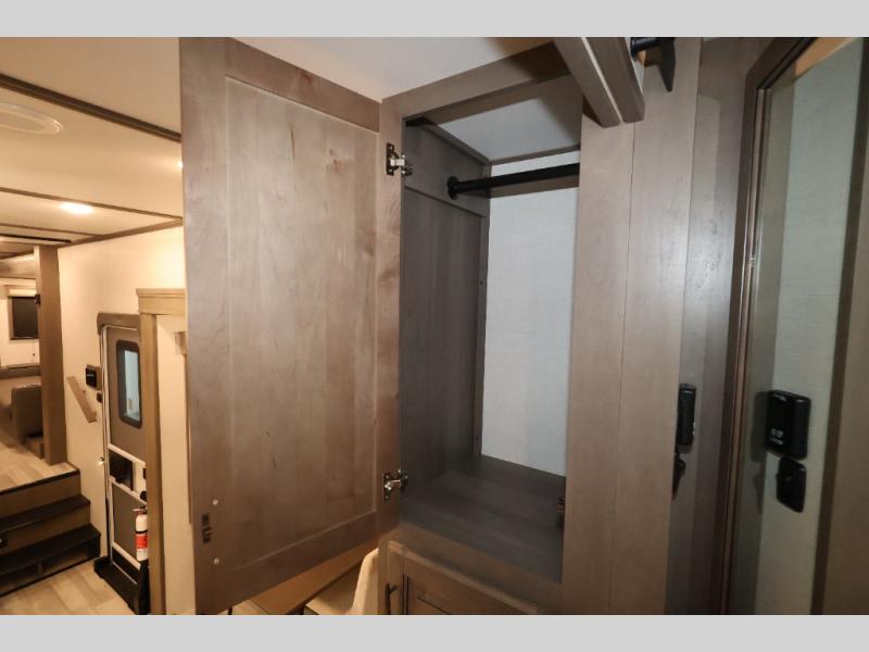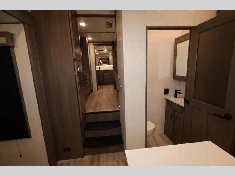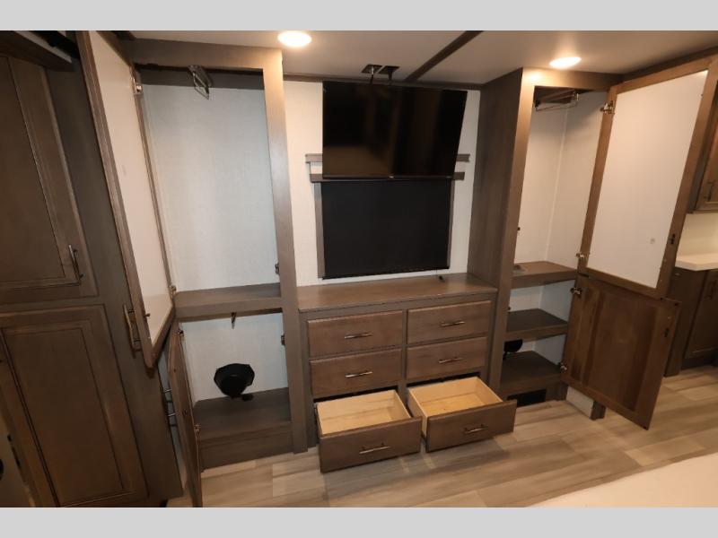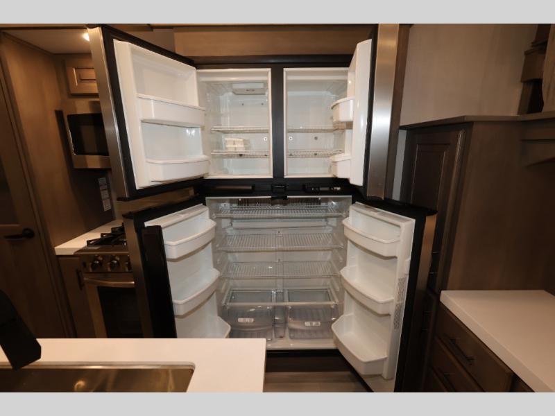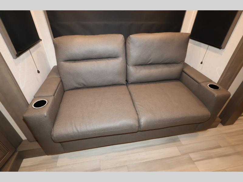 Five slide outs, a full bathroom with dual sinks, a half bath off of the kitchen, and a separate front living room and entertainment area are a few reasons you will enjoy your time spent in this fifth wheel! The separate kitchen is a dream with stainless steel appliances including a 24" residential oven, a pantry and hutch with counter space, a kitchen island plus a free-standing dinette slide with windows for great views. The entertainment center offers an LED Smart TV with a fireplace below and storage, and the dual opposing tri-fold sofas provide added sleeping space at night. The master bedroom includes a queen bed, LED TV and storage, plus space savings sliding doors that lead you to the rear full bathroom with dual sinks, linen storage, and space prepped for a washer/dryer option. You will find more storage throughout the fifth wheel in the overhead cabinets, the entry closet, and even your shoes have a spot under the interior steps leading to the front living/entertainment room. The exterior has several storage choices as well including a pass-through compartment for fishing poles and such, plus the unique sliding tray in the rear allows you to bring along larger items such as camping tables, portable grills, golf clubs, totes and more.