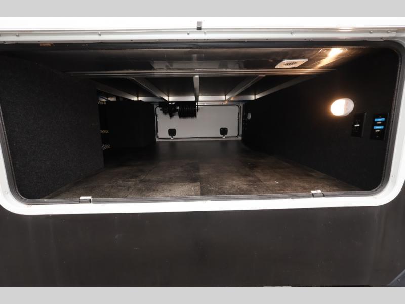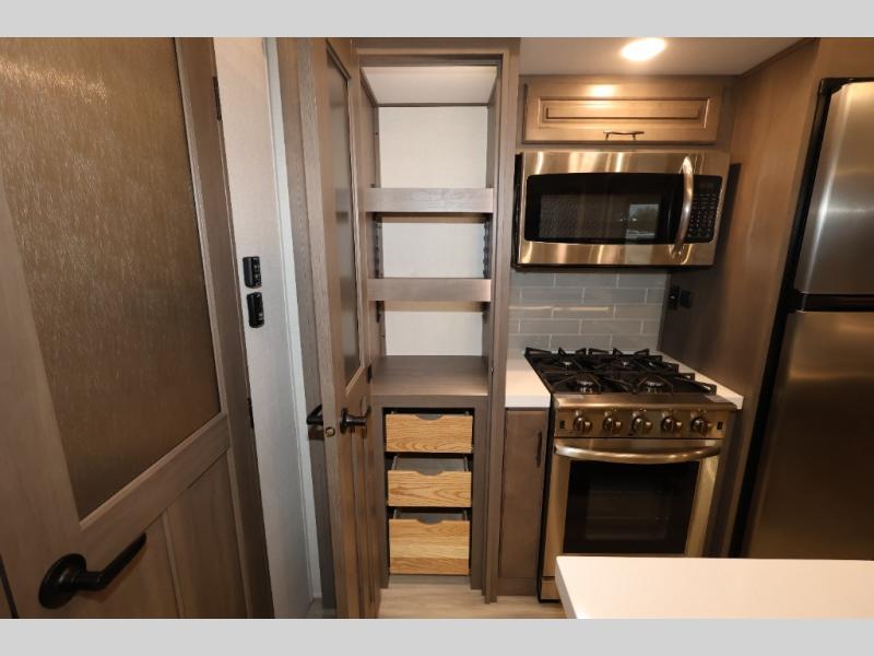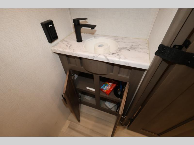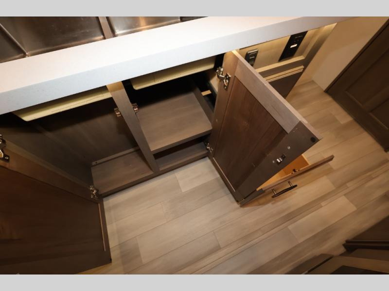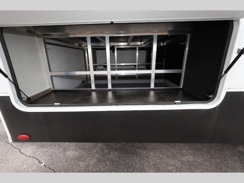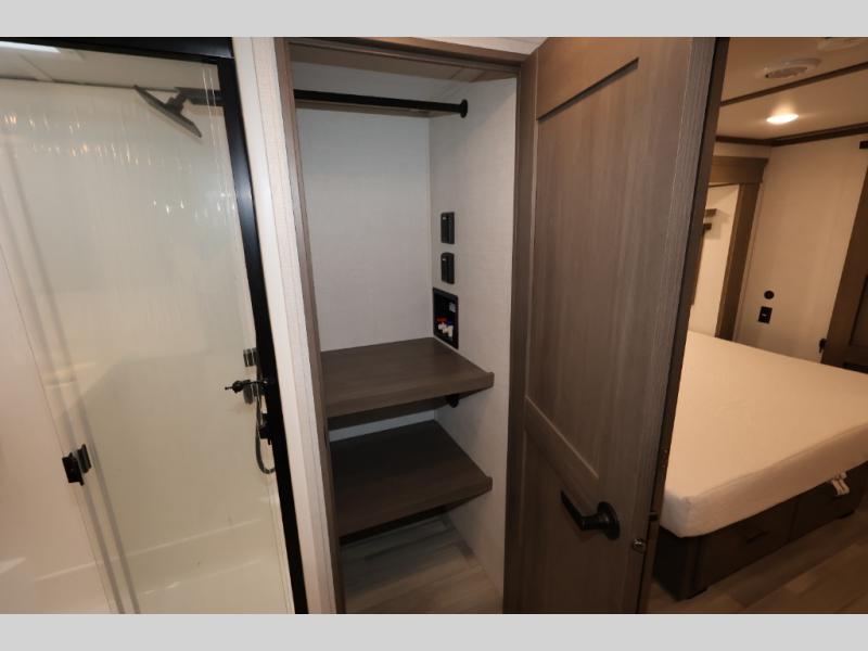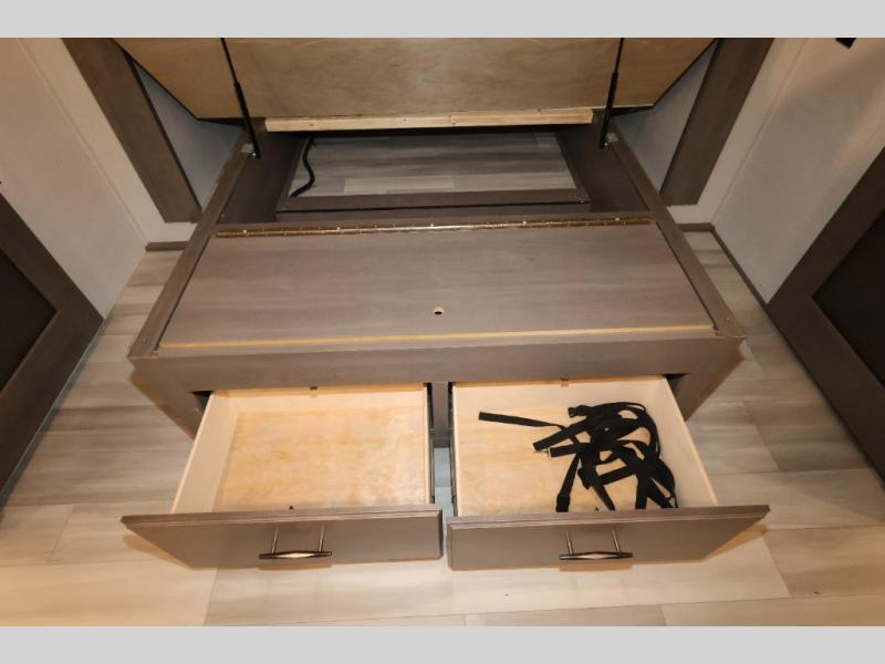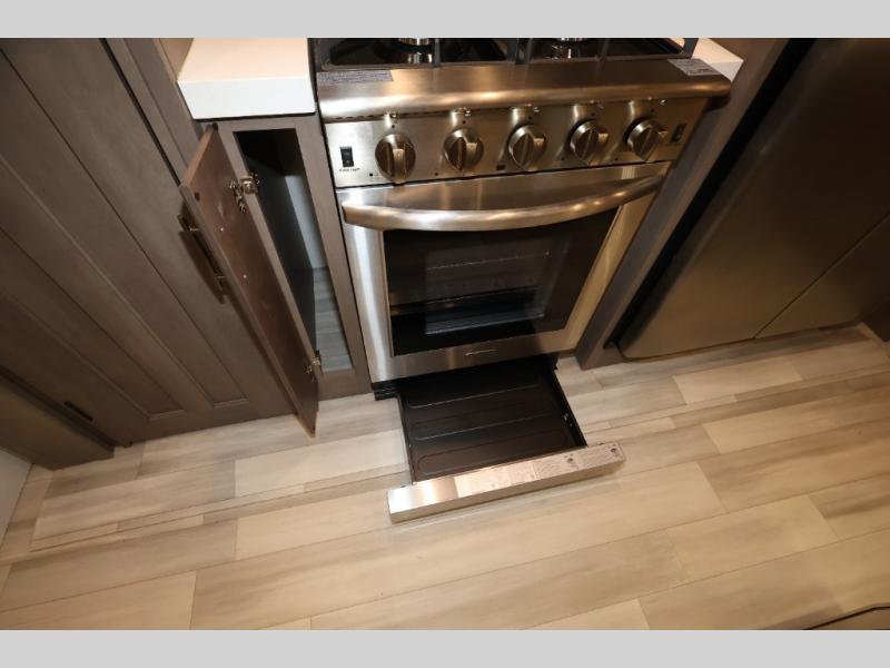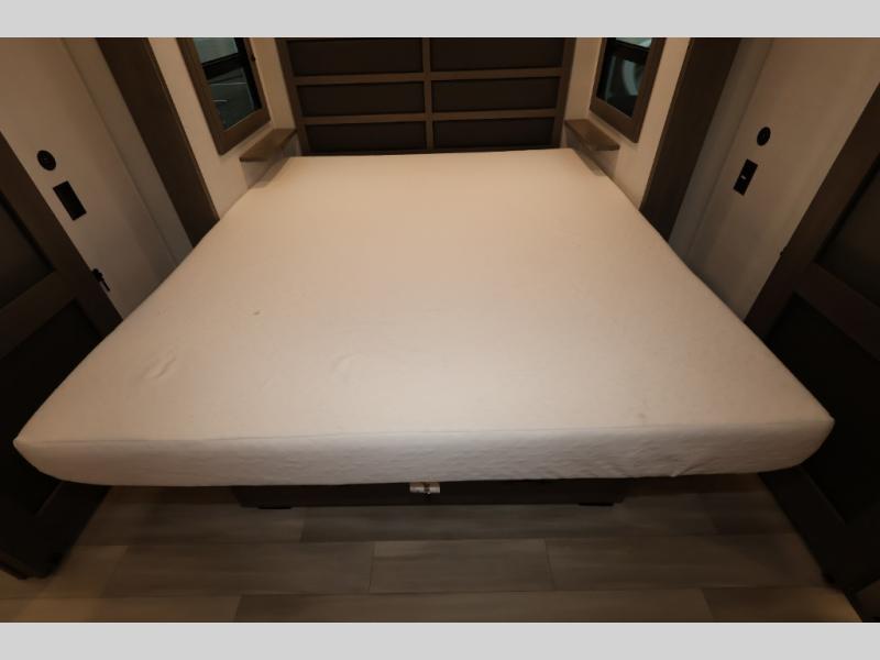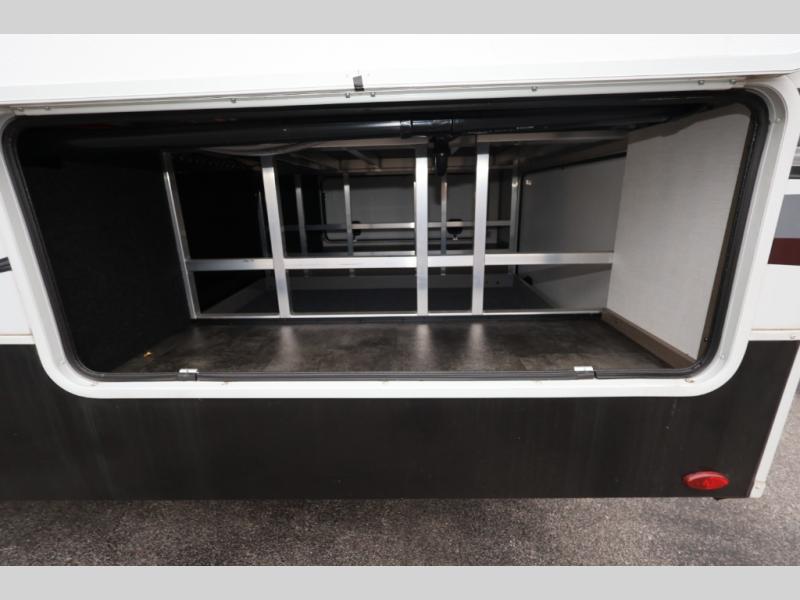 Five slide outs, a full bathroom with dual sinks, a half bath off of the kitchen, and a separate front living room and entertainment area are a few reasons you will enjoy your time spent in this fifth wheel! The separate kitchen is a dream with stainless steel appliances including a 24" residential oven, a pantry and hutch with counter space, a kitchen island plus a free-standing dinette slide with windows for great views. The entertainment center offers an LED Smart TV with a fireplace below and storage, and the dual opposing tri-fold sofas provide added sleeping space at night. The master bedroom includes a queen bed, LED TV and storage, plus space savings sliding doors that lead you to the rear full bathroom with dual sinks, linen storage, and space prepped for a washer/dryer option. You will find more storage throughout the fifth wheel in the overhead cabinets, the entry closet, and even your shoes have a spot under the interior steps leading to the front living/entertainment room. The exterior has several storage choices as well including a pass-through compartment for fishing poles and such, plus the unique sliding tray in the rear allows you to bring along larger items such as camping tables, portable grills, golf clubs, totes and more.
