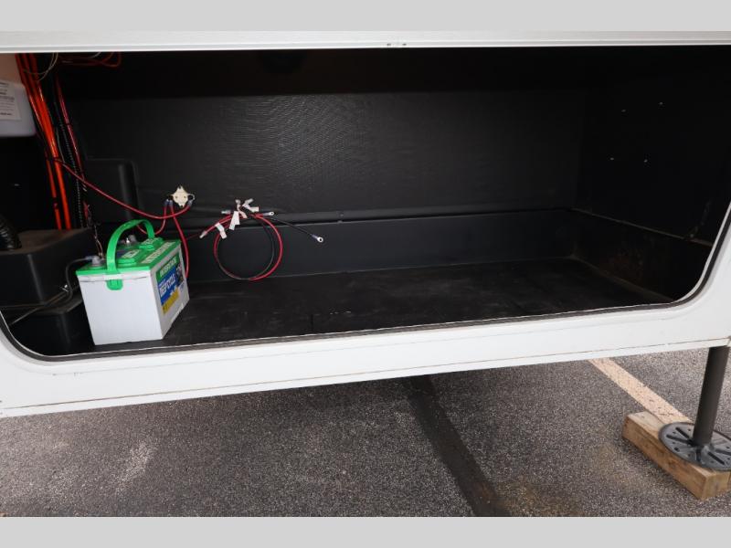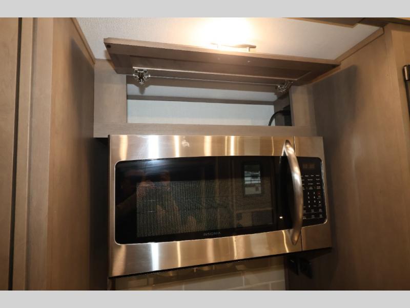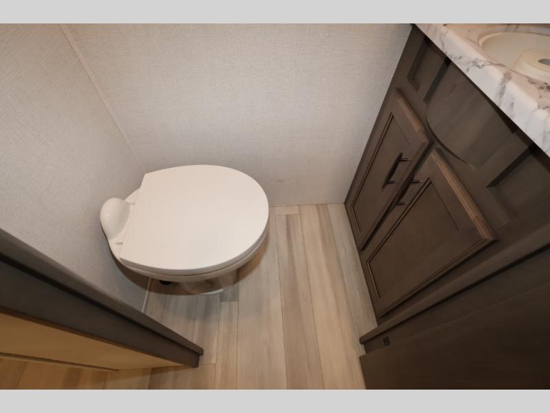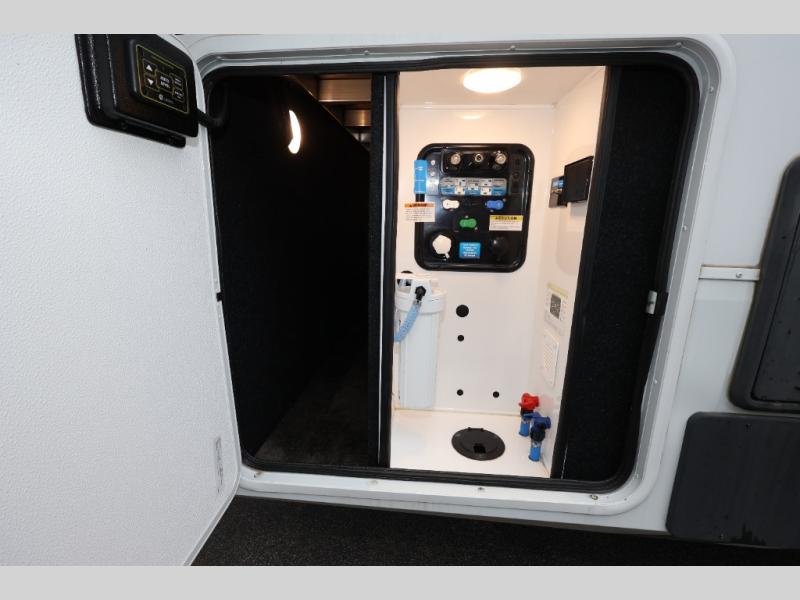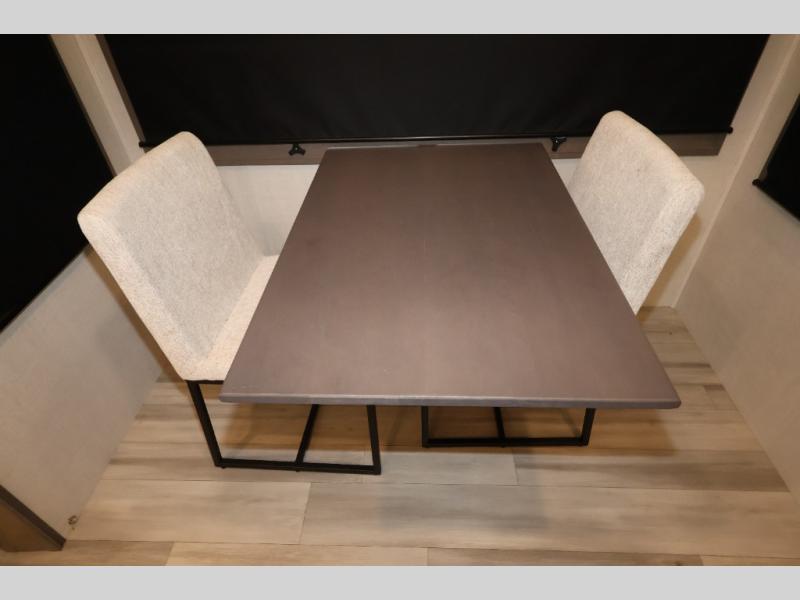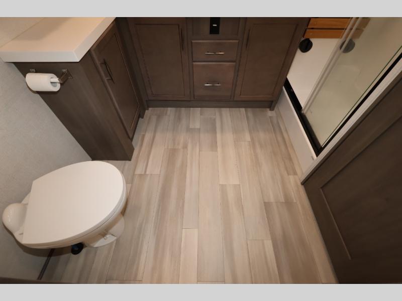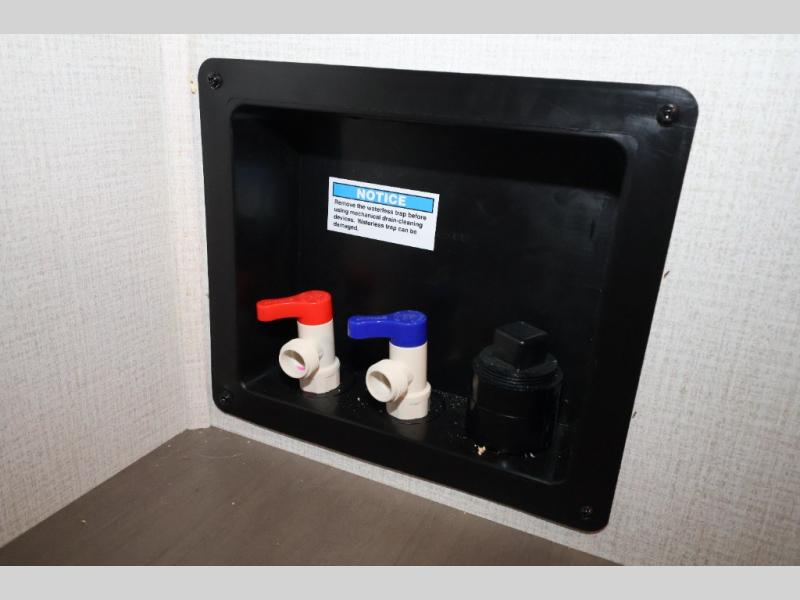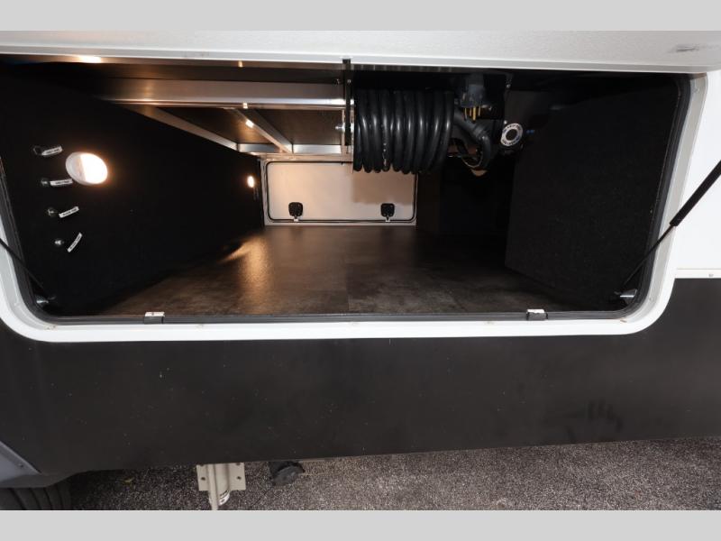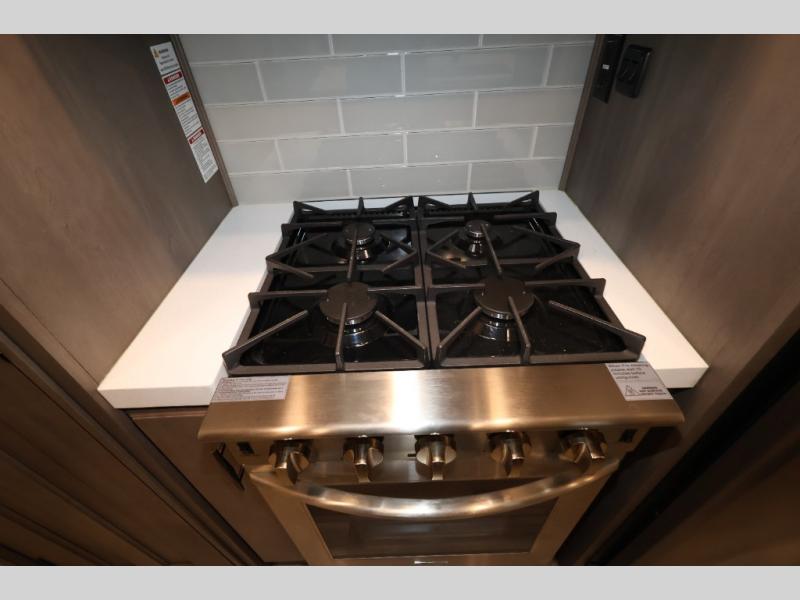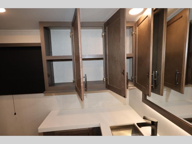 Five slide outs, a full bathroom with dual sinks, a half bath off of the kitchen, and a separate front living room and entertainment area are a few reasons you will enjoy your time spent in this fifth wheel! The separate kitchen is a dream with stainless steel appliances including a 24" residential oven, a pantry and hutch with counter space, a kitchen island plus a free-standing dinette slide with windows for great views. The entertainment center offers an LED Smart TV with a fireplace below and storage, and the dual opposing tri-fold sofas provide added sleeping space at night. The master bedroom includes a queen bed, LED TV and storage, plus space savings sliding doors that lead you to the rear full bathroom with dual sinks, linen storage, and space prepped for a washer/dryer option. You will find more storage throughout the fifth wheel in the overhead cabinets, the entry closet, and even your shoes have a spot under the interior steps leading to the front living/entertainment room. The exterior has several storage choices as well including a pass-through compartment for fishing poles and such, plus the unique sliding tray in the rear allows you to bring along larger items such as camping tables, portable grills, golf clubs, totes and more.