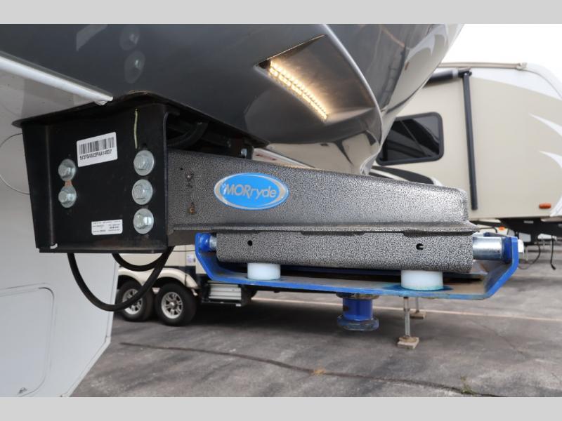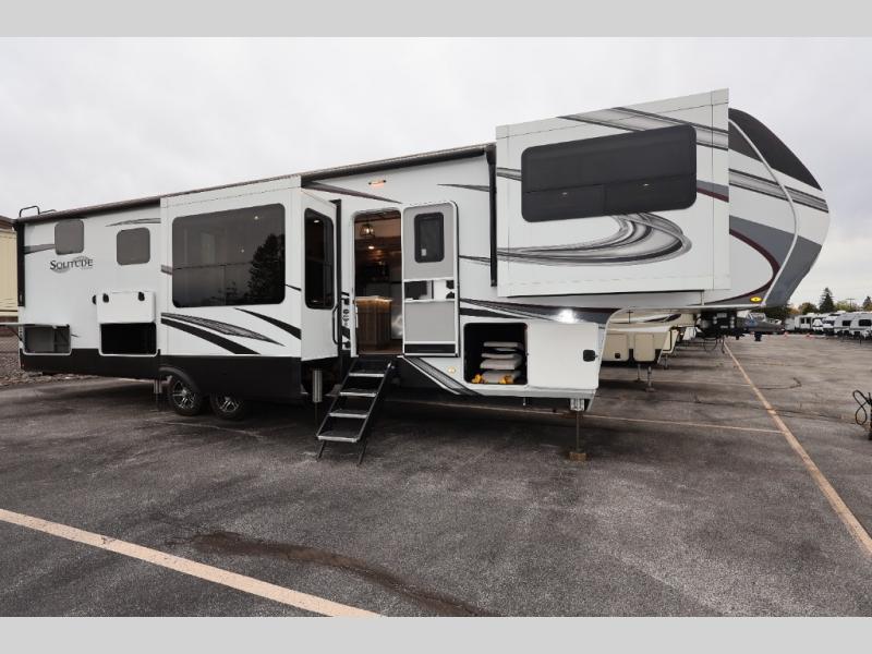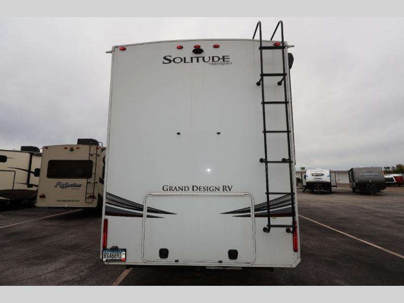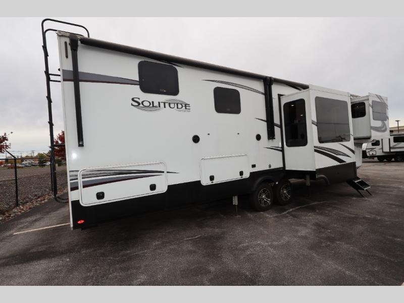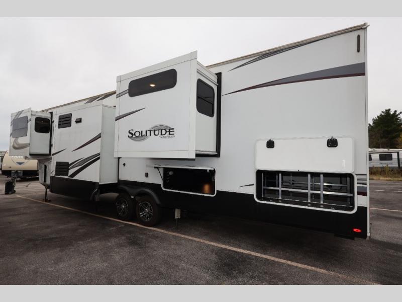 Each Solitude fifth wheel by Grand Design features a 101" wide-body construction, heavy duty 7,000 lb. axles, frameless tinted windows, and high-gloss gel coat sidewalls. You can camp year around thanks to the Weather-Tek Package that includes a 35K BTU high-capacity furnace, an all-in-one enclosed and heated utility center, and a fully enclosed underbelly with heated tanks and storage. Inside, you'll love the premium roller shades, hardwood cabinet doors, solid surface countertops and sinks, plus residential finishes throughout to make you truly feel at home. Each model also includes a MORryde CRE3000 suspension system, self adjusting brakes, and a MORryde pin box that will provide smooth towing from home to campground. Affordable luxury is possible with the Solitude fifth wheels; choose yours today!