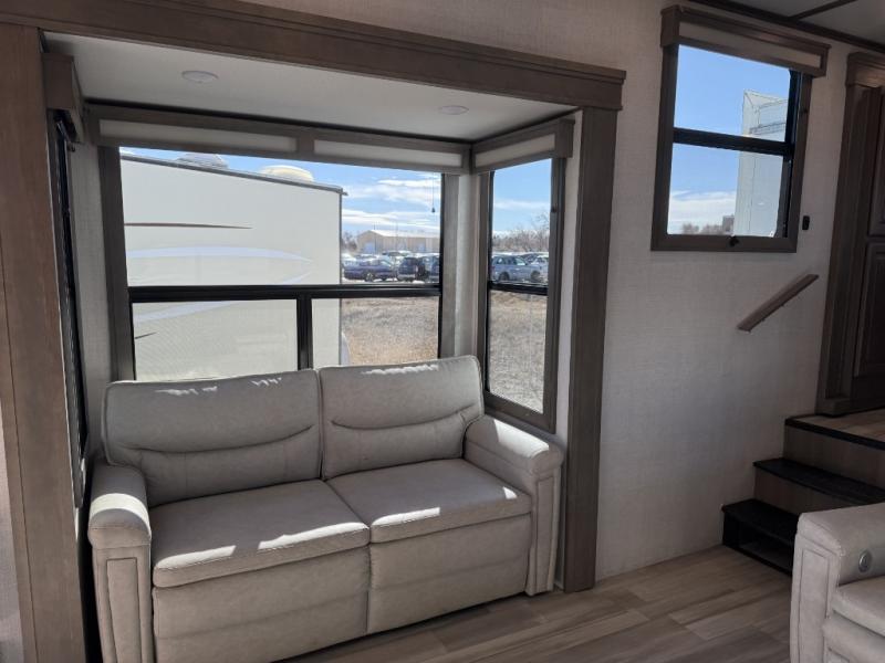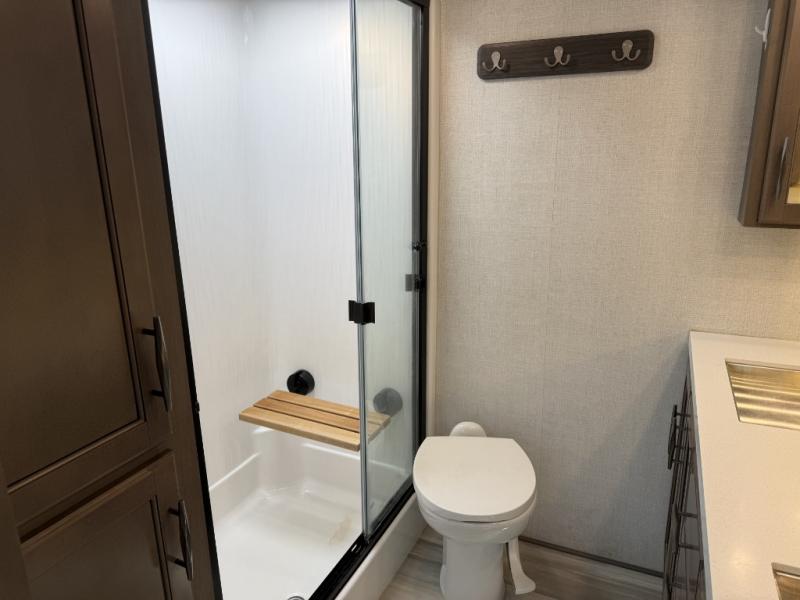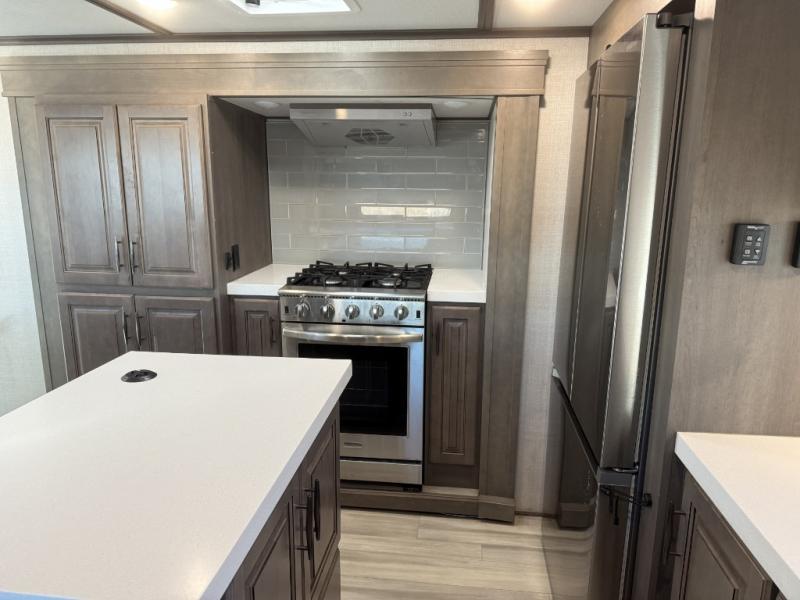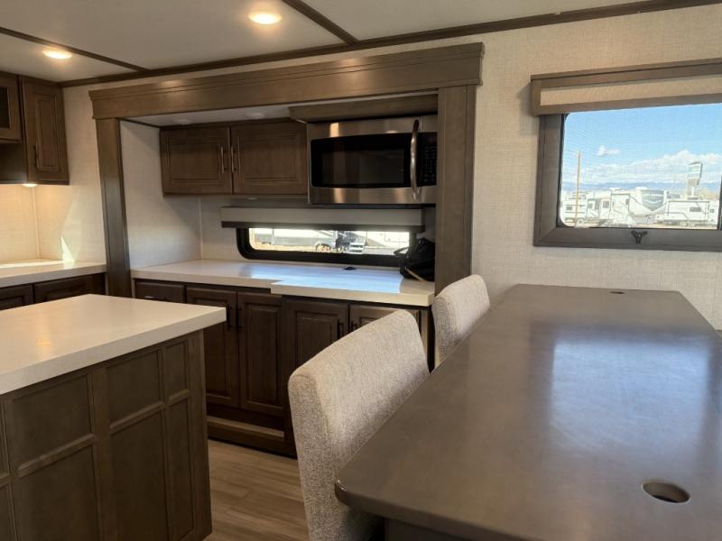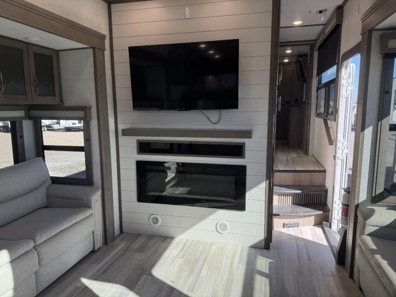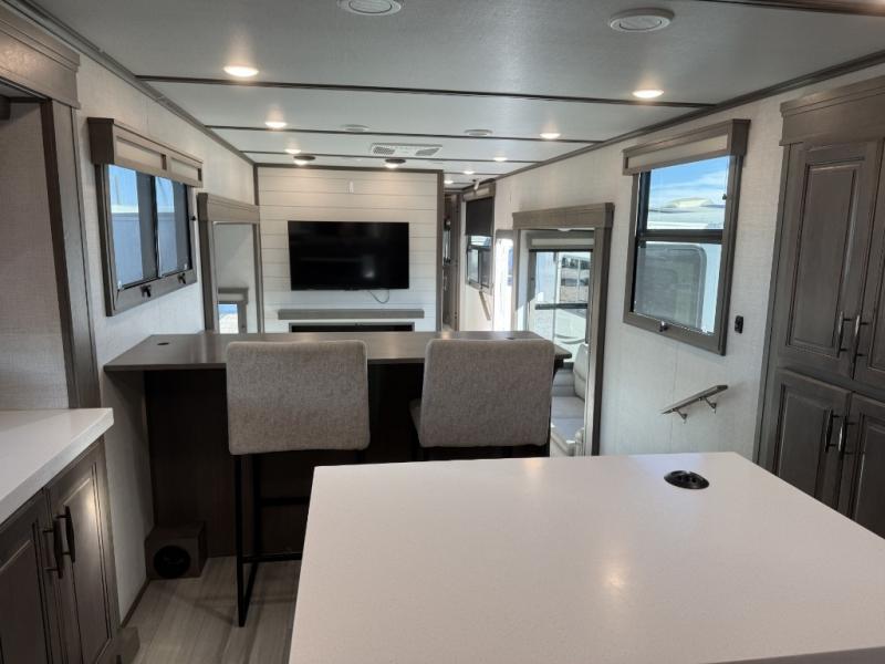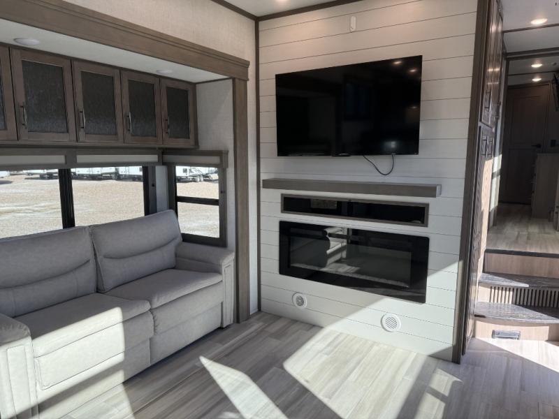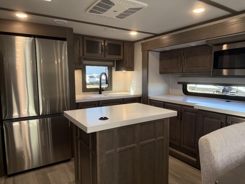 Enjoy each and every vacation, month-long trips, or even extended stays at an RV park in this spacious fifth wheel! The raise rear kitchen gives the cook plenty of room to whip up any type of meal using the stainless steel appliances including a 24" residential oven, an oversized pantry, and the raised bar top will provide you even more counter space on top of dining with two chairs that overlook the middle living area. Relaxing is made easy thanks to two tri-fold sofas and theatre seating while watching the big game on the LED Smart TV and enjoying the fireplace below. Dual sinks in the full bathroom allow two people to easily get ready at once, and the flip up teak seat in the shower is a nice convenience. At night, retire to your own queen bed which slides out to provide more floor space, and enjoy a show on the LED TV above the flip-top dresser once in bed.