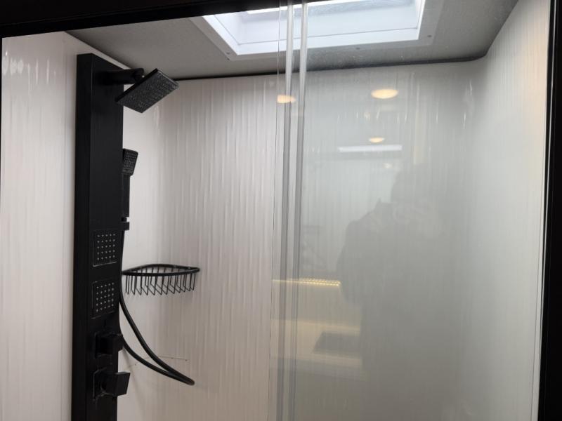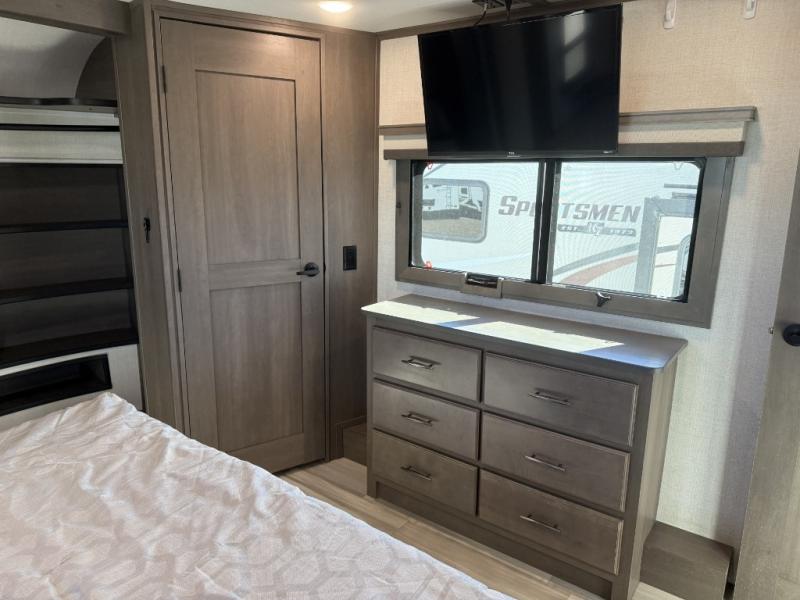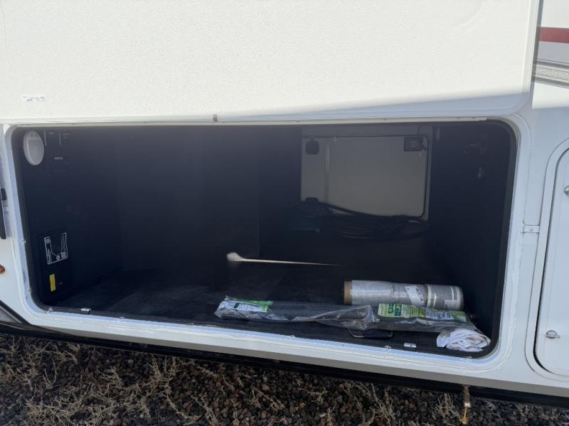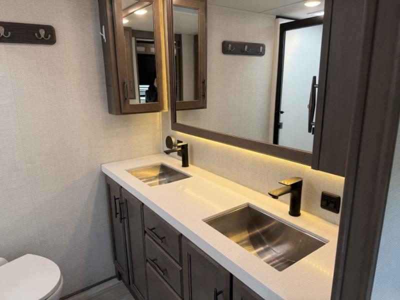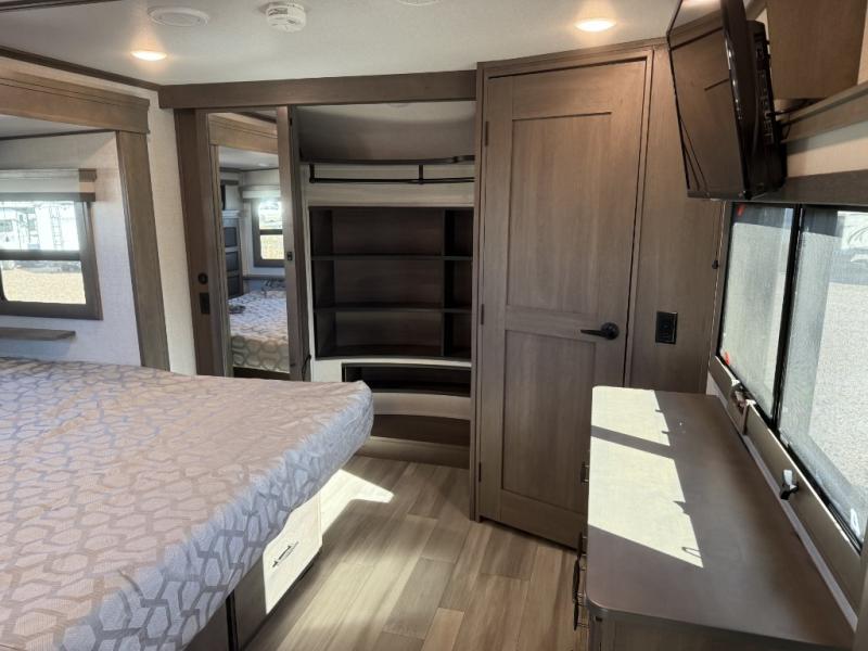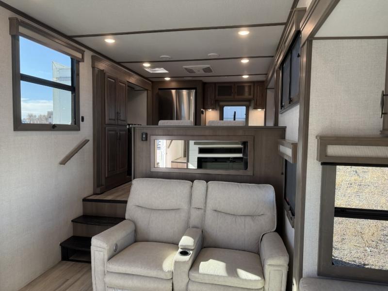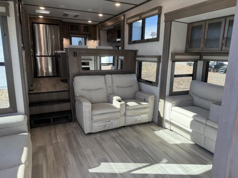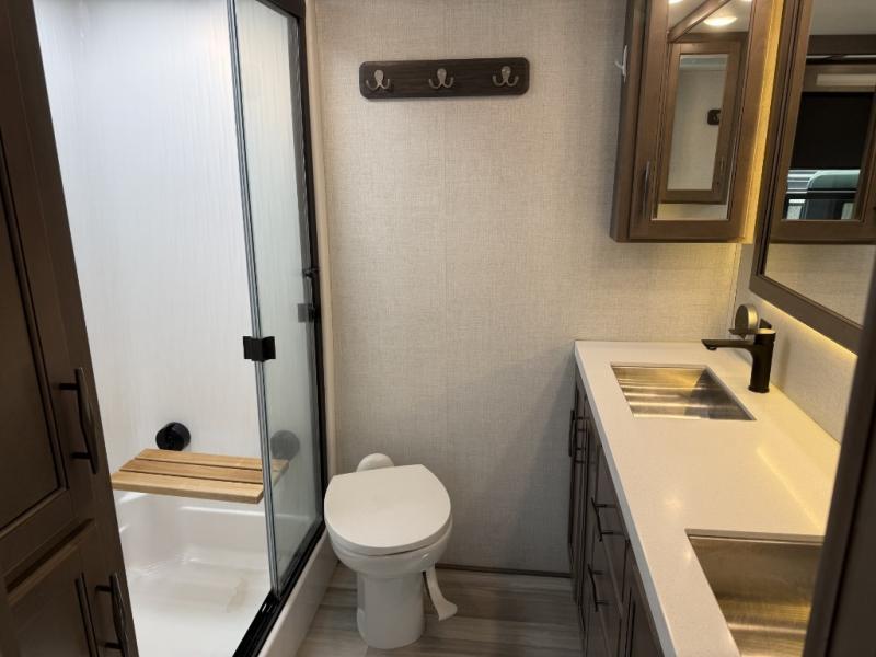 Enjoy each and every vacation, month-long trips, or even extended stays at an RV park in this spacious fifth wheel! The raise rear kitchen gives the cook plenty of room to whip up any type of meal using the stainless steel appliances including a 24" residential oven, an oversized pantry, and the raised bar top will provide you even more counter space on top of dining with two chairs that overlook the middle living area. Relaxing is made easy thanks to two tri-fold sofas and theatre seating while watching the big game on the LED Smart TV and enjoying the fireplace below. Dual sinks in the full bathroom allow two people to easily get ready at once, and the flip up teak seat in the shower is a nice convenience. At night, retire to your own queen bed which slides out to provide more floor space, and enjoy a show on the LED TV above the flip-top dresser once in bed.