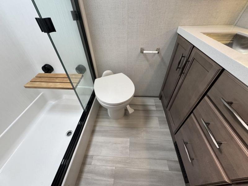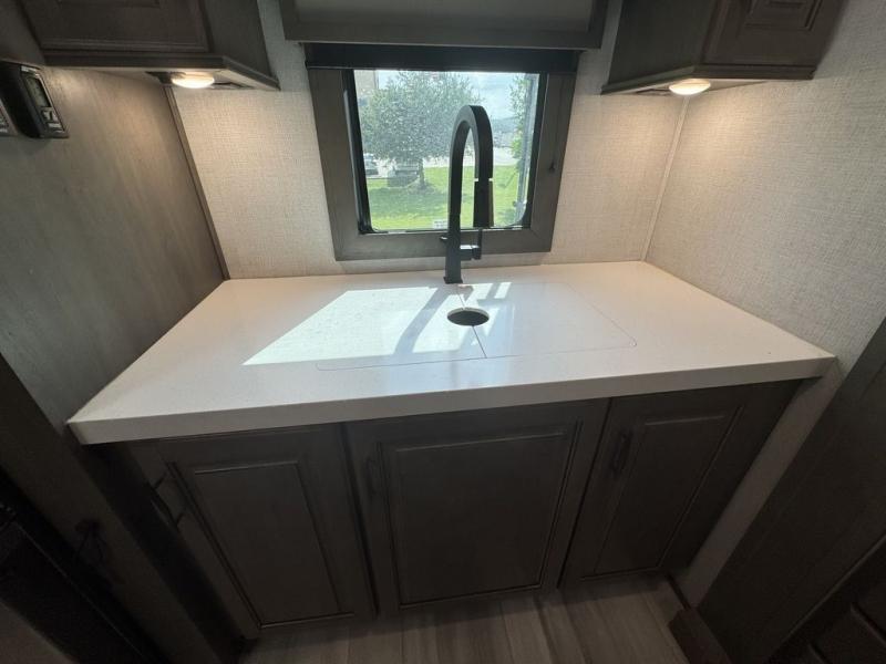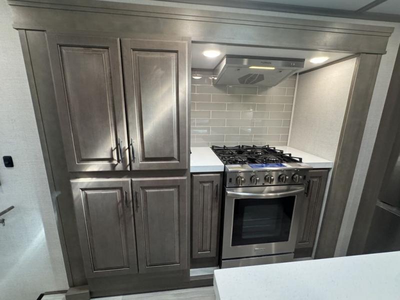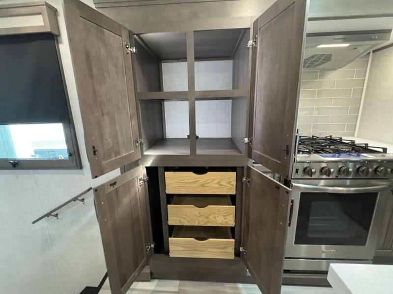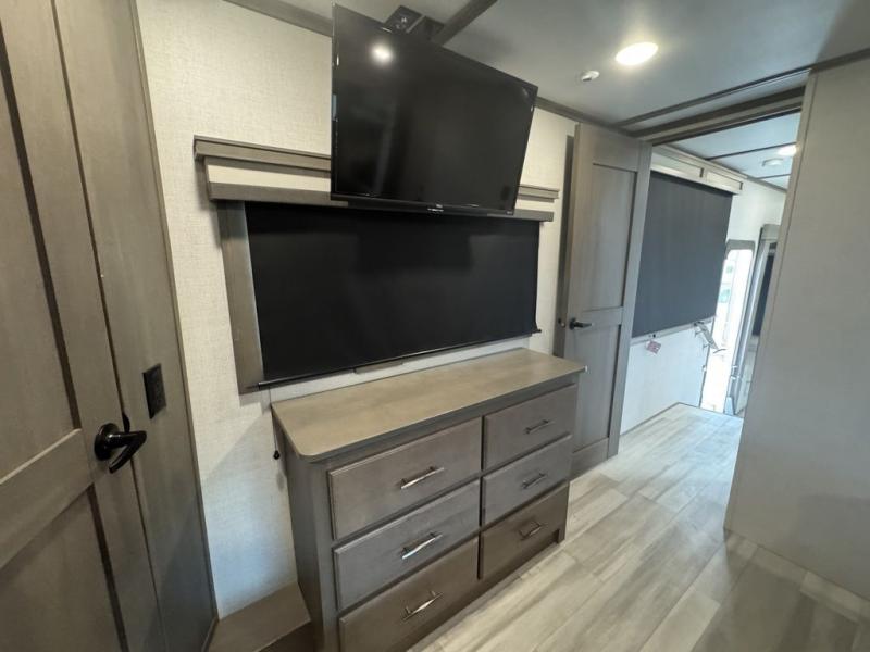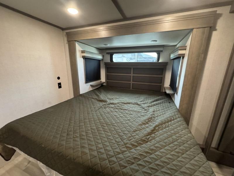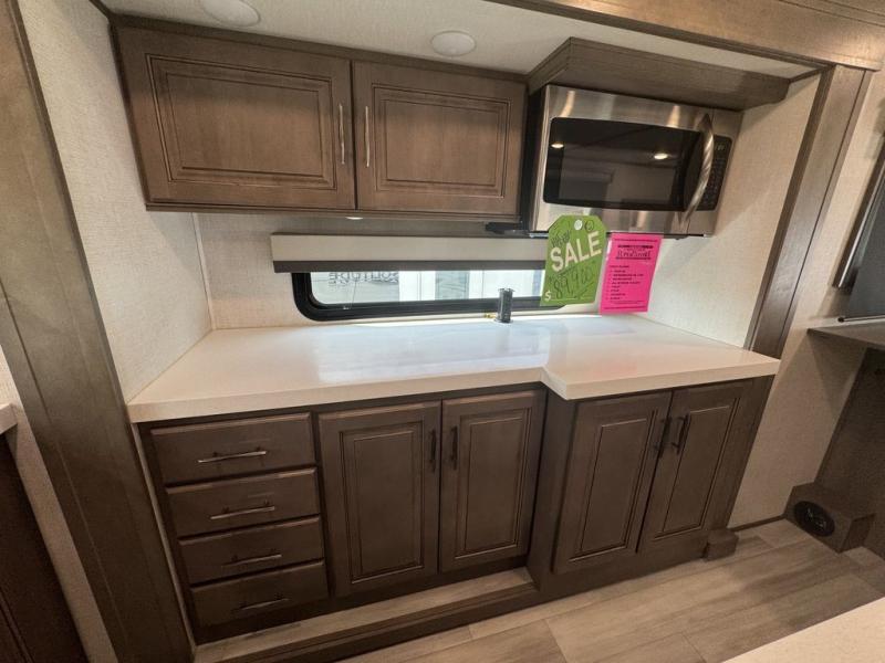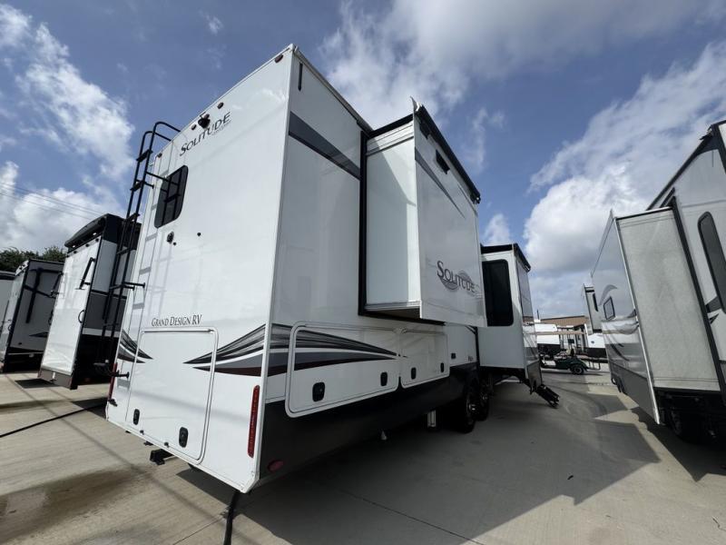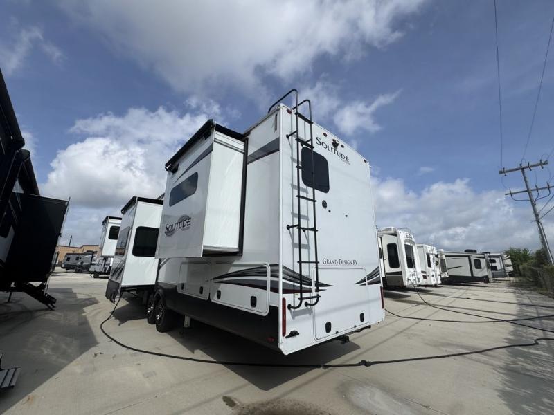 Each Solitude fifth wheel by Grand Design features a 101" wide-body construction, heavy duty 7,000 lb. axles, frameless tinted windows, and high-gloss gel coat sidewalls. You can camp year around thanks to the Weather-Tek Package that includes a 35K BTU high-capacity furnace, an all-in-one enclosed and heated utility center, and a fully enclosed underbelly with heated tanks and storage. Inside, you'll love the premium roller shades, hardwood cabinet doors, solid surface countertops and sinks, plus residential finishes throughout to make you truly feel at home. Each model also includes a MORryde CRE3000 suspension system, self adjusting brakes, and a MORryde pin box that will provide smooth towing from home to campground. Affordable luxury is possible with the Solitude fifth wheels; choose yours today!