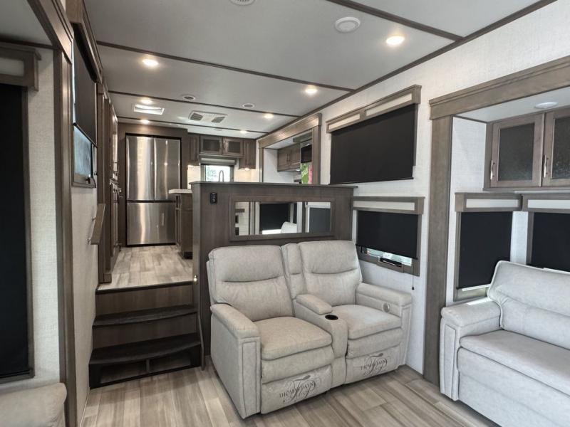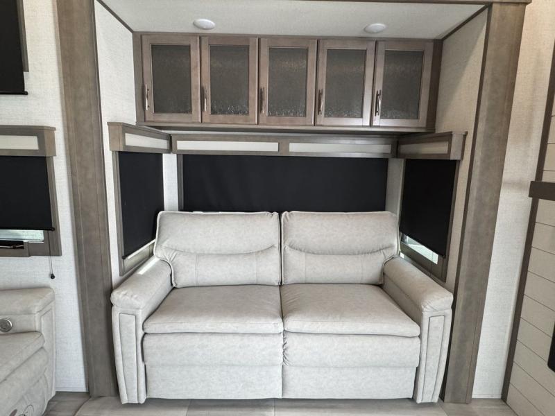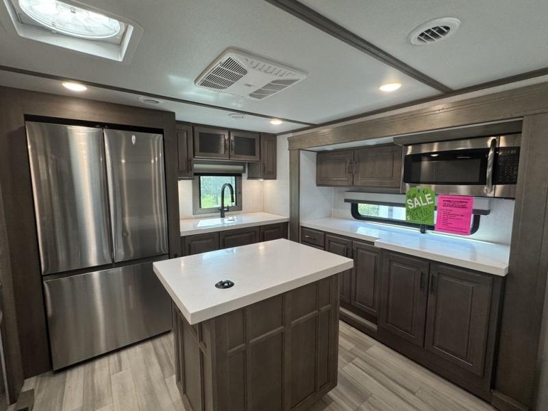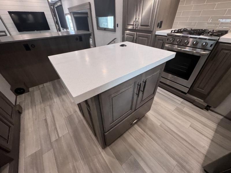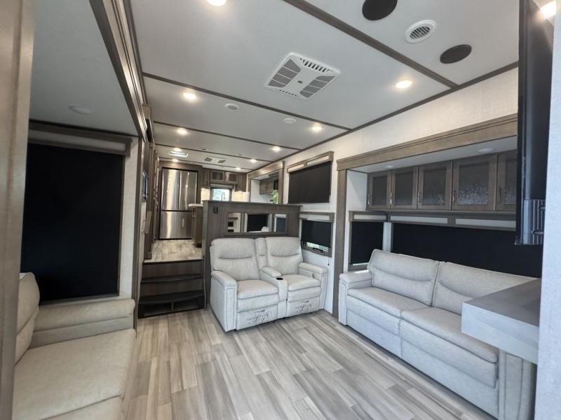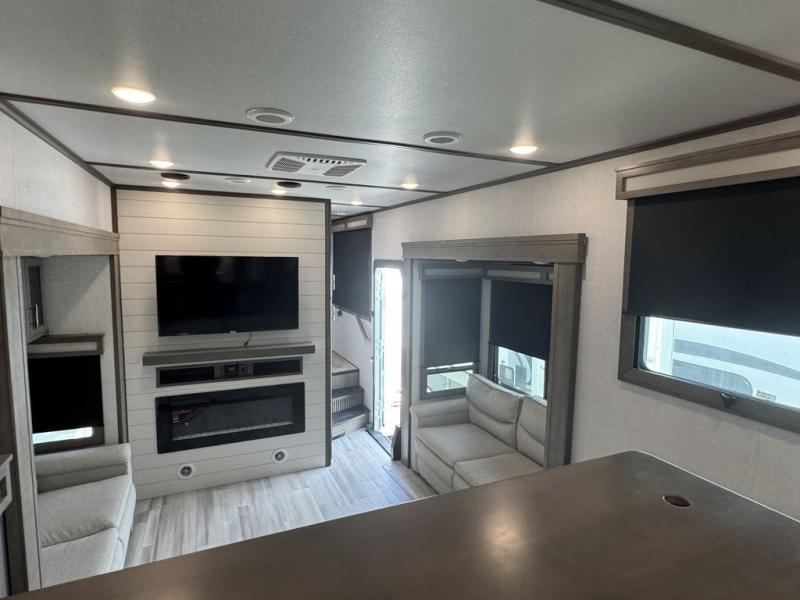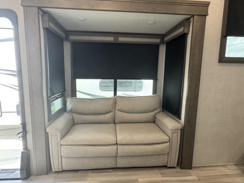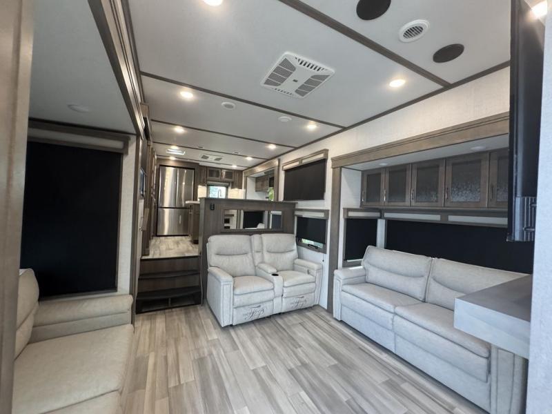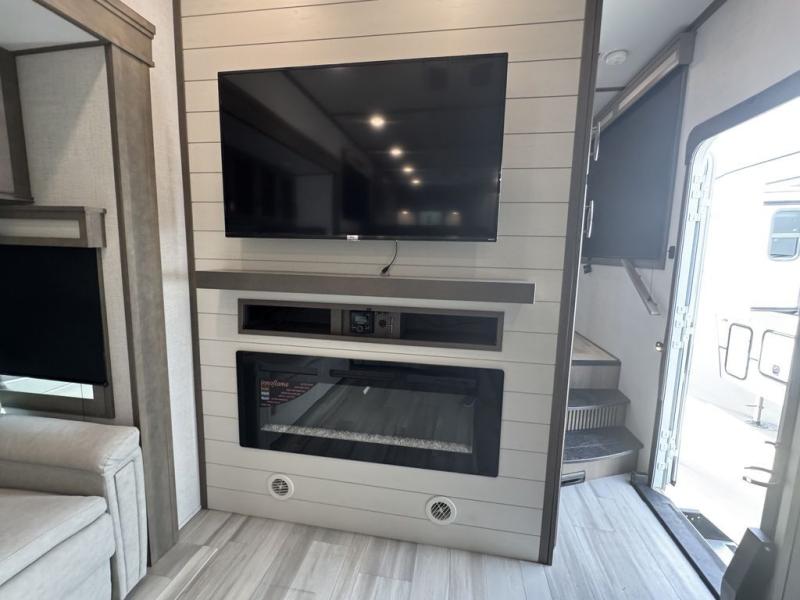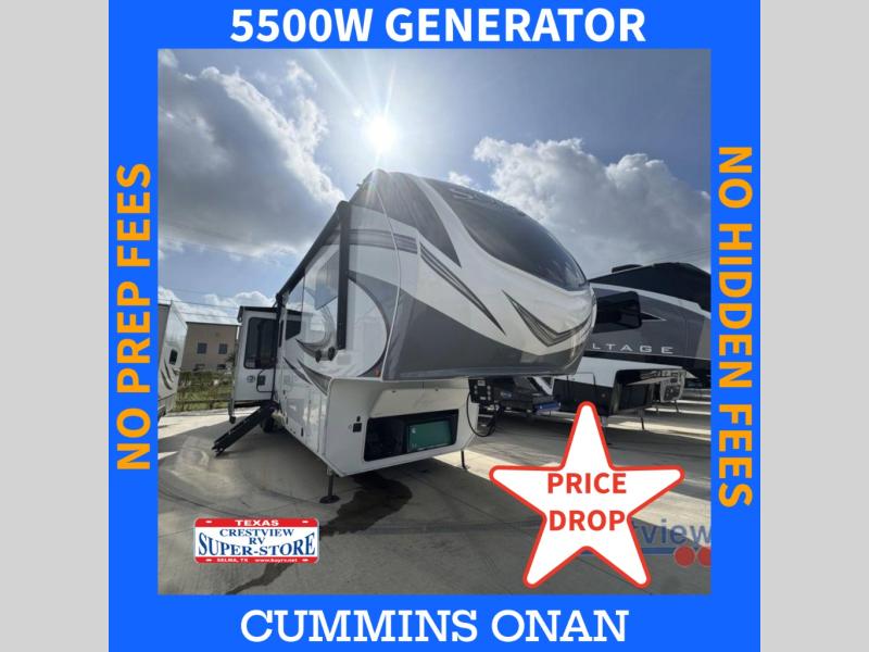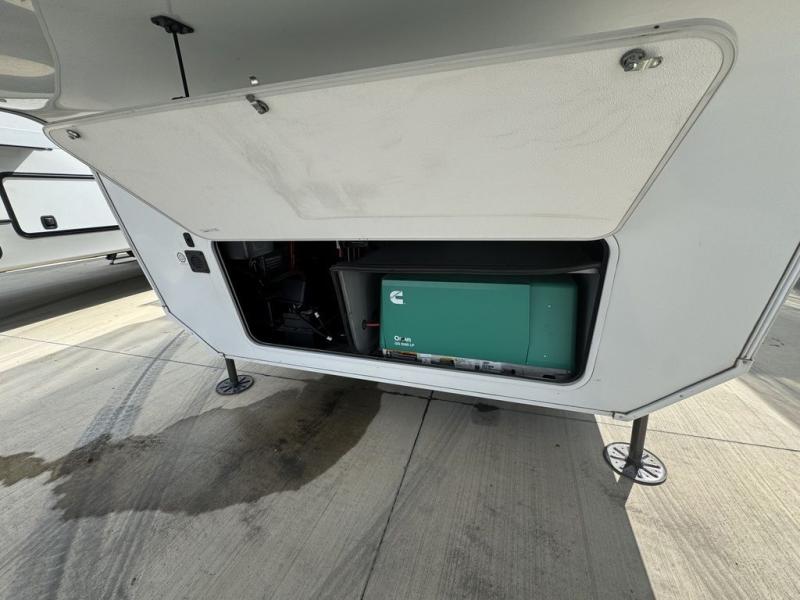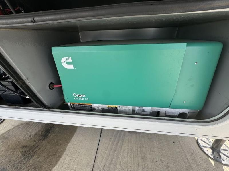 BONUS---HAS 5500 WATT ONAN GENERATOR AND SLIDE TOPPERS!!!!! Enjoy each and every vacation, month-long trips, or even extended stays at an RV park in this spacious fifth wheel! The raise rear kitchen gives the cook plenty of room to whip up any type of meal using the stainless steel appliances including a 24" residential oven, an oversized pantry, and the raised bar top will provide you even more counter space on top of dining with two chairs that overlook the middle living area. Relaxing is made easy thanks to two tri-fold sofas and theatre seating while watching the big game on the LED Smart TV and enjoying the fireplace below. Dual sinks in the full bathroom allow two people to easily get ready at once, and the flip up teak seat in the shower is a nice convenience. At night, retire to your own queen bed which slides out to provide more floor space, and enjoy a show on the LED TV above the flip-top dresser once in bed.