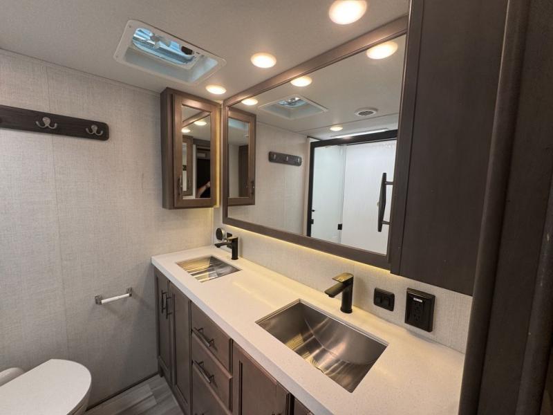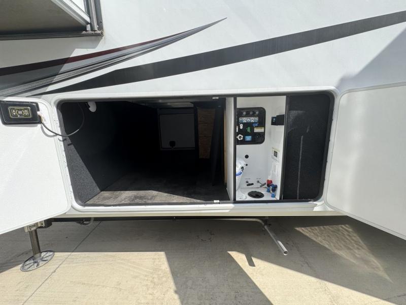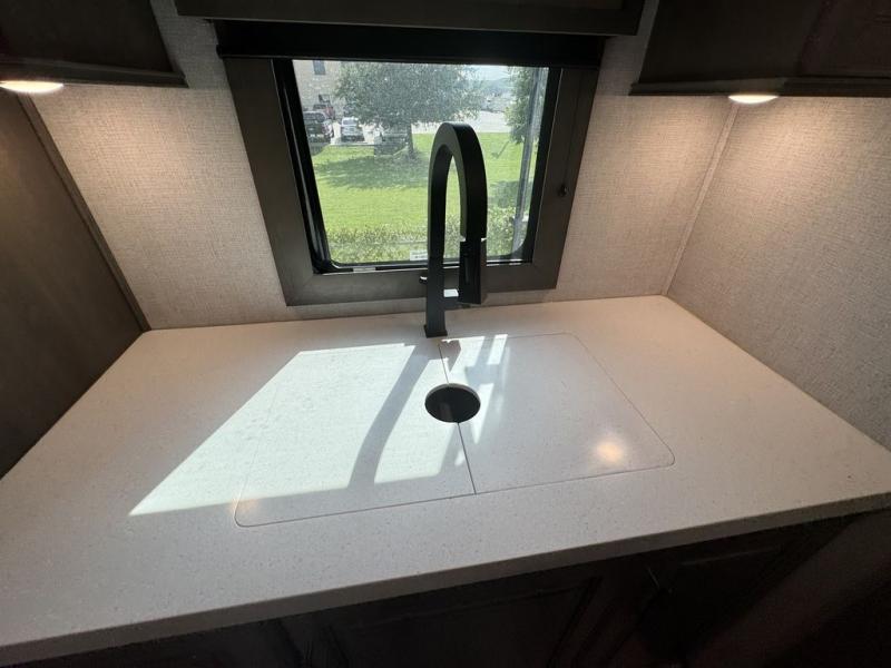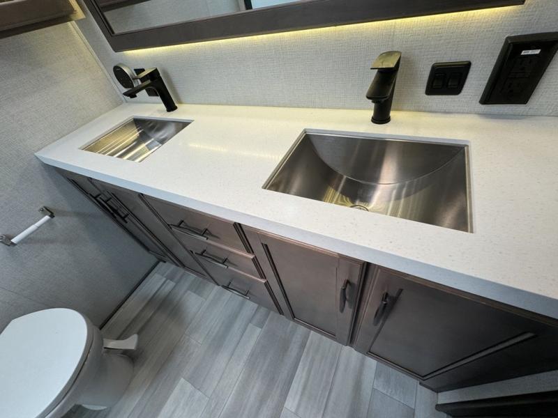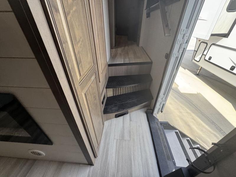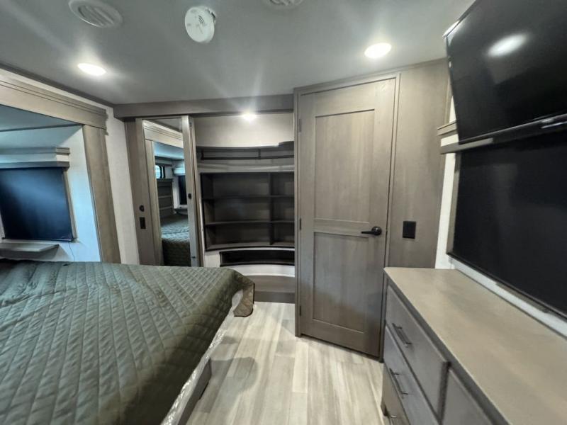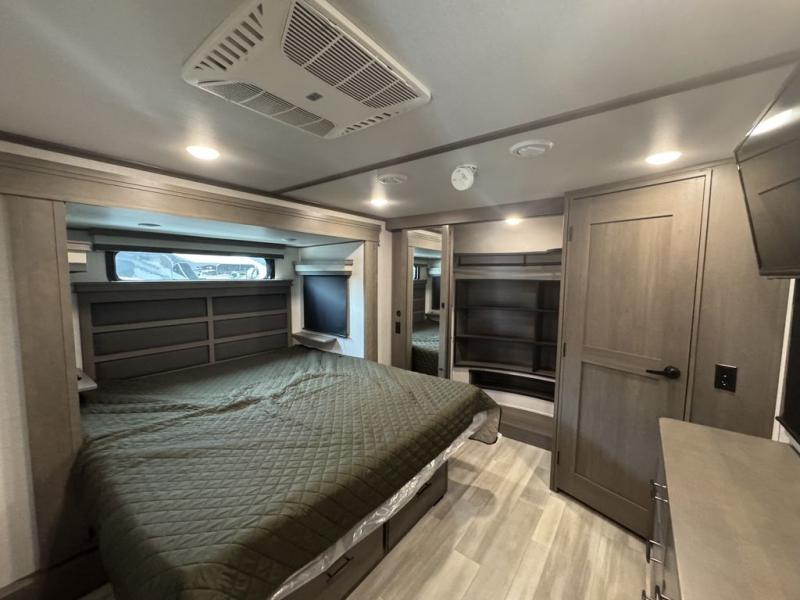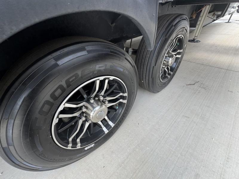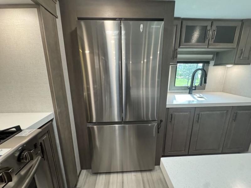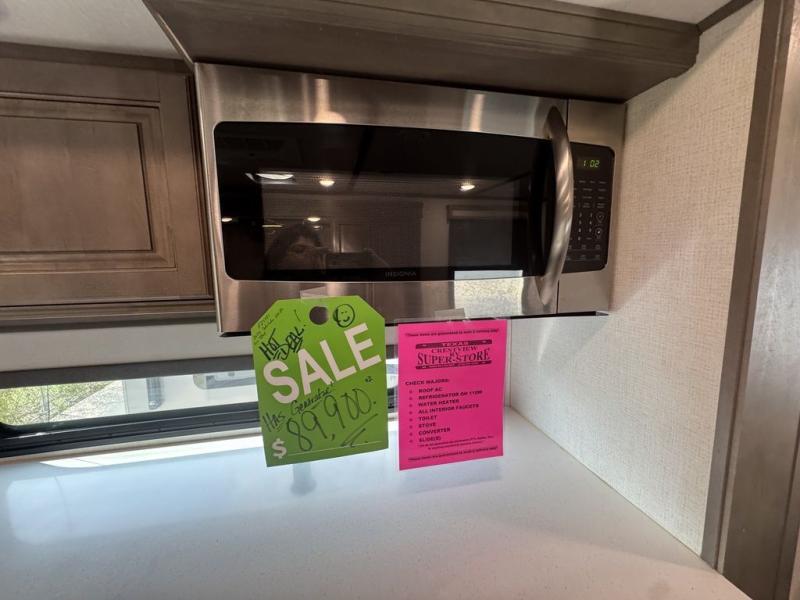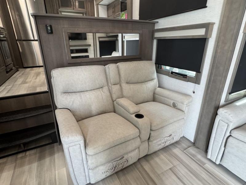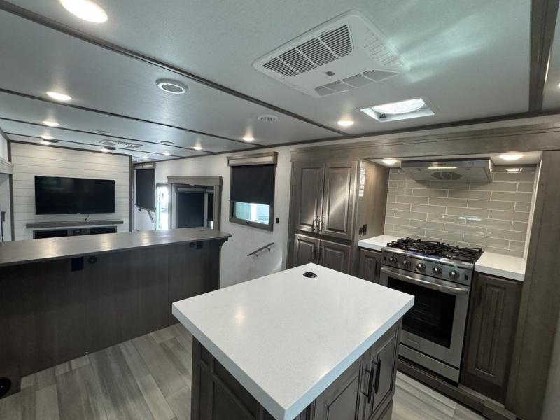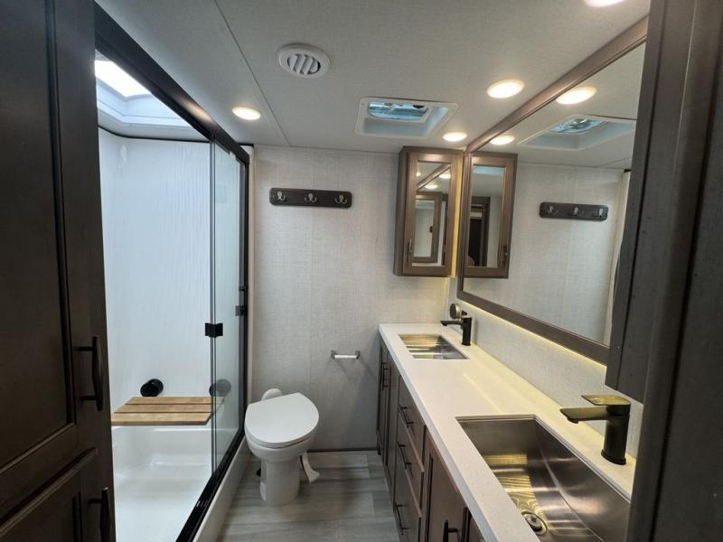BONUS---HAS 5500 WATT ONAN GENERATOR AND SLIDE TOPPERS!!!!! Enjoy each and every vacation, month-long trips, or even extended stays at an RV park in this spacious fifth wheel! The raise rear kitchen gives the cook plenty of room to whip up any type of meal using the stainless steel appliances including a 24" residential oven, an oversized pantry, and the raised bar top will provide you even more counter space on top of dining with two chairs that overlook the middle living area. Relaxing is made easy thanks to two tri-fold sofas and theatre seating while watching the big game on the LED Smart TV and enjoying the fireplace below. Dual sinks in the full bathroom allow two people to easily get ready at once, and the flip up teak seat in the shower is a nice convenience. At night, retire to your own queen bed which slides out to provide more floor space, and enjoy a show on the LED TV above the flip-top dresser once in bed.