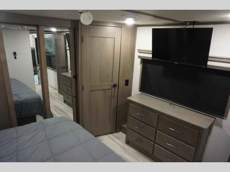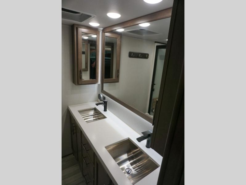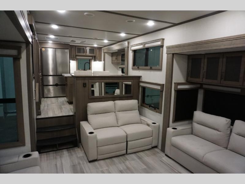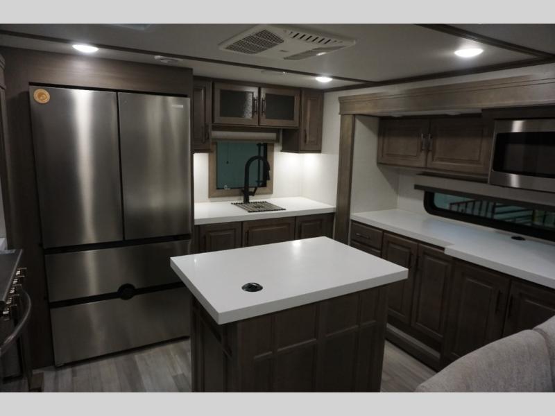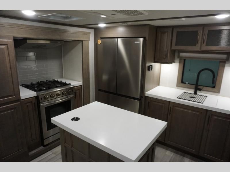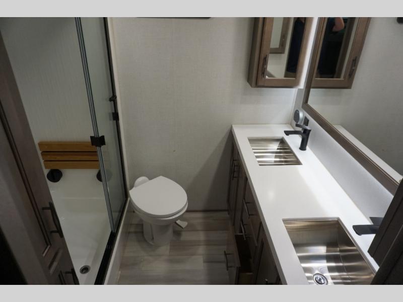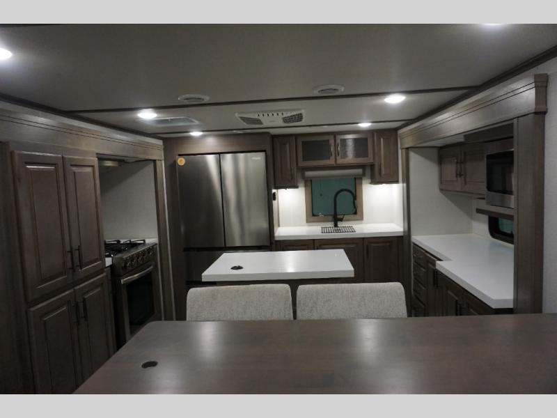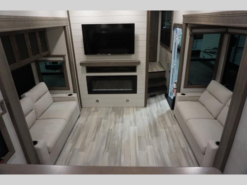 Enjoy each and every vacation, month-long trips, or even extended stays at an RV park in this spacious fifth wheel! The raise rear kitchen gives the cook plenty of room to whip up any type of meal using the stainless steel appliances including a 24" residential oven, an oversized pantry, and the raised bar top will provide you even more counter space on top of dining with two chairs that overlook the middle living area. Relaxing is made easy thanks to two tri-fold sofas and theatre seating while watching the big game on the LED Smart TV and enjoying the fireplace below. Dual sinks in the full bathroom allow two people to easily get ready at once, and the flip up teak seat in the shower is a nice convenience. At night, retire to your own queen bed which slides out to provide more floor space, and enjoy a show on the LED TV above the flip-top dresser once in bed.