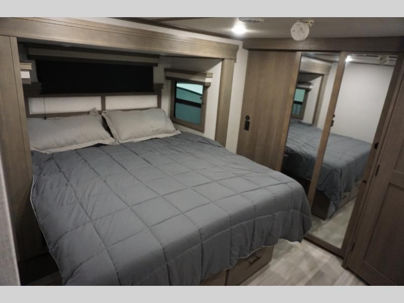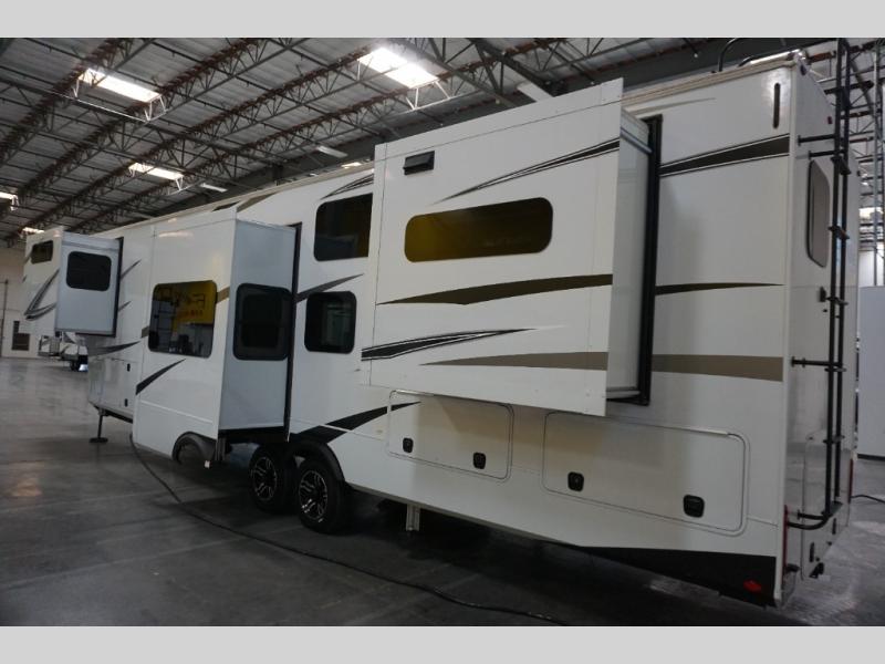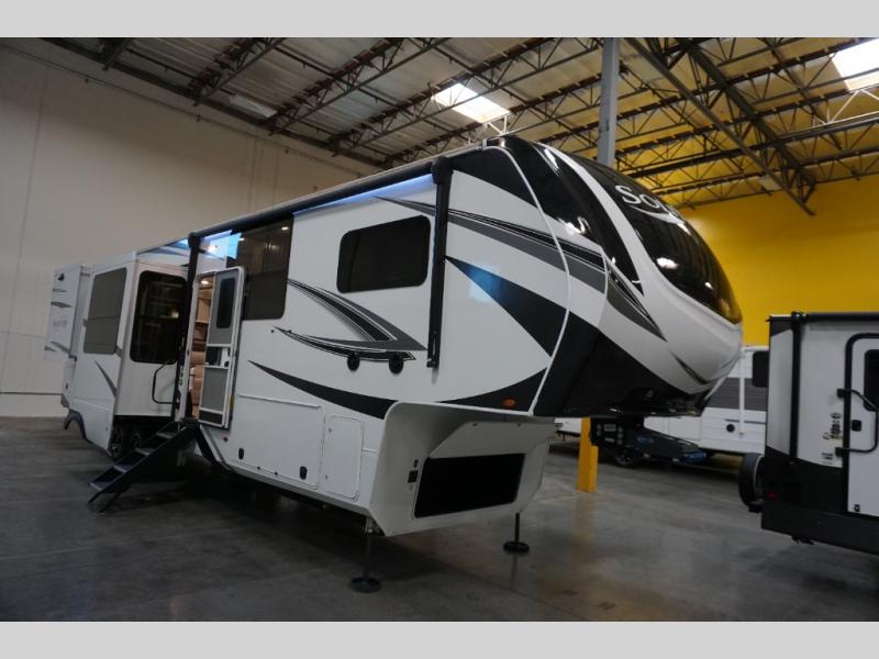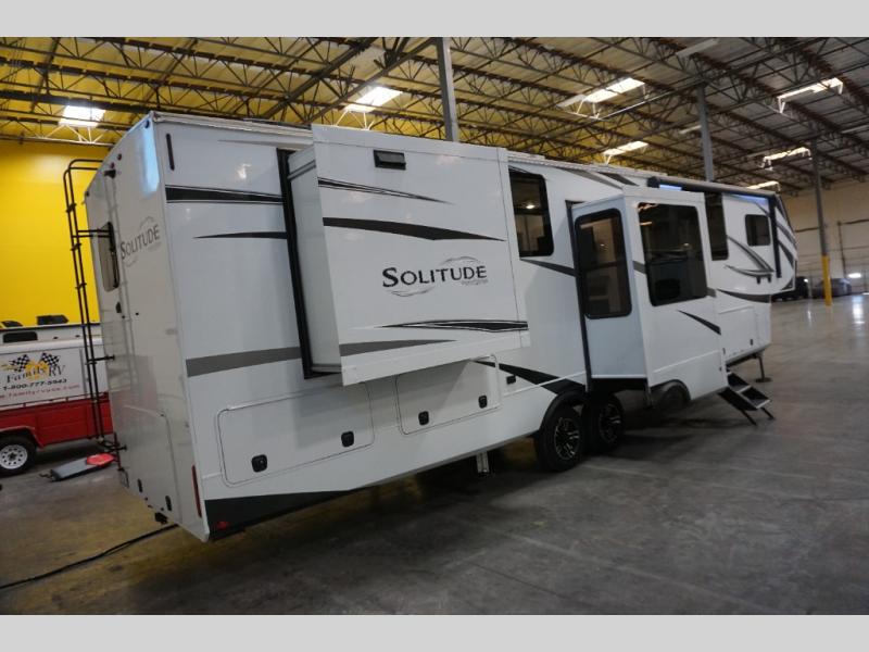 Each Solitude fifth wheel by Grand Design features a 101" wide-body construction, heavy duty 7,000 lb. axles, frameless tinted windows, and high-gloss gel coat sidewalls. You can camp year around thanks to the Weather-Tek Package that includes a 35K BTU high-capacity furnace, an all-in-one enclosed and heated utility center, and a fully enclosed underbelly with heated tanks and storage. Inside, you'll love the premium roller shades, hardwood cabinet doors, solid surface countertops and sinks, plus residential finishes throughout to make you truly feel at home. Each model also includes a MORryde CRE3000 suspension system, self adjusting brakes, and a MORryde pin box that will provide smooth towing from home to campground. Affordable luxury is possible with the Solitude fifth wheels; choose yours today!