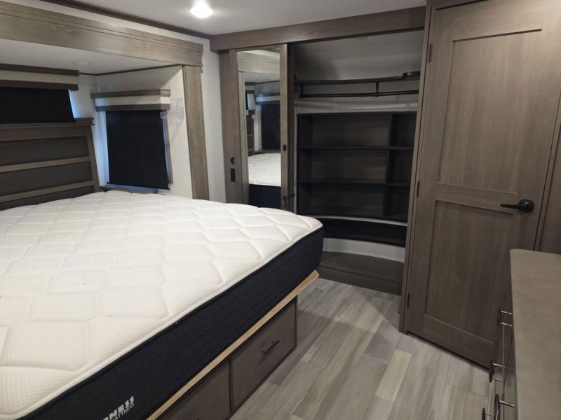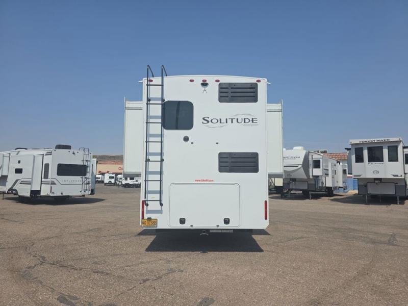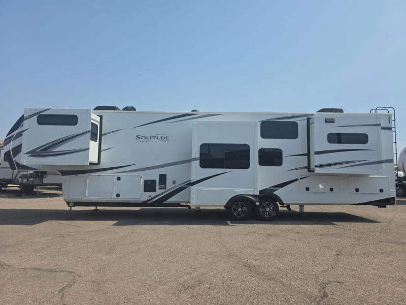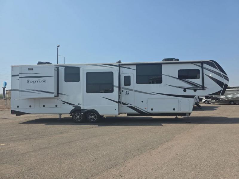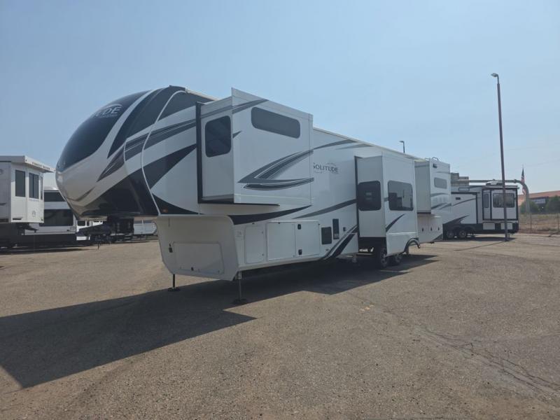 Each Solitude fifth wheel by Grand Design features a 101" wide-body construction, heavy duty 7,000 lb. axles, frameless tinted windows, and high-gloss gel coat sidewalls. You can camp year around thanks to the Weather-Tek Package that includes a 35K BTU high-capacity furnace, an all-in-one enclosed and heated utility center, and a fully enclosed underbelly with heated tanks and storage. Inside, you'll love the premium roller shades, hardwood cabinet doors, solid surface countertops and sinks, plus residential finishes throughout to make you truly feel at home. Each model also includes a MORryde CRE3000 suspension system, self adjusting brakes, and a MORryde pin box that will provide smooth towing from home to campground. Affordable luxury is possible with the Solitude fifth wheels; choose yours today!