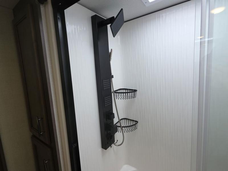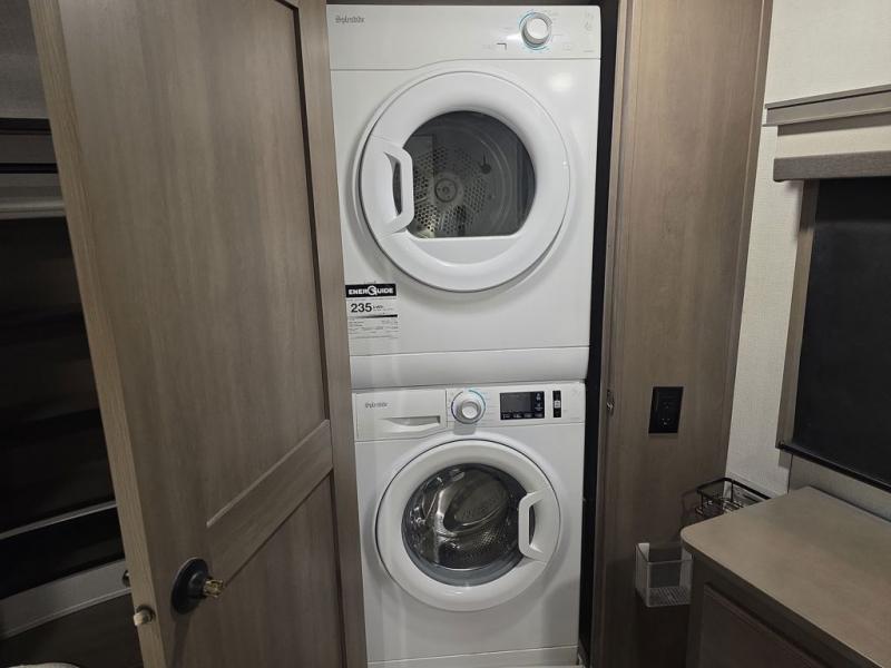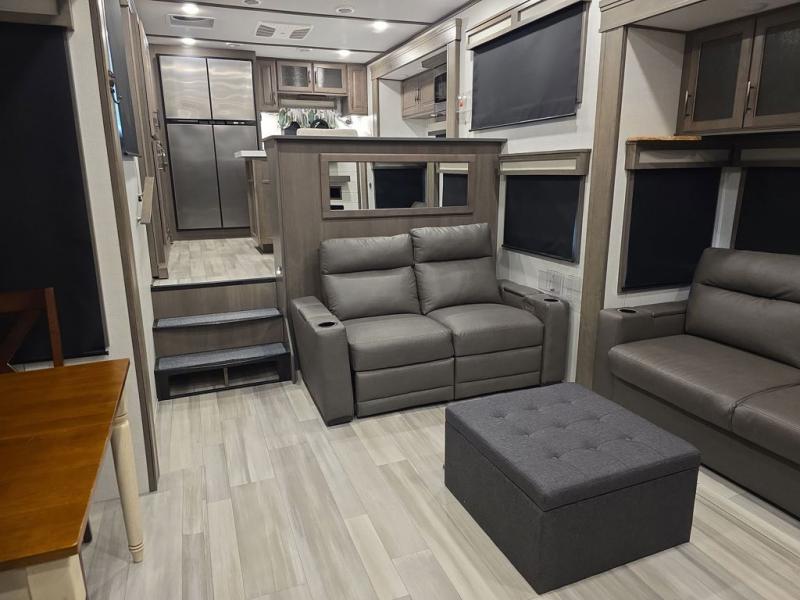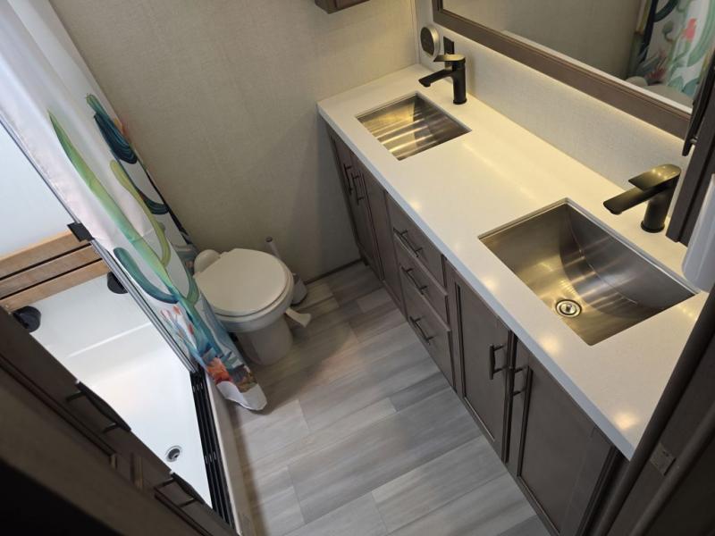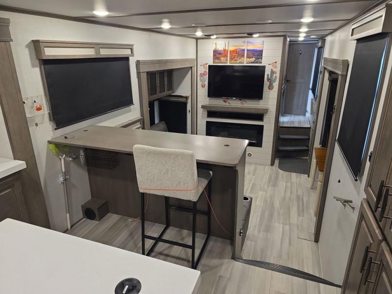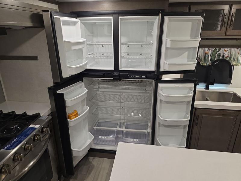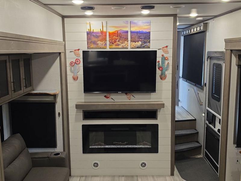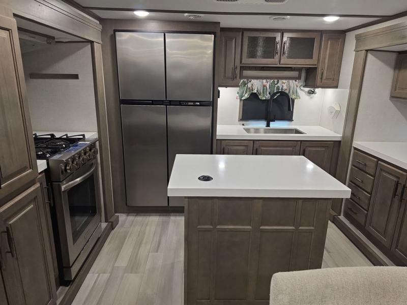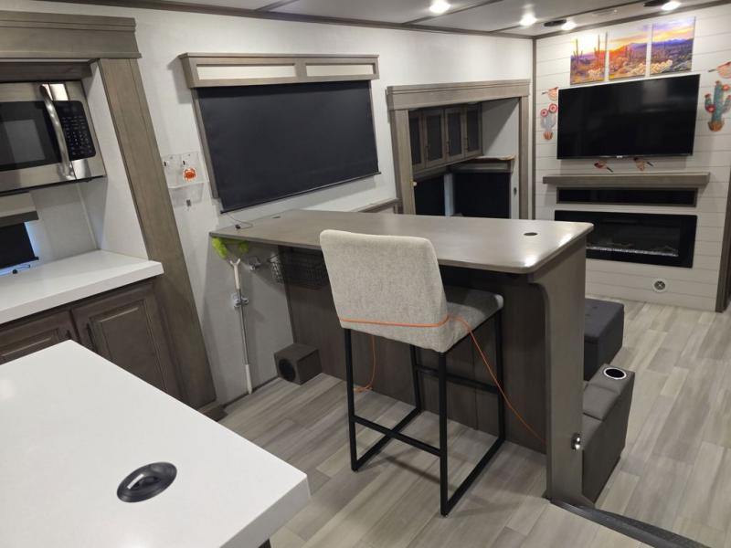 Enjoy each and every vacation, month-long trips, or even extended stays at an RV park in this spacious fifth wheel! The raise rear kitchen gives the cook plenty of room to whip up any type of meal using the stainless steel appliances including a 24" residential oven, an oversized pantry, and the raised bar top will provide you even more counter space on top of dining with two chairs that overlook the middle living area. Relaxing is made easy thanks to two tri-fold sofas and theatre seating while watching the big game on the LED Smart TV and enjoying the fireplace below. Dual sinks in the full bathroom allow two people to easily get ready at once, and the flip up teak seat in the shower is a nice convenience. At night, retire to your own queen bed which slides out to provide more floor space, and enjoy a show on the LED TV above the flip-top dresser once in bed.