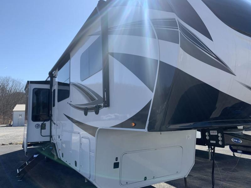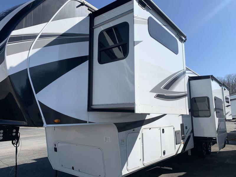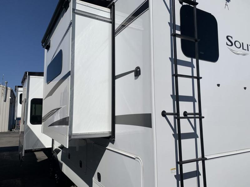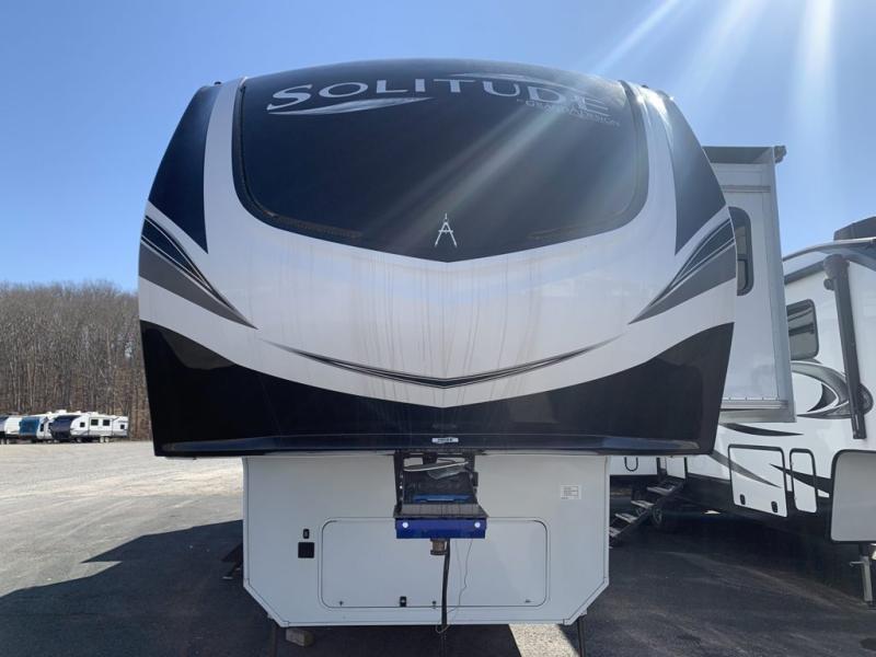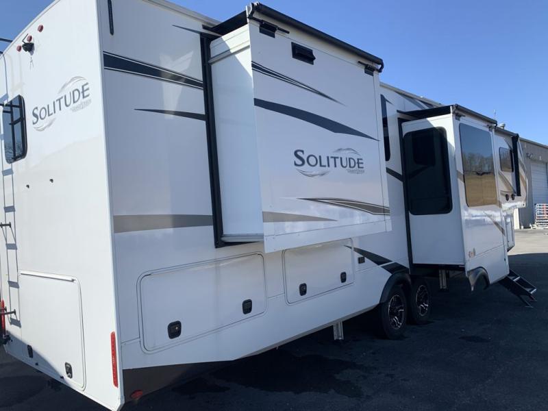 Each Solitude fifth wheel by Grand Design features a 101" wide-body construction, heavy duty 7,000 lb. axles, frameless tinted windows, and high-gloss gel coat sidewalls. You can camp year around thanks to the Weather-Tek Package that includes a 35K BTU high-capacity furnace, an all-in-one enclosed and heated utility center, and a fully enclosed underbelly with heated tanks and storage. Inside, you'll love the premium roller shades, hardwood cabinet doors, solid surface countertops and sinks, plus residential finishes throughout to make you truly feel at home. Each model also includes a MORryde CRE3000 suspension system, self adjusting brakes, and a MORryde pin box that will provide smooth towing from home to campground. Affordable luxury is possible with the Solitude fifth wheels; choose yours today!