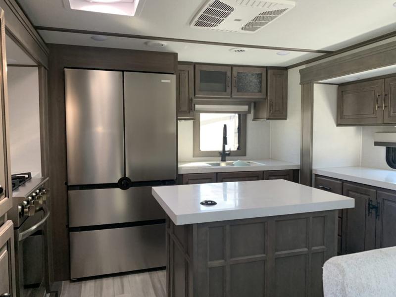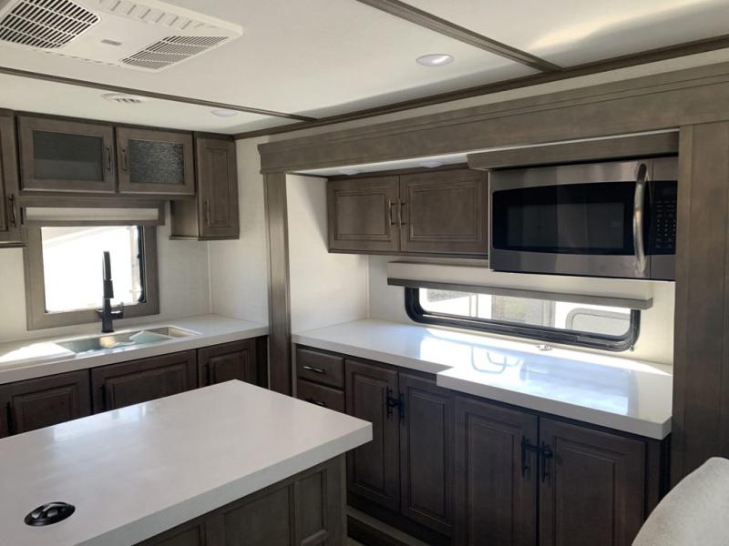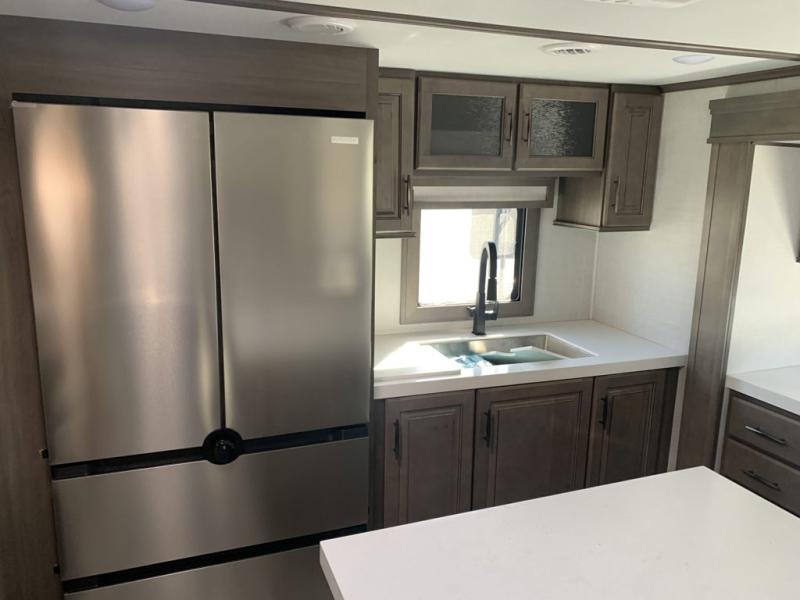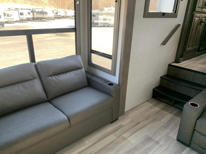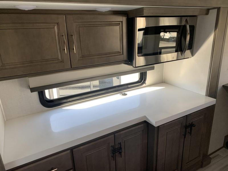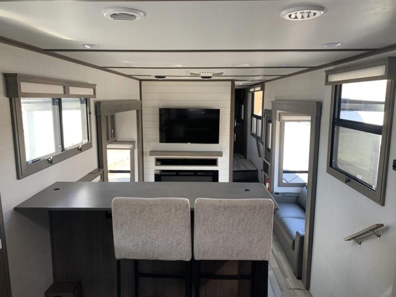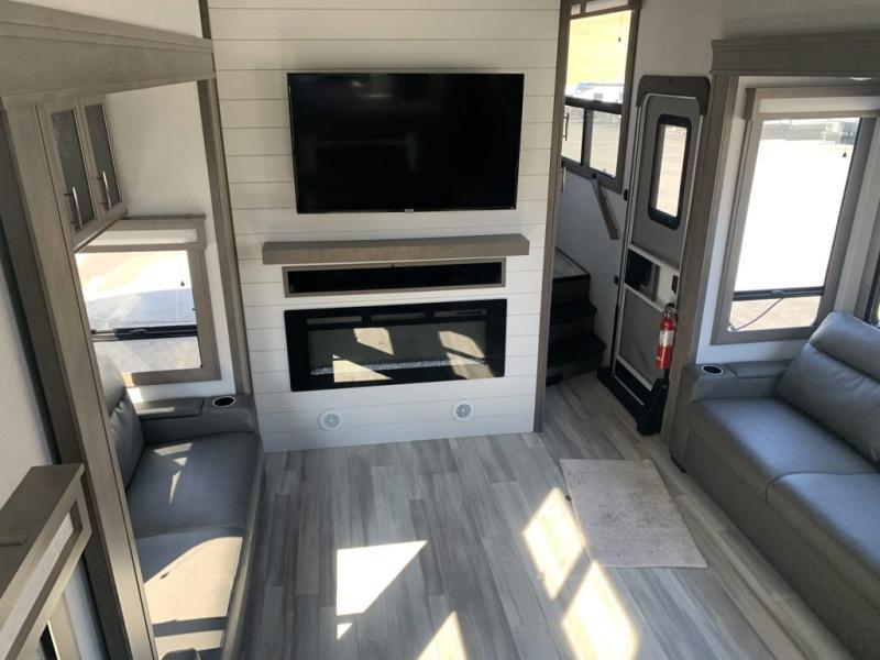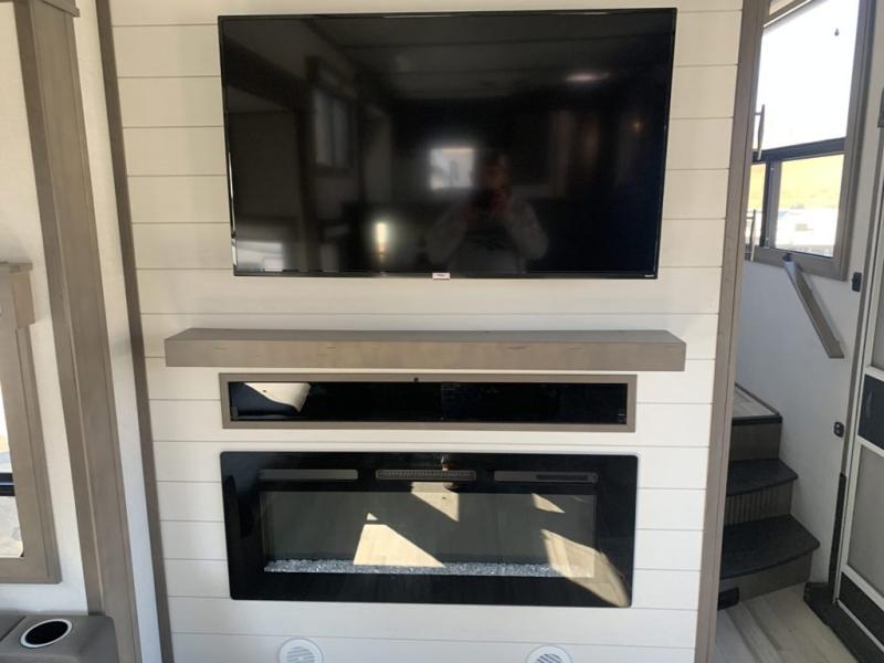 Enjoy each and every vacation, month-long trips, or even extended stays at an RV park in this spacious fifth wheel! The raise rear kitchen gives the cook plenty of room to whip up any type of meal using the stainless steel appliances including a 24" residential oven, an oversized pantry, and the raised bar top will provide you even more counter space on top of dining with two chairs that overlook the middle living area. Relaxing is made easy thanks to two tri-fold sofas and theatre seating while watching the big game on the LED Smart TV and enjoying the fireplace below. Dual sinks in the full bathroom allow two people to easily get ready at once, and the flip up teak seat in the shower is a nice convenience. At night, retire to your own queen bed which slides out to provide more floor space, and enjoy a show on the LED TV above the flip-top dresser once in bed.