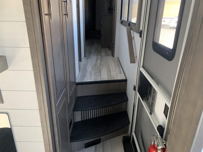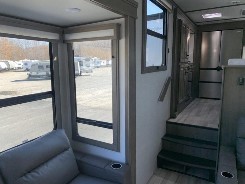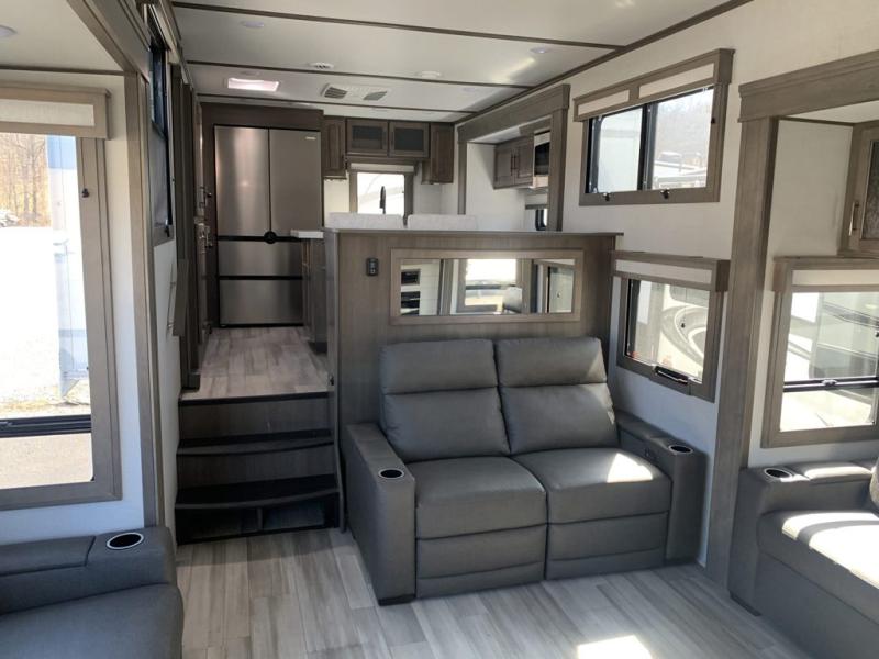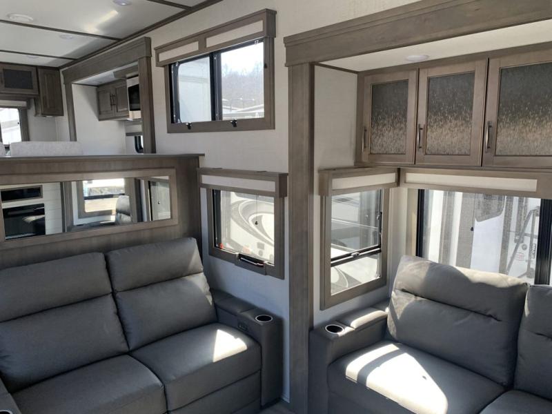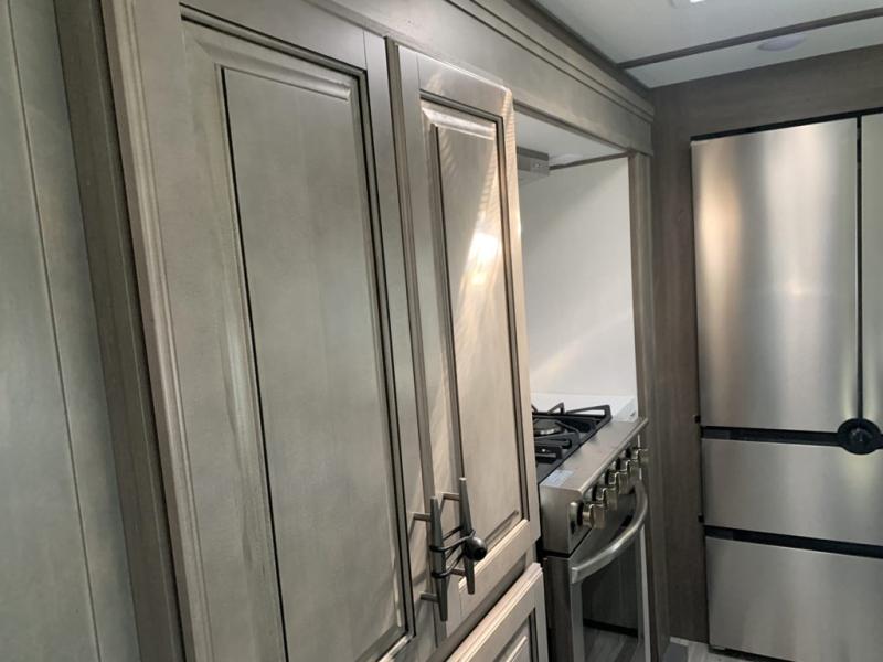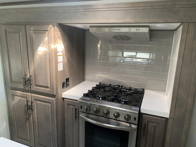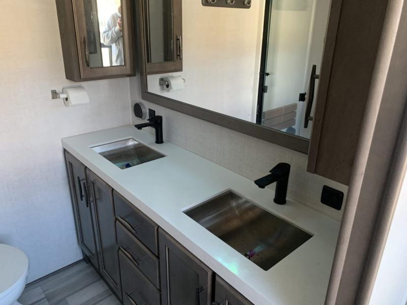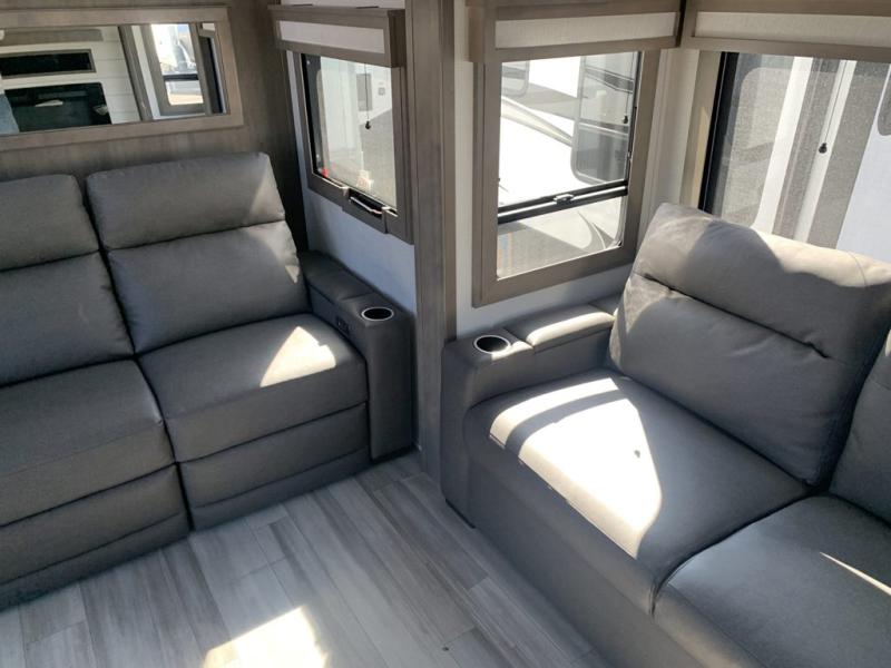 Enjoy each and every vacation, month-long trips, or even extended stays at an RV park in this spacious fifth wheel! The raise rear kitchen gives the cook plenty of room to whip up any type of meal using the stainless steel appliances including a 24" residential oven, an oversized pantry, and the raised bar top will provide you even more counter space on top of dining with two chairs that overlook the middle living area. Relaxing is made easy thanks to two tri-fold sofas and theatre seating while watching the big game on the LED Smart TV and enjoying the fireplace below. Dual sinks in the full bathroom allow two people to easily get ready at once, and the flip up teak seat in the shower is a nice convenience. At night, retire to your own queen bed which slides out to provide more floor space, and enjoy a show on the LED TV above the flip-top dresser once in bed.