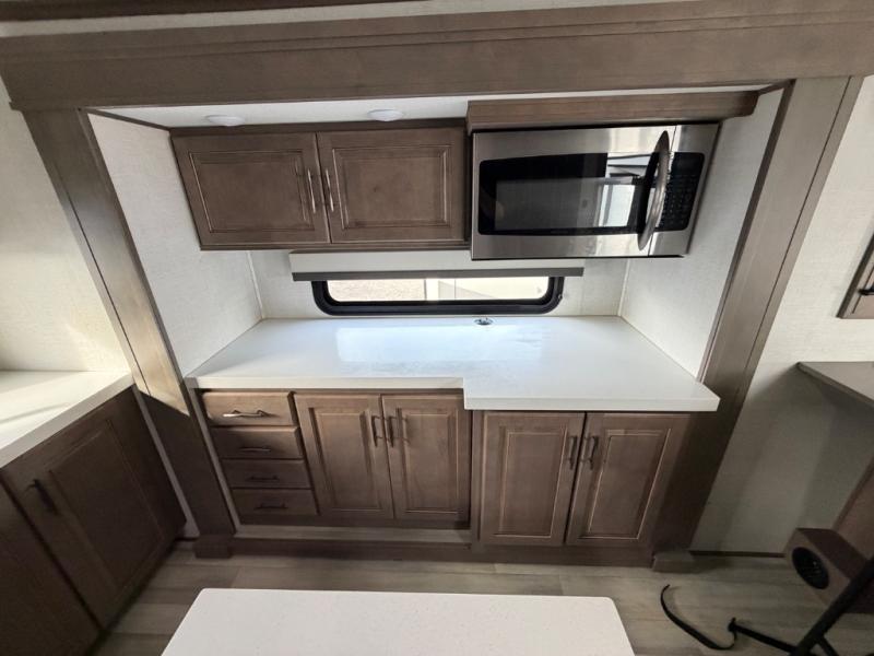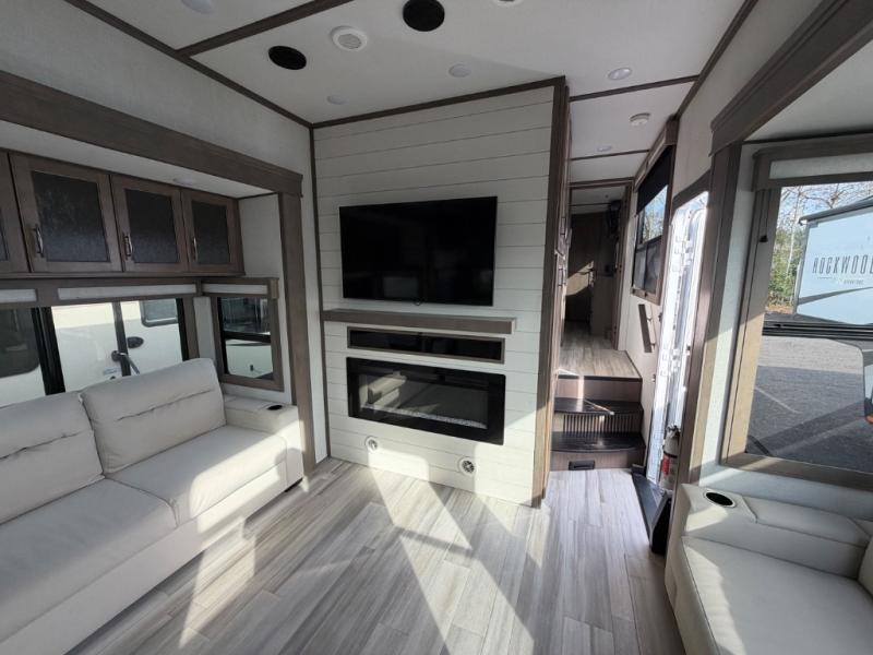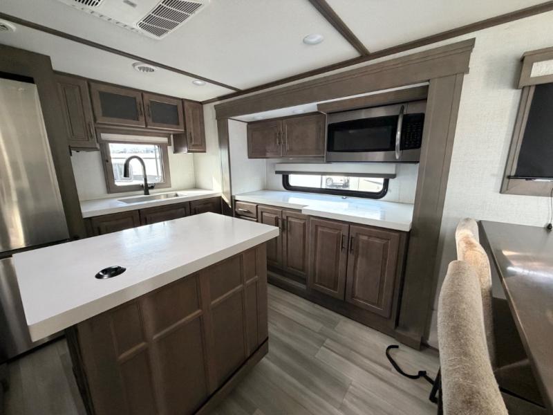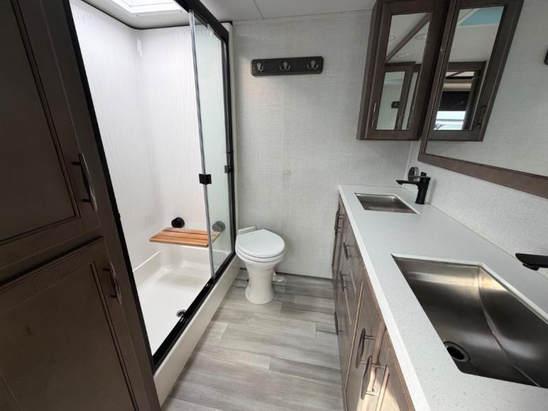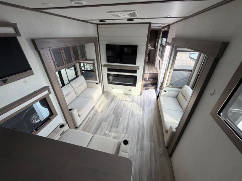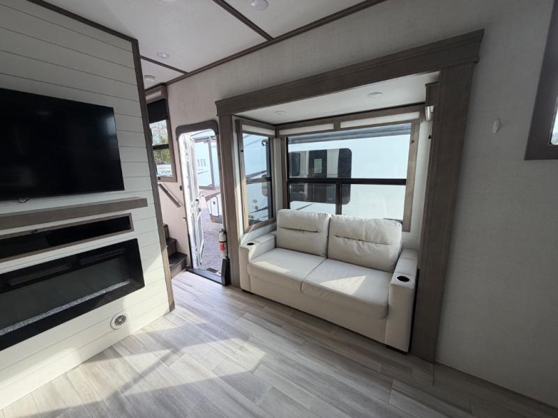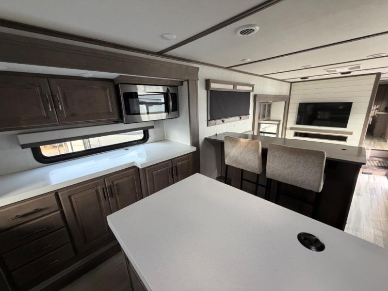 Enjoy each and every vacation, month-long trips, or even extended stays at an RV park in this spacious fifth wheel! The raise rear kitchen gives the cook plenty of room to whip up any type of meal using the stainless steel appliances including a 24" residential oven, an oversized pantry, and the raised bar top will provide you even more counter space on top of dining with two chairs that overlook the middle living area. Relaxing is made easy thanks to two tri-fold sofas and theatre seating while watching the big game on the LED Smart TV and enjoying the fireplace below. Dual sinks in the full bathroom allow two people to easily get ready at once, and the flip up teak seat in the shower is a nice convenience. At night, retire to your own queen bed which slides out to provide more floor space, and enjoy a show on the LED TV above the flip-top dresser once in bed.