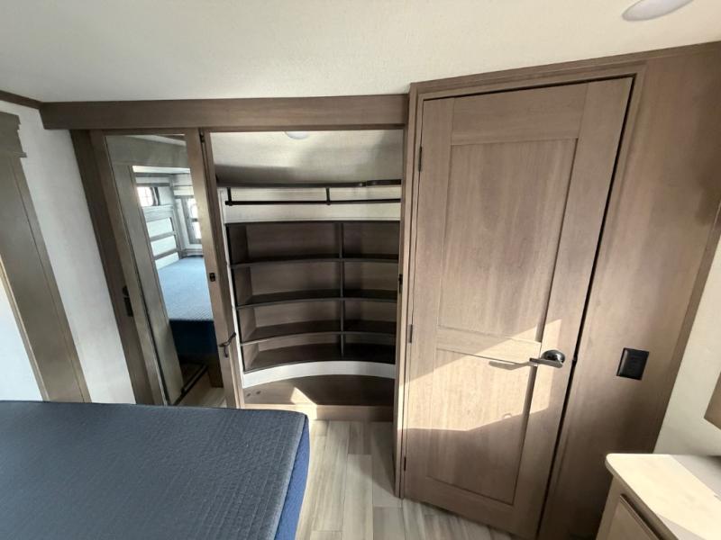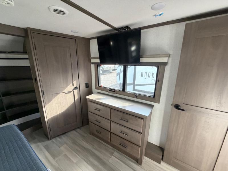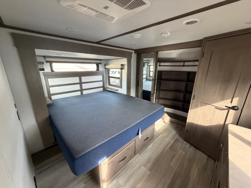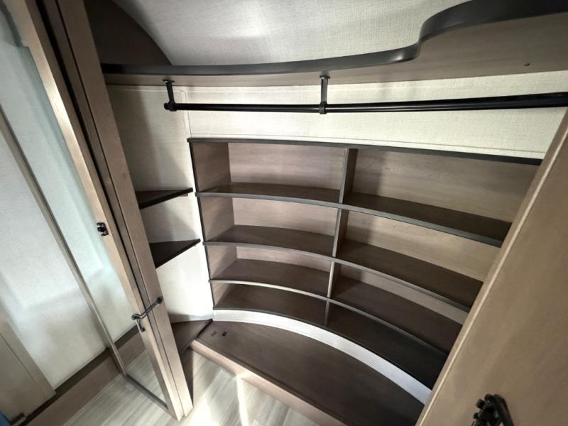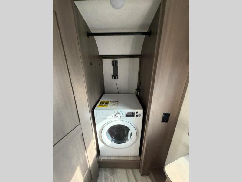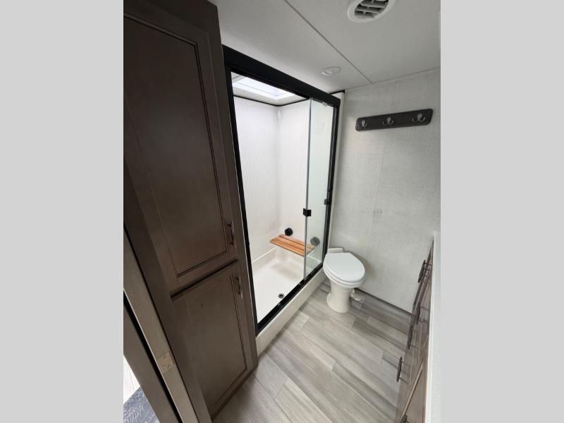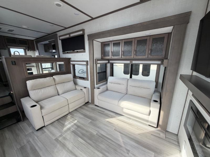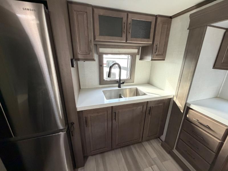Enjoy each and every vacation, month-long trips, or even extended stays at an RV park in this spacious fifth wheel! The raise rear kitchen gives the cook plenty of room to whip up any type of meal using the stainless steel appliances including a 24" residential oven, an oversized pantry, and the raised bar top will provide you even more counter space on top of dining with two chairs that overlook the middle living area. Relaxing is made easy thanks to two tri-fold sofas and theatre seating while watching the big game on the LED Smart TV and enjoying the fireplace below. Dual sinks in the full bathroom allow two people to easily get ready at once, and the flip up teak seat in the shower is a nice convenience. At night, retire to your own queen bed which slides out to provide more floor space, and enjoy a show on the LED TV above the flip-top dresser once in bed.
