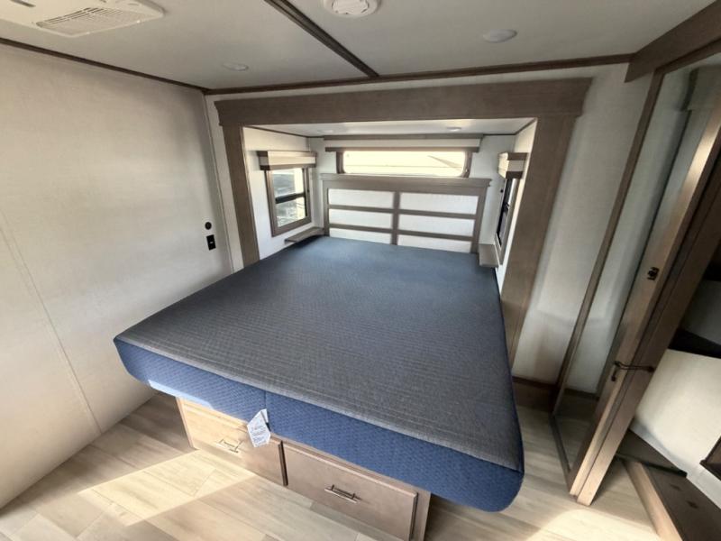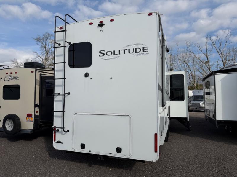 Each Solitude fifth wheel by Grand Design features a 101" wide-body construction, heavy duty 7,000 lb. axles, frameless tinted windows, and high-gloss gel coat sidewalls. You can camp year around thanks to the Weather-Tek Package that includes a 35K BTU high-capacity furnace, an all-in-one enclosed and heated utility center, and a fully enclosed underbelly with heated tanks and storage. Inside, you'll love the premium roller shades, hardwood cabinet doors, solid surface countertops and sinks, plus residential finishes throughout to make you truly feel at home. Each model also includes a MORryde CRE3000 suspension system, self adjusting brakes, and a MORryde pin box that will provide smooth towing from home to campground. Affordable luxury is possible with the Solitude fifth wheels; choose yours today!
