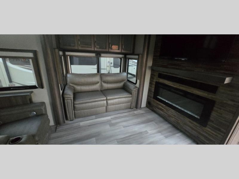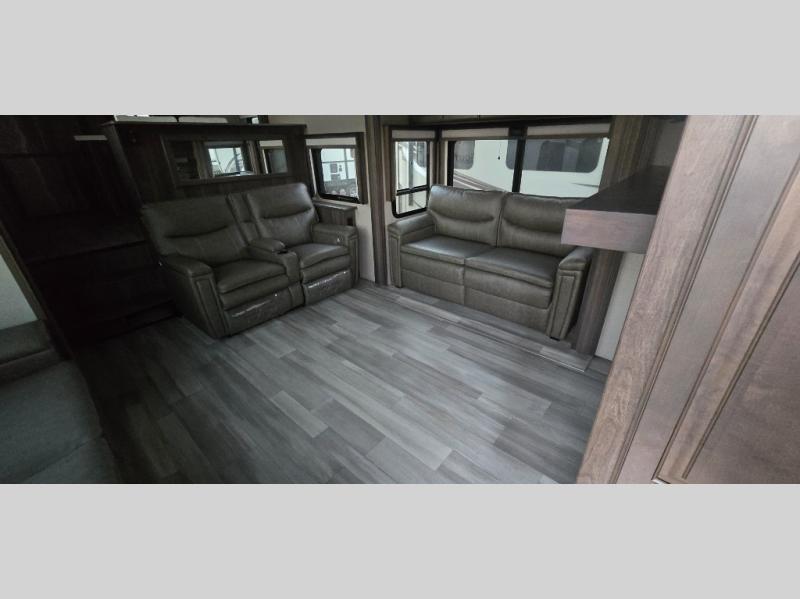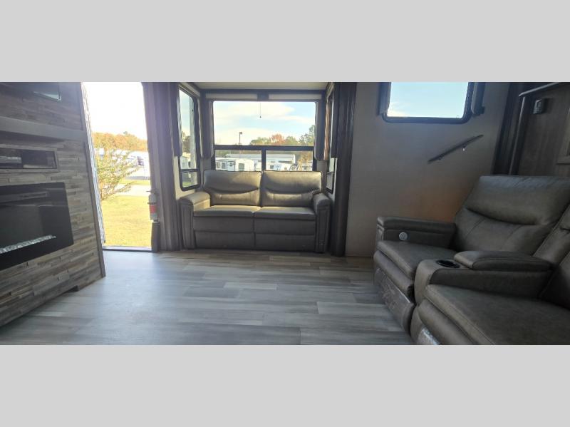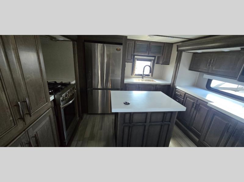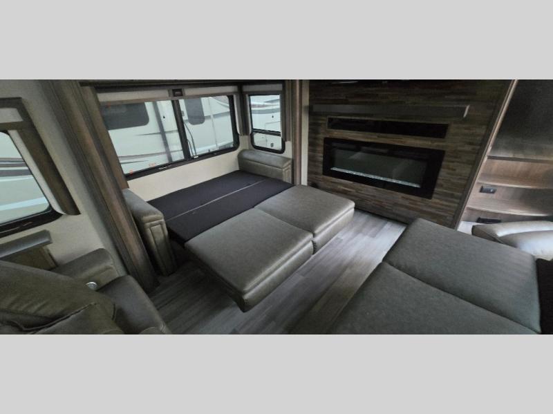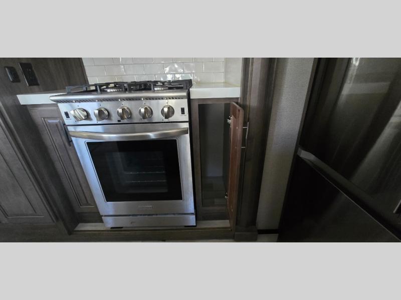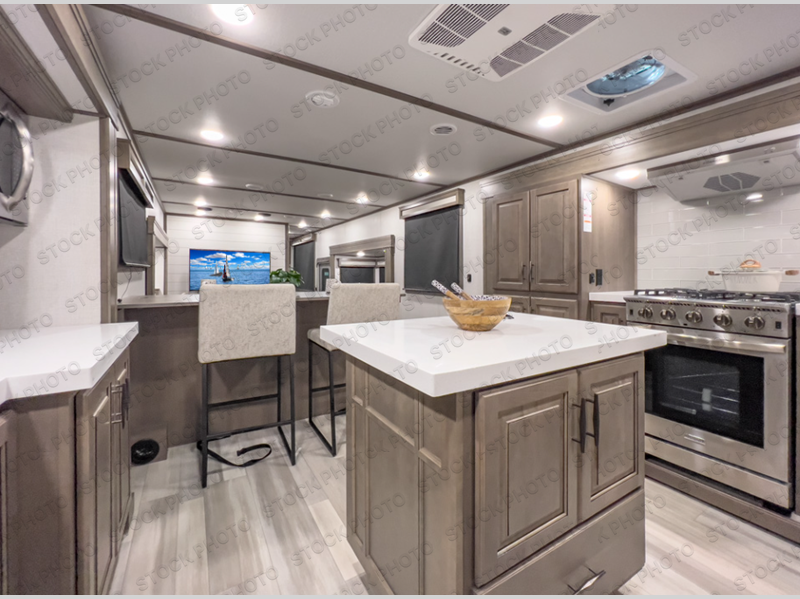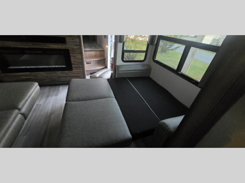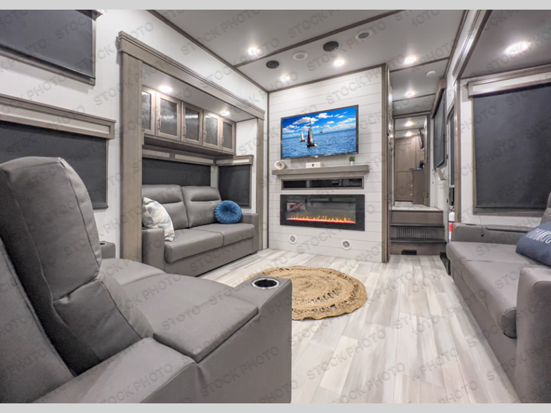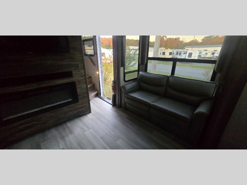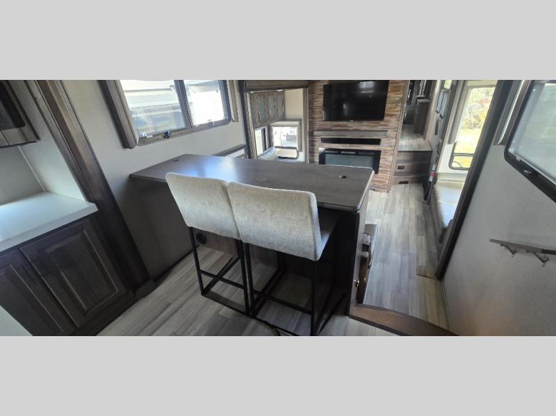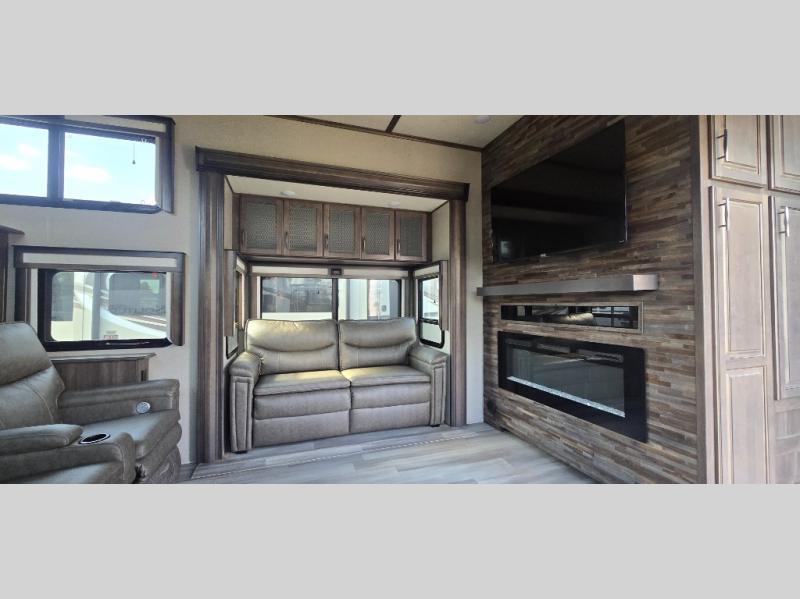 Enjoy each and every vacation, month-long trip or even extended stay at an RV park in this fifth wheel that is spacious from the front to the rear! The raised kitchen gives the cook plenty of room to whip up any type of meal using the stainless steel appliances including the 24" residential oven, the oversized pantry and the raised bar top will provide you even more counter space on top of dining with two chairs that overlook the middle living area. Relaxing is made easy with the two tri-fold sofas and theatre seating while watching the big game on the LED Smart TV and enjoying the fireplace below. Dual sinks in the full bathroom allow two people to easily get ready at once, and the seat in the shower is a nice convenience. At night, retire to your own queen bed slide after sitting on the pull-out ottoman to take your shoes off, and enjoy a show on the LED TV above the flip-top dresser, or wash some linens in the closet with a washer/dryer if you added that option.