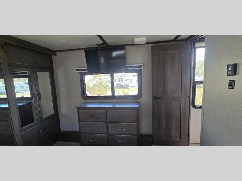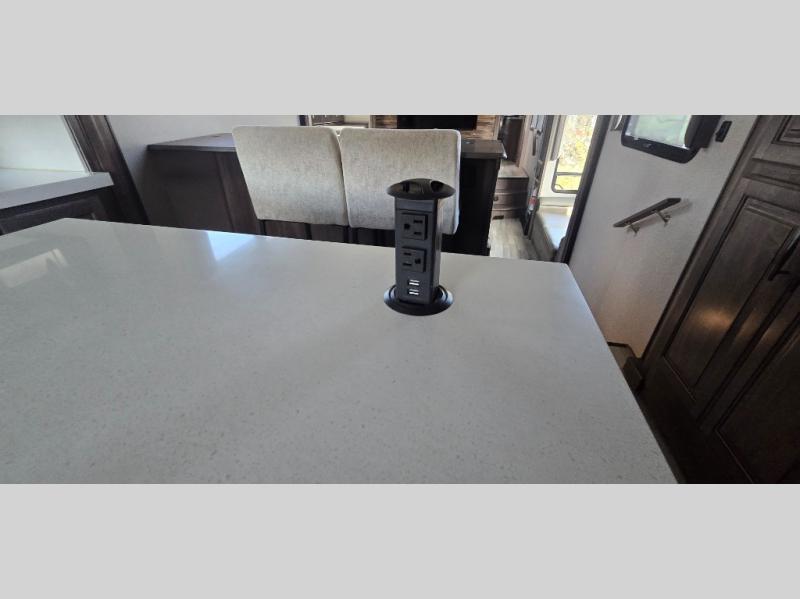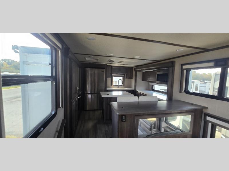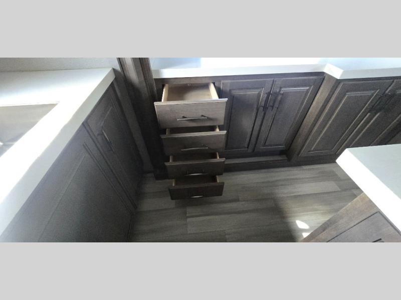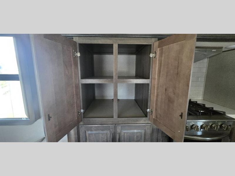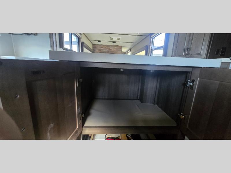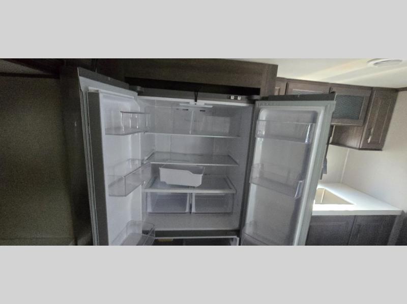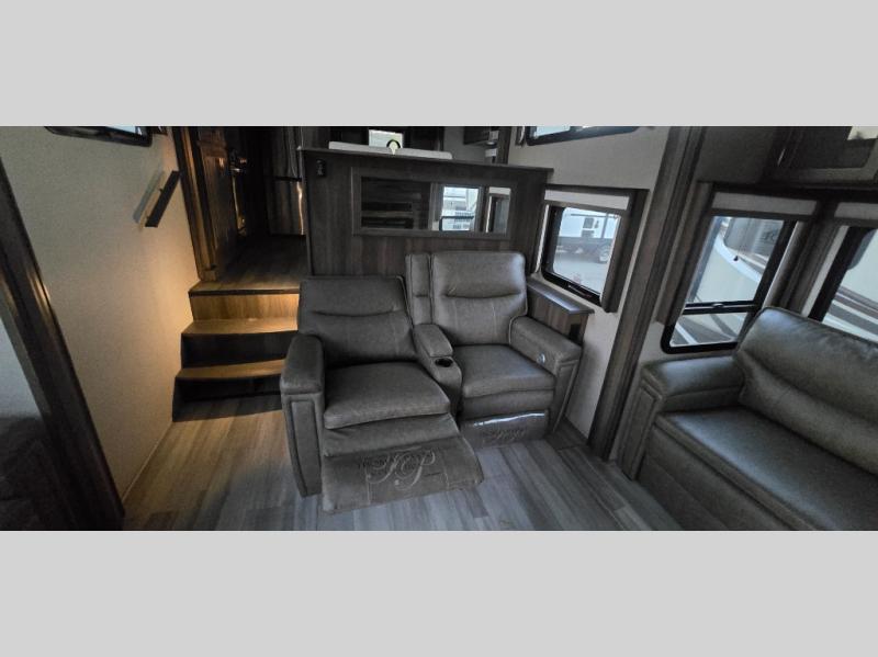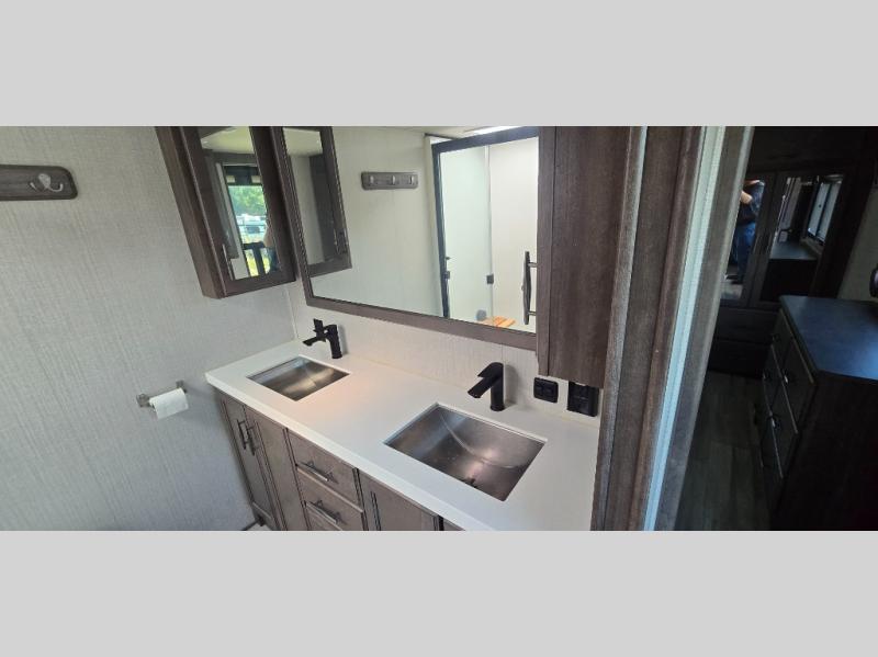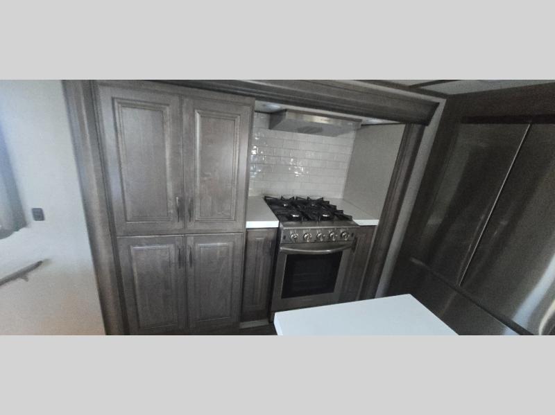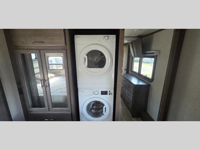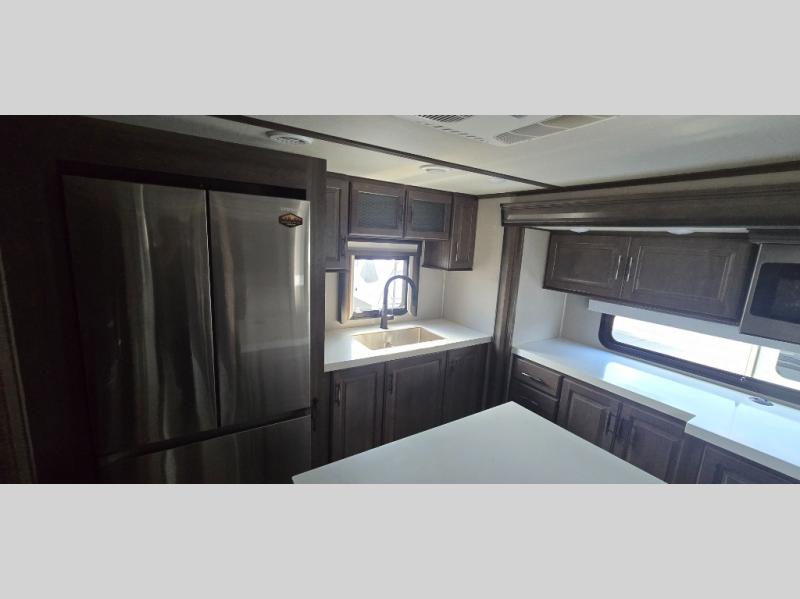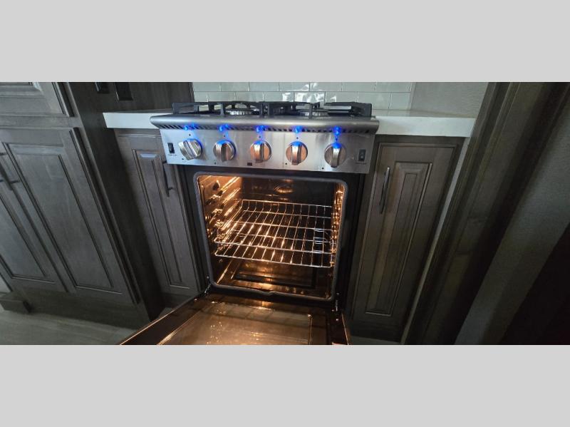 Enjoy each and every vacation, month-long trip or even extended stay at an RV park in this fifth wheel that is spacious from the front to the rear! The raised kitchen gives the cook plenty of room to whip up any type of meal using the stainless steel appliances including the 24" residential oven, the oversized pantry and the raised bar top will provide you even more counter space on top of dining with two chairs that overlook the middle living area. Relaxing is made easy with the two tri-fold sofas and theatre seating while watching the big game on the LED Smart TV and enjoying the fireplace below. Dual sinks in the full bathroom allow two people to easily get ready at once, and the seat in the shower is a nice convenience. At night, retire to your own queen bed slide after sitting on the pull-out ottoman to take your shoes off, and enjoy a show on the LED TV above the flip-top dresser, or wash some linens in the closet with a washer/dryer if you added that option.