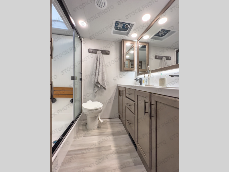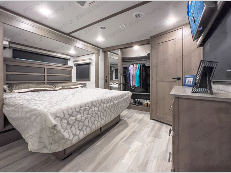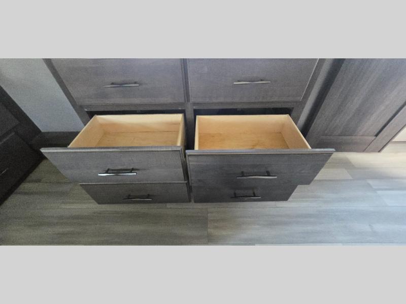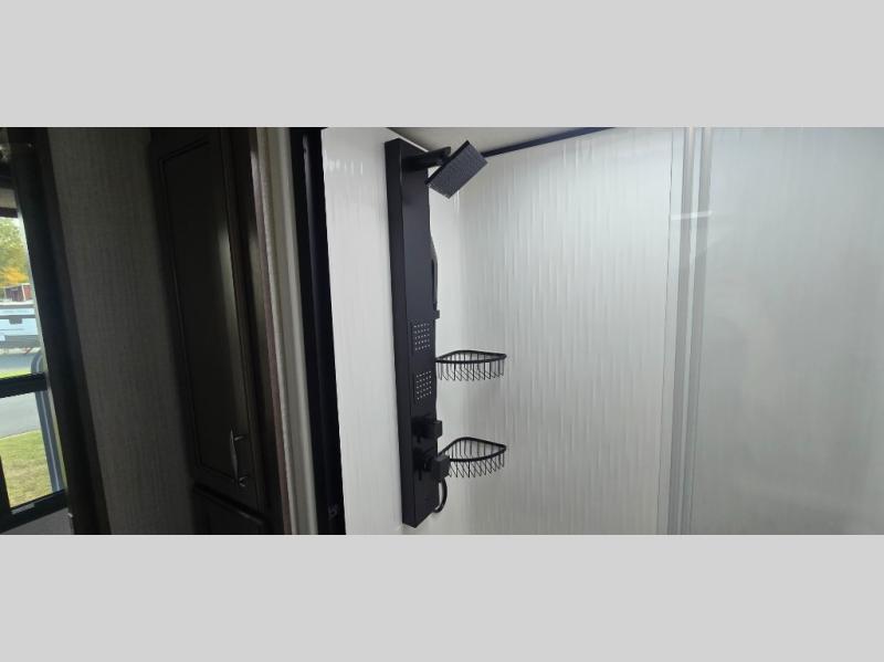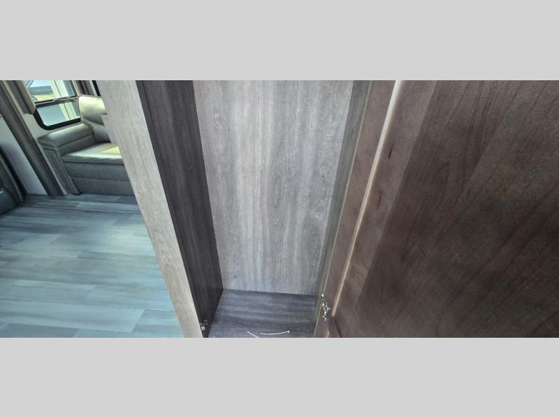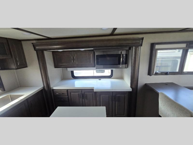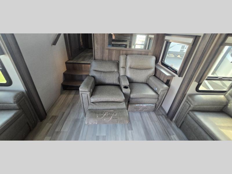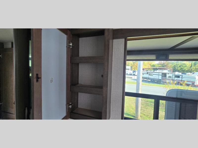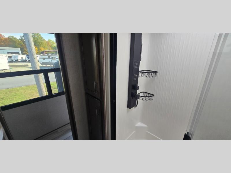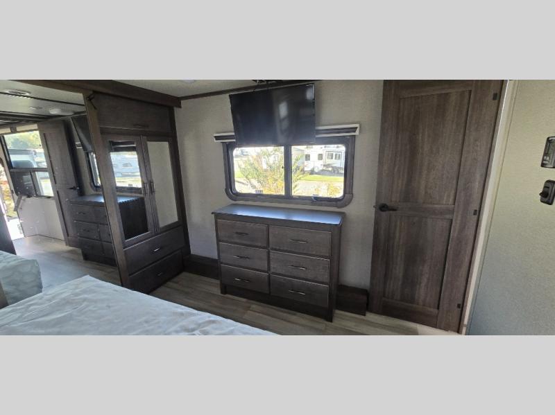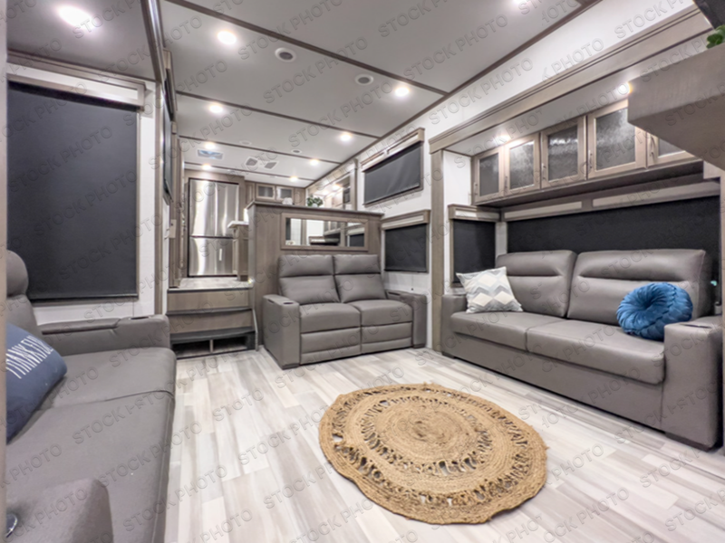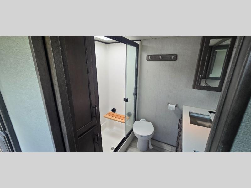 Enjoy each and every vacation, month-long trip or even extended stay at an RV park in this fifth wheel that is spacious from the front to the rear! The raised kitchen gives the cook plenty of room to whip up any type of meal using the stainless steel appliances including the 24" residential oven, the oversized pantry and the raised bar top will provide you even more counter space on top of dining with two chairs that overlook the middle living area. Relaxing is made easy with the two tri-fold sofas and theatre seating while watching the big game on the LED Smart TV and enjoying the fireplace below. Dual sinks in the full bathroom allow two people to easily get ready at once, and the seat in the shower is a nice convenience. At night, retire to your own queen bed slide after sitting on the pull-out ottoman to take your shoes off, and enjoy a show on the LED TV above the flip-top dresser, or wash some linens in the closet with a washer/dryer if you added that option.