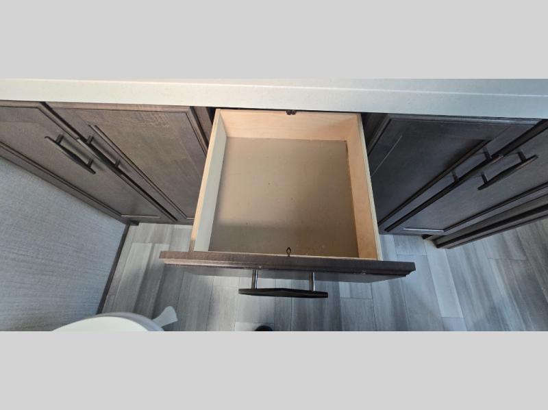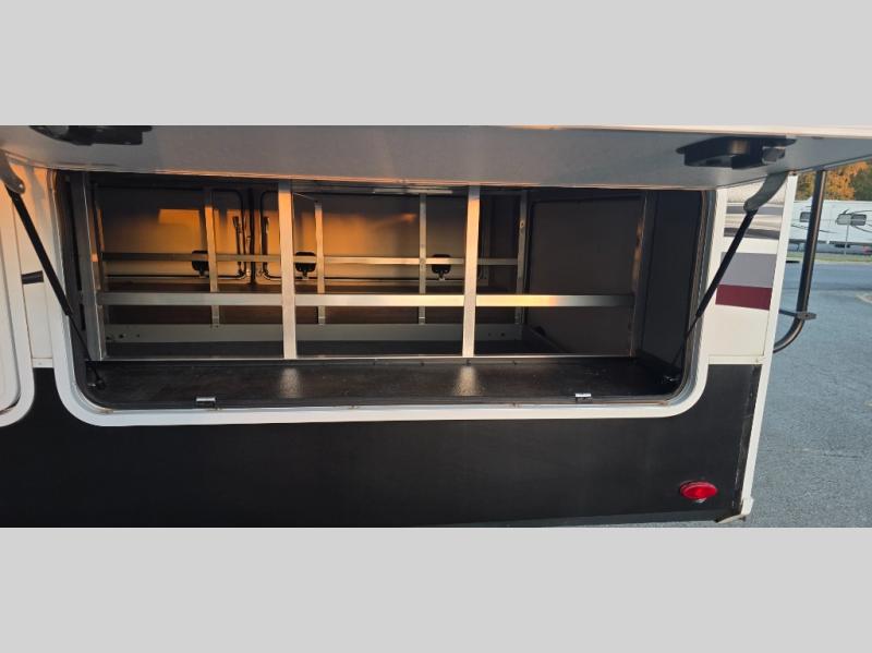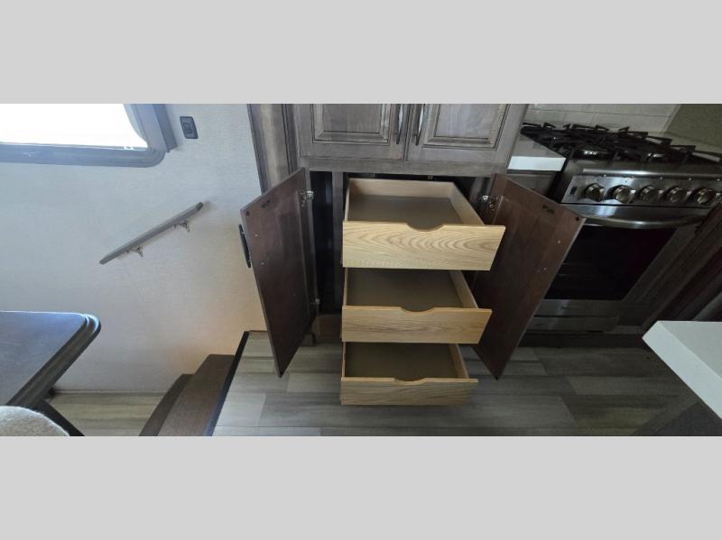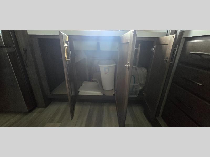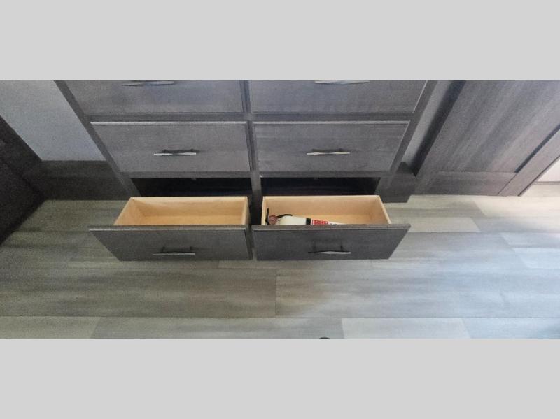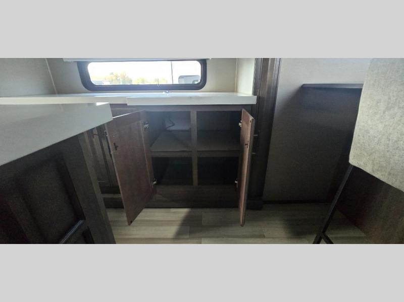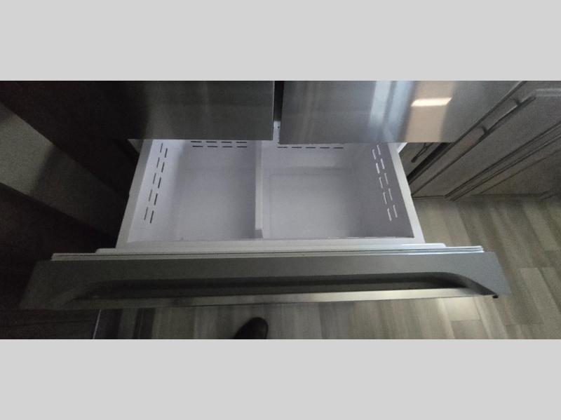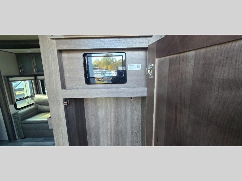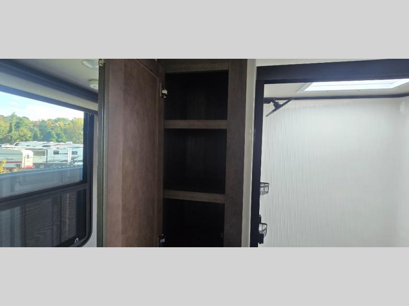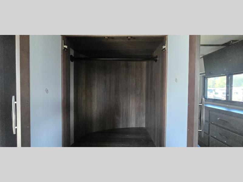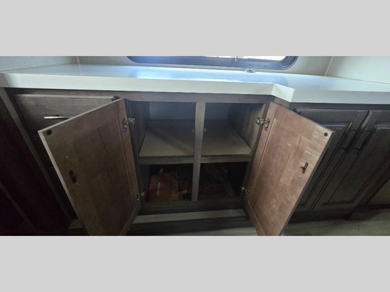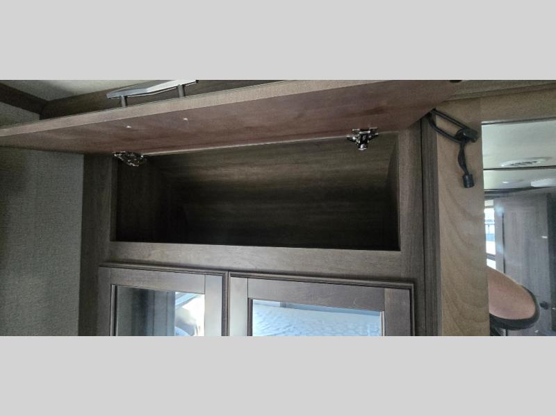 Enjoy each and every vacation, month-long trip or even extended stay at an RV park in this fifth wheel that is spacious from the front to the rear! The raised kitchen gives the cook plenty of room to whip up any type of meal using the stainless steel appliances including the 24" residential oven, the oversized pantry and the raised bar top will provide you even more counter space on top of dining with two chairs that overlook the middle living area. Relaxing is made easy with the two tri-fold sofas and theatre seating while watching the big game on the LED Smart TV and enjoying the fireplace below. Dual sinks in the full bathroom allow two people to easily get ready at once, and the seat in the shower is a nice convenience. At night, retire to your own queen bed slide after sitting on the pull-out ottoman to take your shoes off, and enjoy a show on the LED TV above the flip-top dresser, or wash some linens in the closet with a washer/dryer if you added that option.